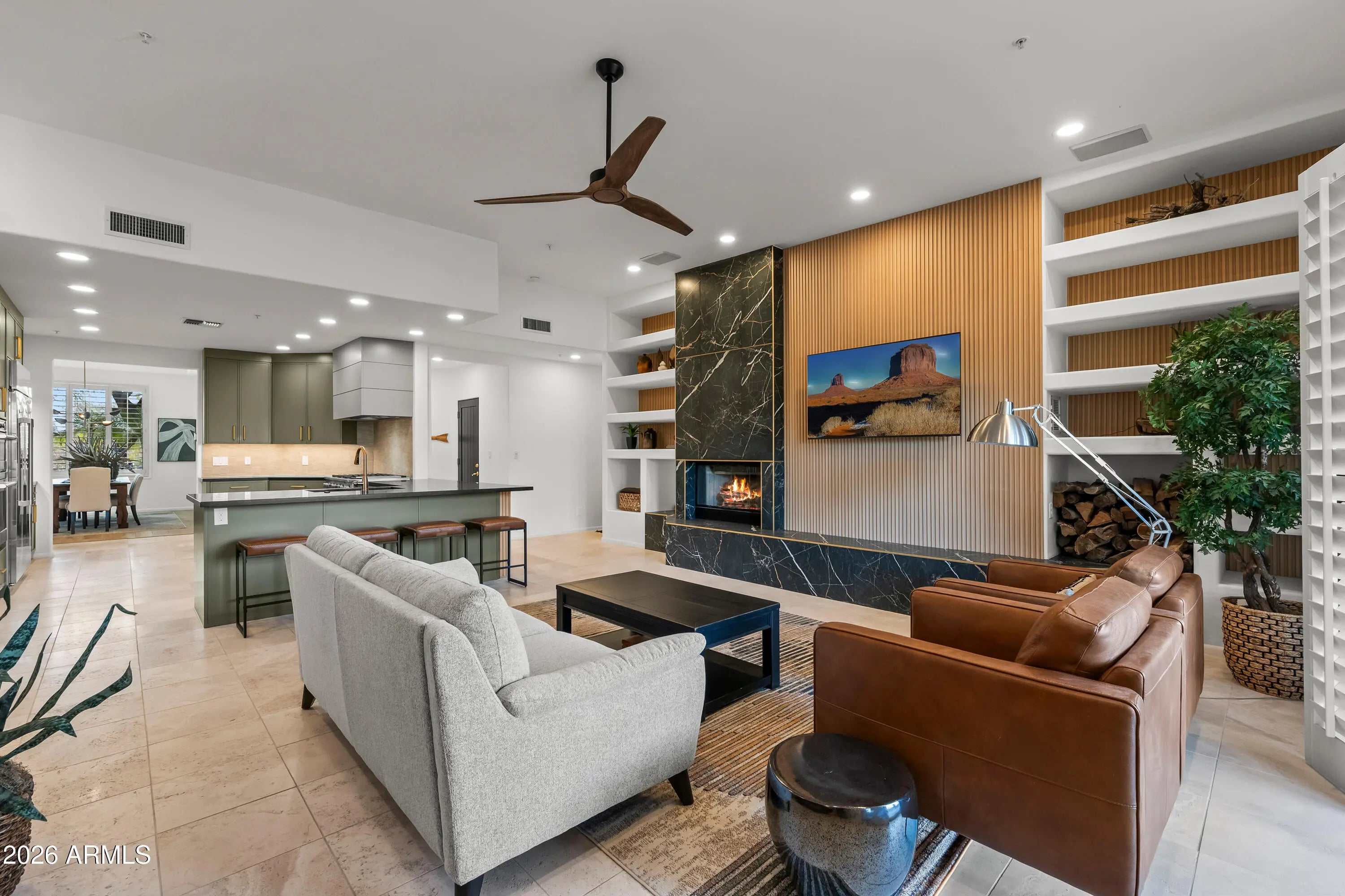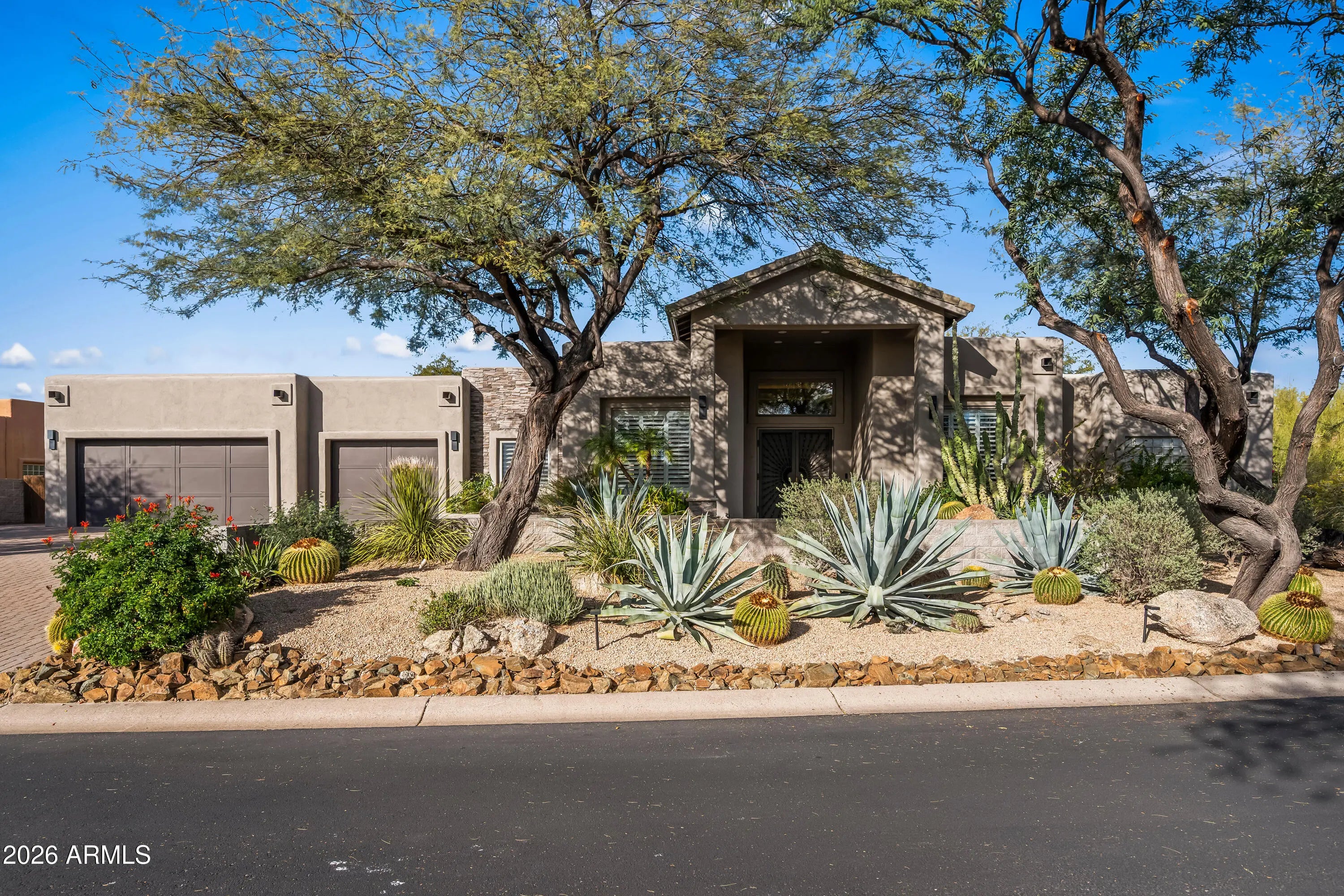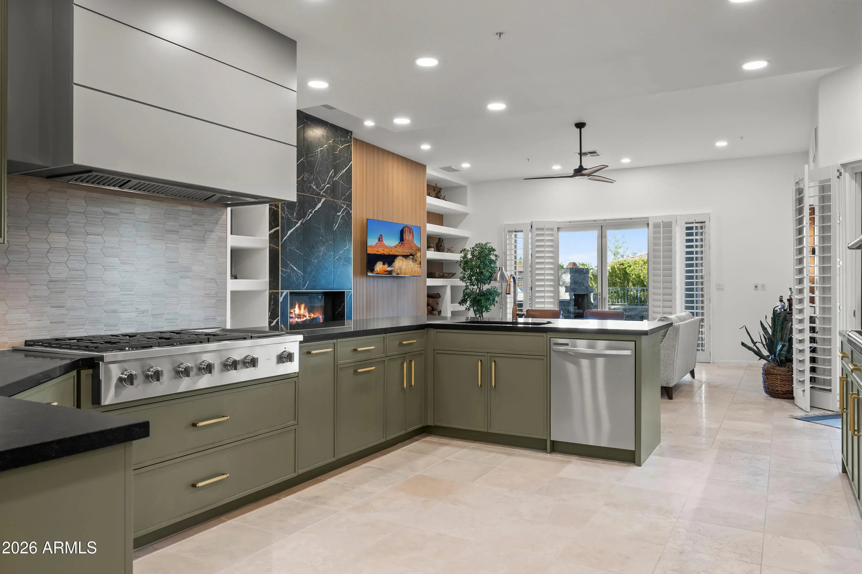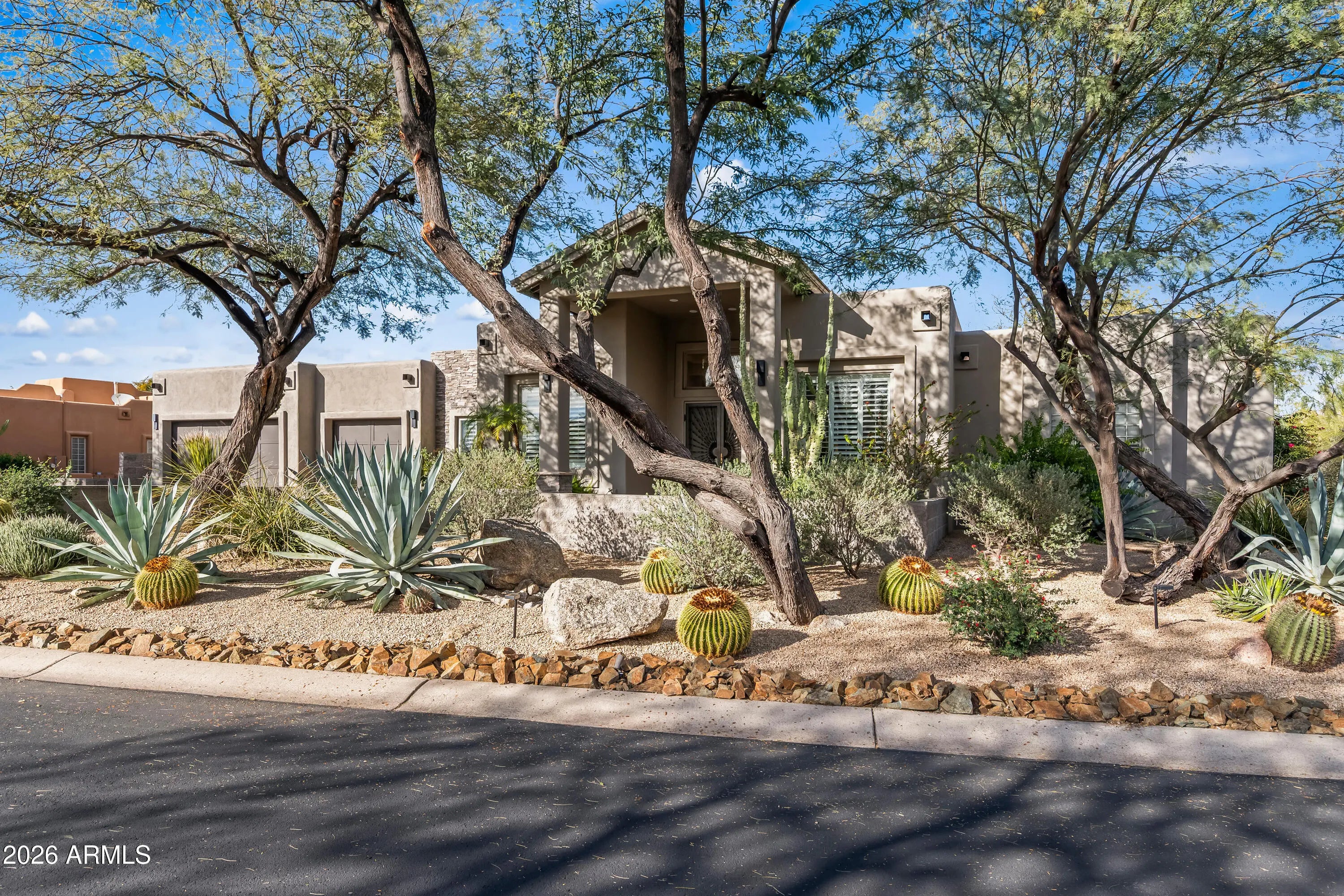 Tucked at the end of a quiet cul-de-sac in the gated enclave of Candlewood Estates, this beautifully renovated single-level home blends contemporary desert design with the natural beauty and elevated lifestyle of Troon North. With its mature shade trees, wide paver driveway, and inviting covered entry, the home makes an immediate impression. Inside, expansive living spaces filled with natural light create a warm, welcoming environment for everyday comfort and ease. The fully renovated kitchen and living room form the true heart of the home, showcasing a cohesive, modern desert aesthetic. The kitchen is striking in design yet functional, featuring custom cabinetry, granite countertops, a built-in 48'' refrigerator, a 48'' gas range, a custom beverage station with illuminated floating shel and a breakfast bar with seating for four. The kitchen flows seamlessly into the living room, where a custom-designed feature wall serves as the centerpiece, showcasing bold black marble-look tile with striking white veining, refined brass inlay accents, and a vertical wood-slat detail that adds warmth and textural contrast. The outdoor living space continues the home's thoughtful design, offering a private retreat for everyday enjoyment. Expansive covered patios off both the living room and primary suite provide shaded areas to relax, enjoy morning coffee, or unwind in the evenings, creating a setting that feels peaceful and secluded. A built-in grill and outdoor fireplace anchor the backyard for year-round enjoyment. A tranquil koi pond provides a soothing focal point, while low-maintenance desert landscaping enhances the natural surroundings without added upkeep. With ample space to customize -- including room to add a pool or further expand the outdoor living footprint -- the backyard offers both immediate enjoyment and future flexibility. Set off from the main living areas, the primary suite offers a quiet sense of separation and privacy. The space features new carpet, dual closets (his and hers plus an additional third closet), separate vanities with granite countertops and soft-close cabinetry, a freestanding soaking tub, and a tiled walk-in shower. On the opposite wing of the home, bedrooms two and three both feature walk-in closets and share a full hall bath. The fourth bedroom is currently configured as an office or den, providing an ideal space for remote work or a quiet flex room. Additional features include fiber internet and a spacious three-car garage with epoxy floors, a separate storage room, built-in cabinetry, and a 220V EV charging connection, with ample room to accommodate a full-size SUV. Living in Troon North offers a setting defined by rolling desert hills, distinctive custom homes, and access to some of North Scottsdale's most celebrated golf and outdoor recreation. From hiking at Pinnacle Peak to tee times at Troon North, Grayhawk, TPC Scottsdale, and other renowned courses throughout the area, the lifestyle here is active, scenic, and effortlessly refined. Residents also enjoy nearby pickleball courts, upscale dining, and the quiet luxury that defines this sought-after community -- all within a secure gated enclave. Whether as a full-time residence or a seasonal Scottsdale retreat, this home offers comfort, privacy, and an elevated approach to everyday desert living.