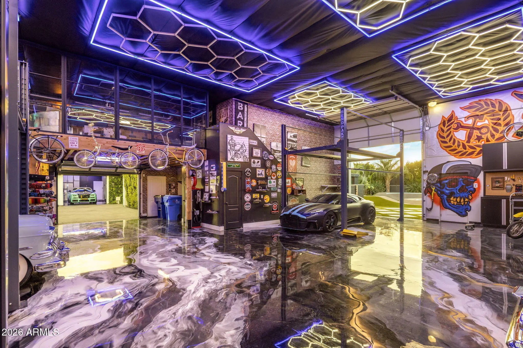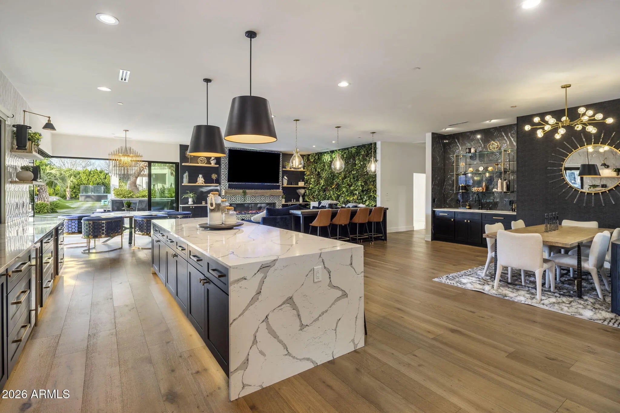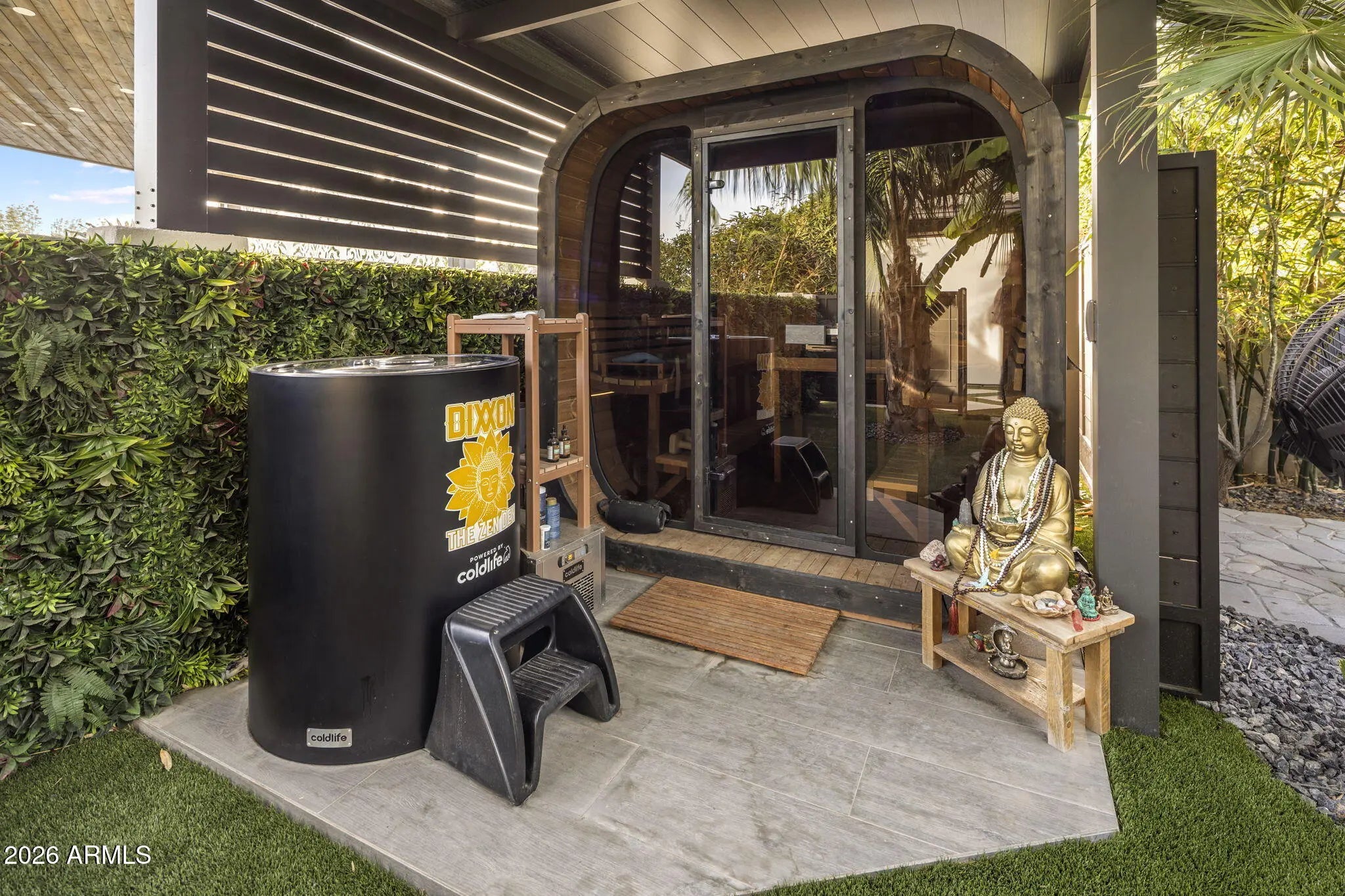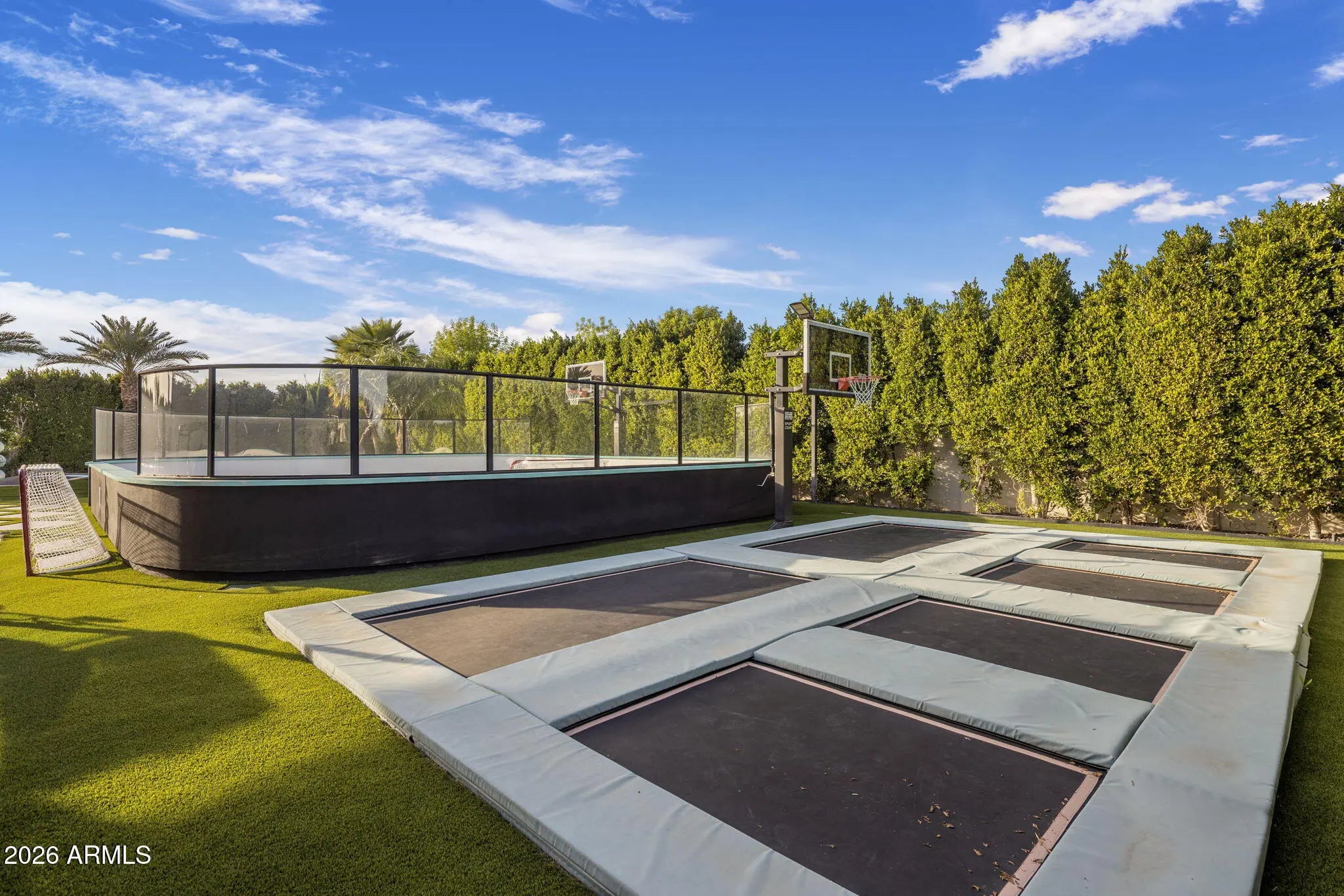 Tucked behind lush, ultra private grounds in the heart of Gilbert, this one of a kind estate delivers an unmatched blend of luxury, creativity, and resort style living. Designed as a true experience driven property, every detail has been thoughtfully curated to elevate both everyday living and large scale entertaining. The 5,340sf main residence offers 4 bedrooms, 5.5 bathrooms, a gym, and a pool bath complemented by a detached ~740sf guest casita with 1 bedroom and 1 bathroom. Indoor and outdoor spaces flow seamlessly into an extraordinary setting that rivals high end resorts. A showstopping pool anchors the backyard, complete with a 60 ft corkscrew waterslide winding through a custom rock waterfall grotto. The swim up grotto lounge features built in seating, bar cave, TV area, WiFi.. and dynamic lighting, creating a truly unforgettable experience. The grounds offer a rare level of recreation and entertainment with a professional pump track, multi sport court with stadium lighting, and a putting green with custom bunker. Multiple gathering areas are enhanced by custom fire features and a fully integrated sound system that extends throughout the property and into the pool. Wellness and lifestyle amenities include a hybrid sauna, dual cold plunges, steam shower, and a private gym with ensuite bath. The 12-car garage is finished with commercial grade epoxy flooring and accompanied by additional RV or bus parking with full power and plumbing hookups. Surrounded by a mature 20 to 25 foot ficus hedge and curated landscaping with rare imported plant species, the property offers exceptional privacy and a true resort feel. Built by the founder of Dixxon Flannel Co. as a personal passion project, this home has been featured on HGTV, Fox News, and Channel 3 Phoenix. It also presents strong income potential with as a luxury short term rental. A rare opportunity to own a property that delivers on experience, design, and income potential all in one remarkable setting.