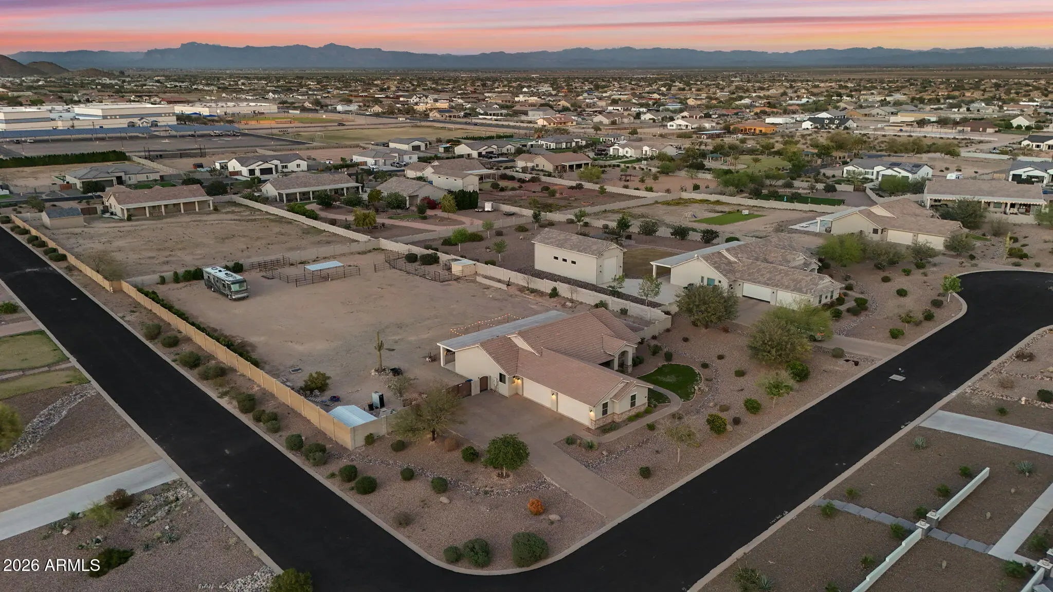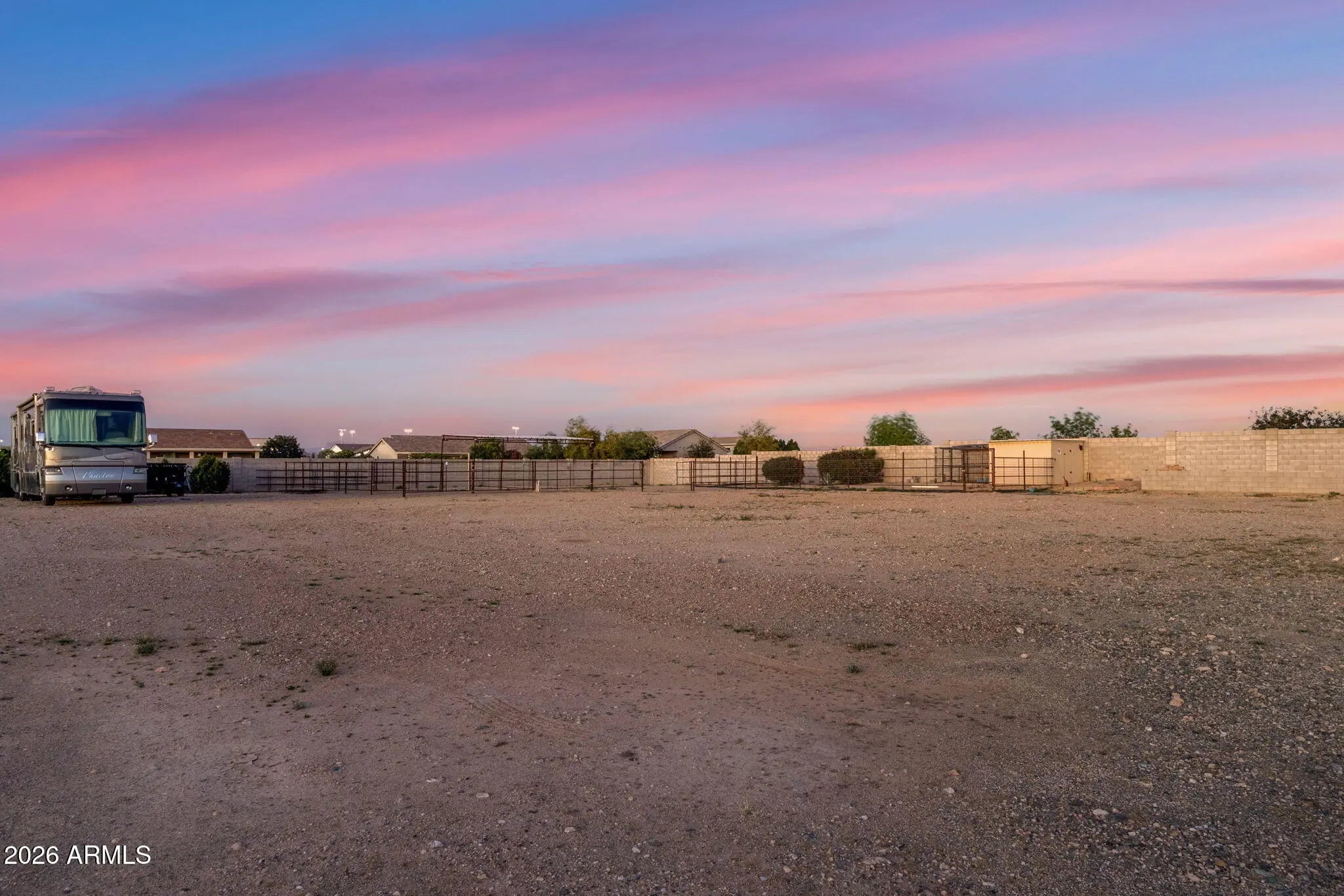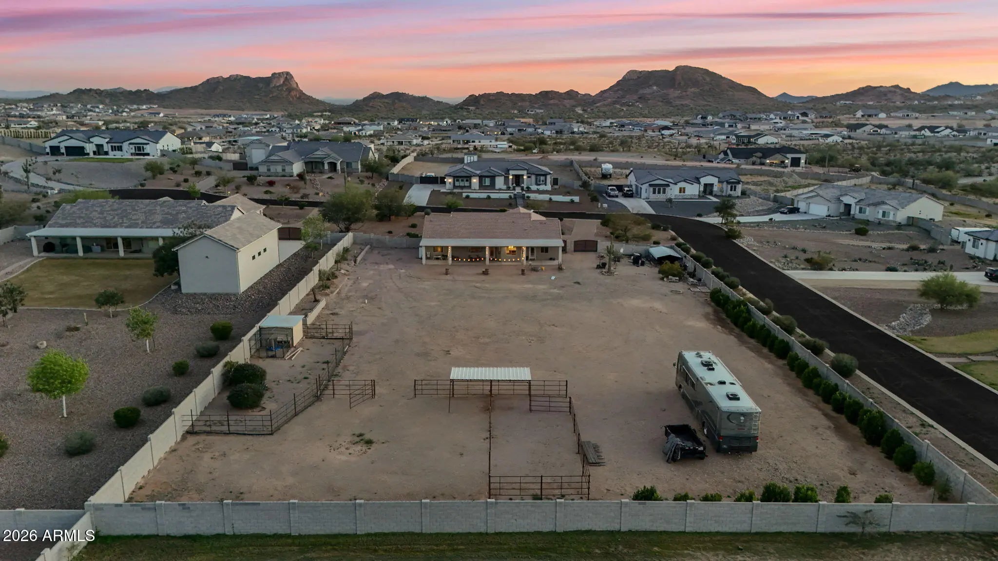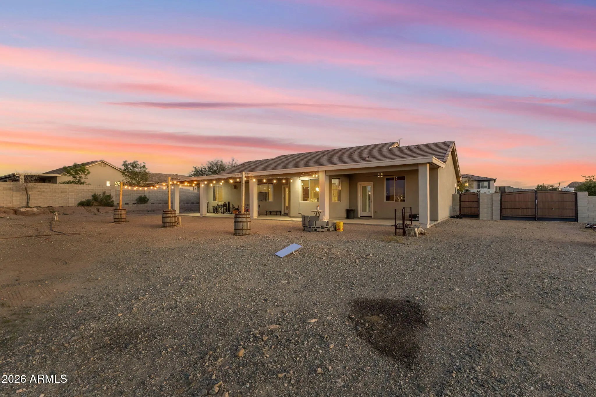 Welcome to a rare opportunity in a small, gated enclave of newer homes in San Tan Valley -- where space, privacy, and flexibility come together in a way that's hard to find. Built in 2019, this 2,328 square foot home offers 4 bedrooms, 2 baths, and a highly sought-after 4-car garage -- plus an RV gate and dedicated RV parking. Whether you need room for vehicles, toys, a workshop, or extra storage, this property delivers. Situated on an expansive 56,000 square foot lot (well over an acre), the possibilities here are truly exceptional. The lot is fully enclosed with a block wall for added privacy and security, and there's already a horse corral at the rear of the property -- perfect for equestrian enthusiasts or anyone wanting space to spread out. Inside, the home features a modern, open layout built for comfortable living and easy entertaining. The split floor plan offers privacy, while the generous living spaces create a welcoming environment for gatherings or quiet evenings at home. The backyard is currently a blank canvas -- giving you the freedom to design exactly what you want. Dreaming of a resort-style pool? Detached guest house? RV garage? Outdoor arena? Lush landscaping? With this much land, you don't have to choose -- you can create it. Homes in gated communities with this lot size, garage capacity, and flexibility rarely come to market. If you've been waiting for space without sacrificing newer construction, this is the one you need to see.