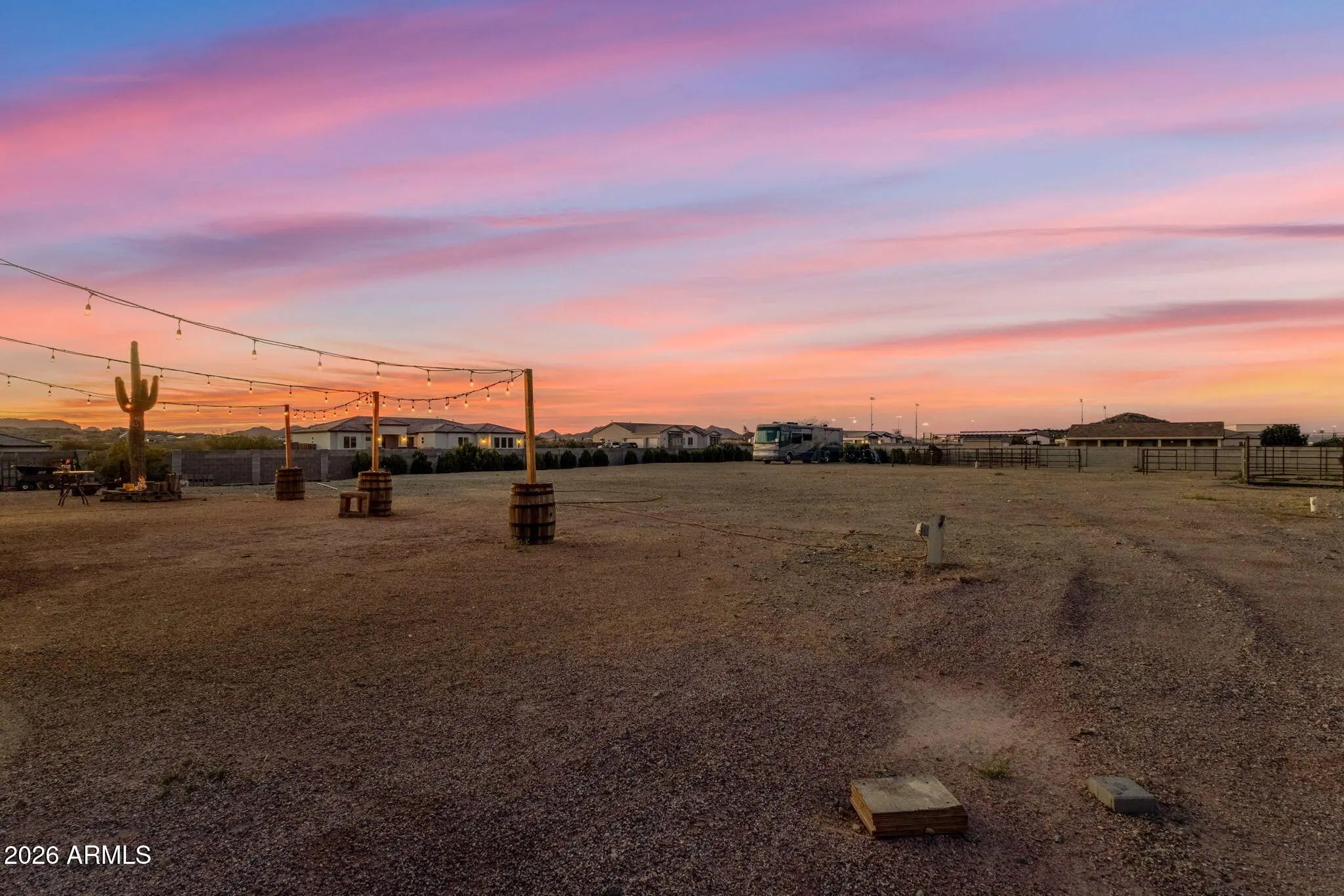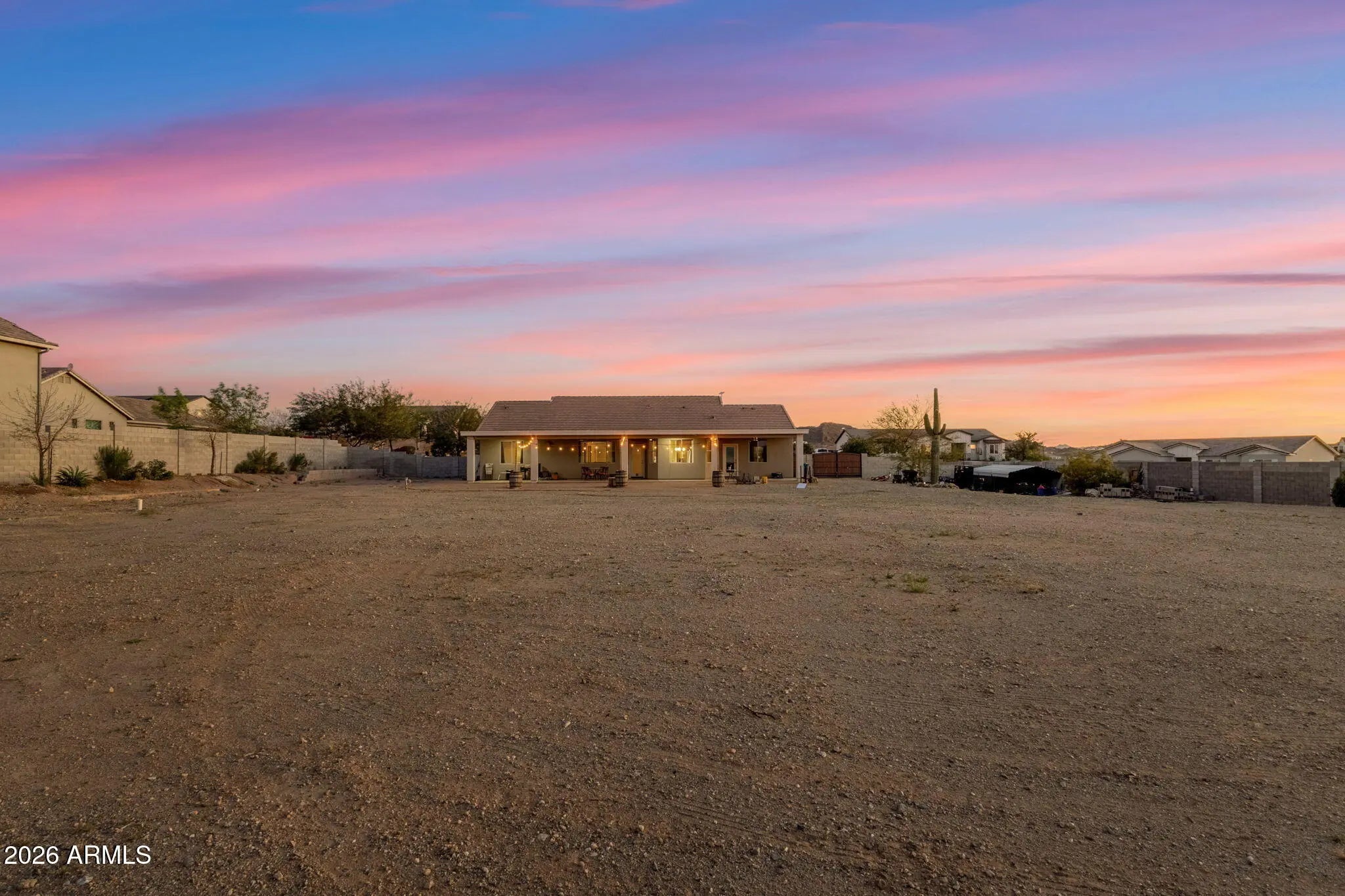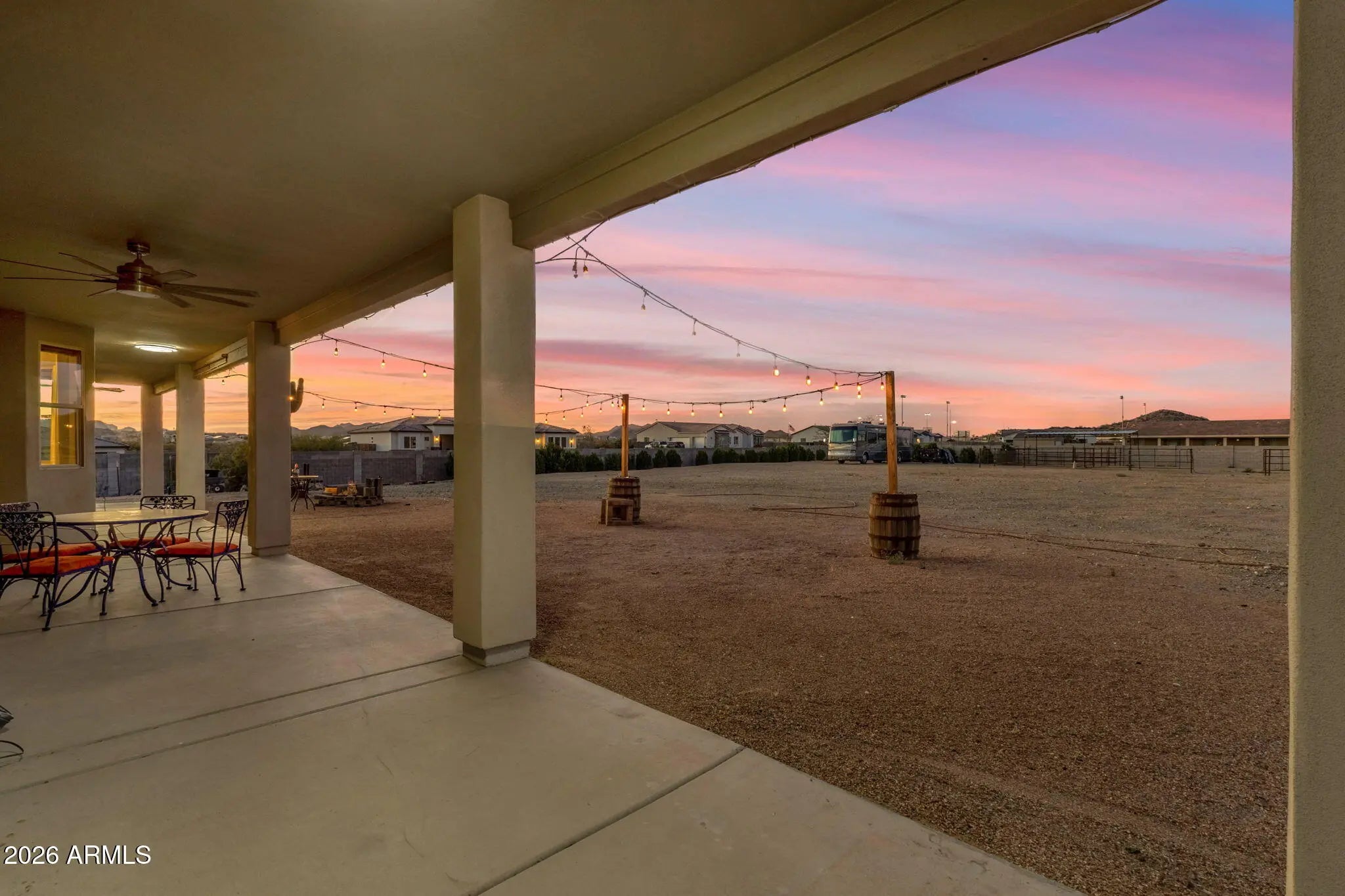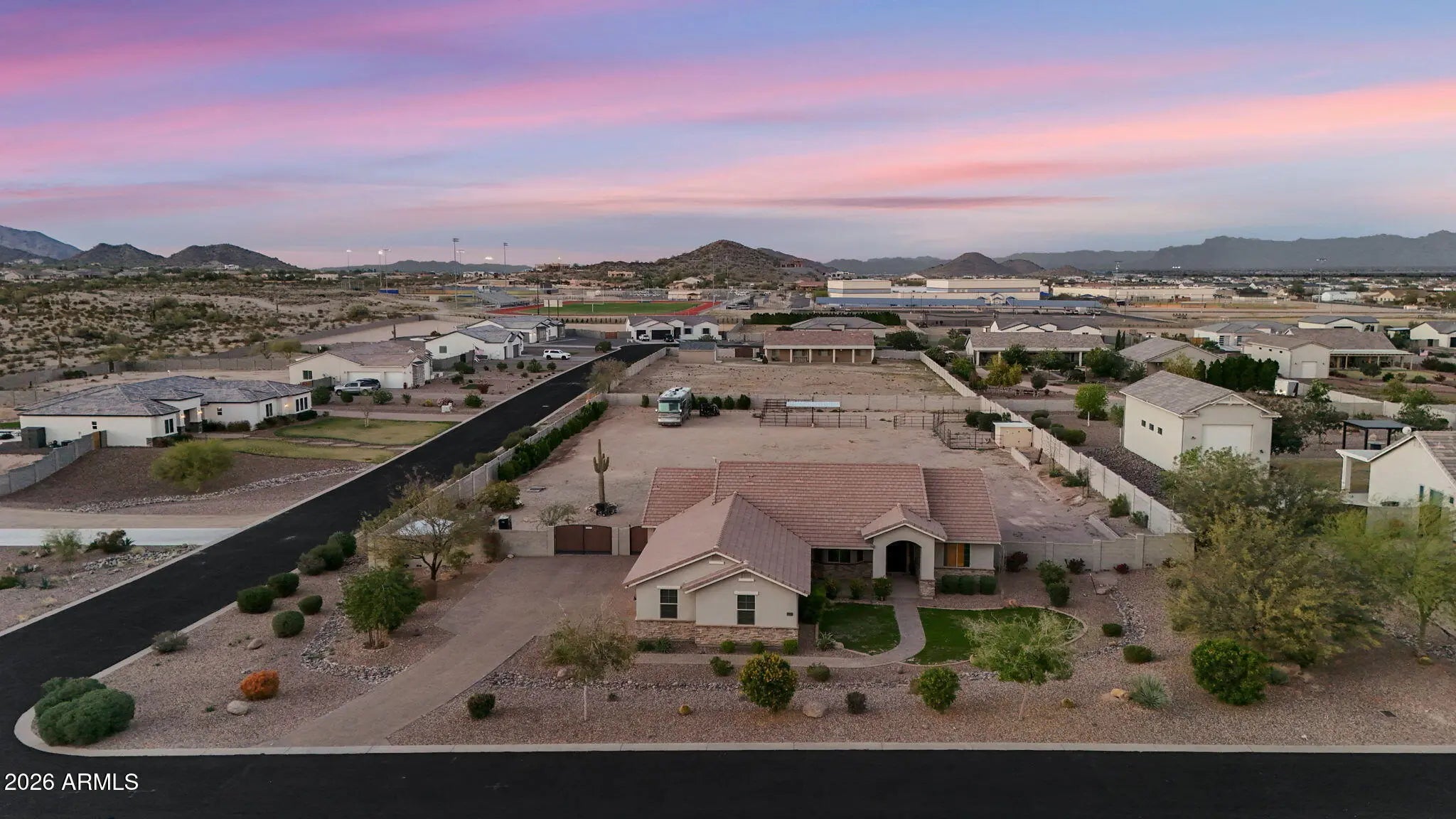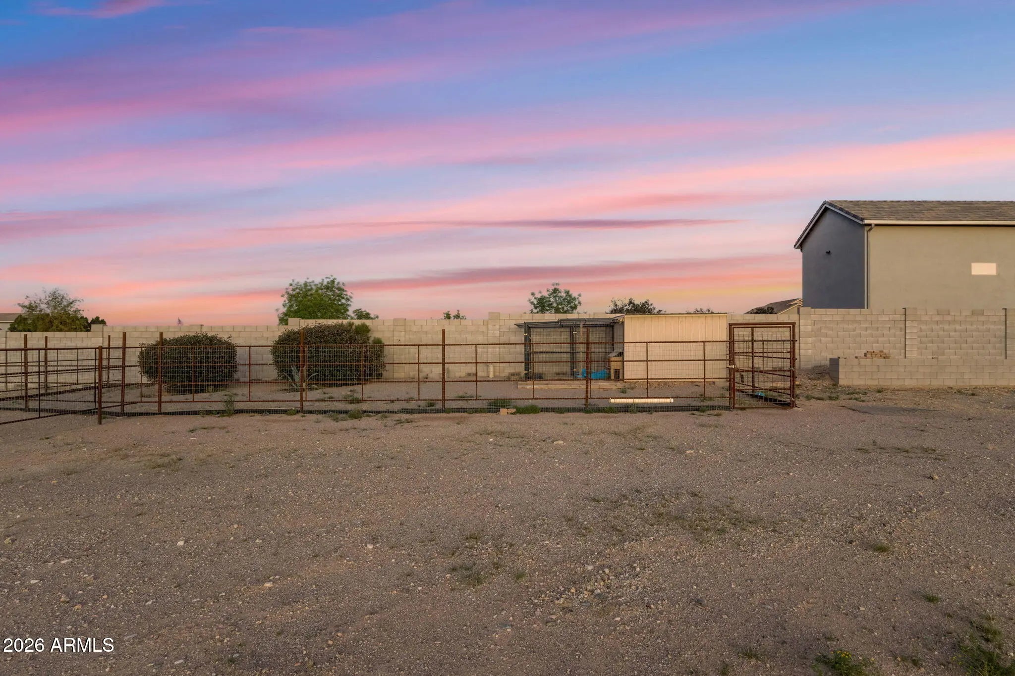Welcome to a rare opportunity in a small, gated enclave of newer homes in San Tan Valley -- where space, privacy, and flexibility come together in a way that's hard to find. Built in 2019, this 2,328 square foot home offers 4 bedrooms, 2 baths, and a highly sought-after 4-car garage -- plus an RV gate and dedicated RV parking. Whether you need room for vehicles, toys, a workshop, or extra storage, this property delivers. Situated on an expansive 56,000 square foot lot (well over an acre), the possibilities here are truly exceptional. The lot is fully enclosed with a block wall for added privacy and security, and there's already a horse corral at the rear of the property -- perfect for equestrian enthusiasts or anyone wanting space to spread out. Inside, the home features a modern, open layout built for comfortable living and easy entertaining. The split floor plan offers privacy, while the generous living spaces create a welcoming environment for gatherings or quiet evenings at home. The backyard is currently a blank canvas -- giving you the freedom to design exactly what you want. Dreaming of a resort-style pool? Detached guest house? RV garage? Outdoor arena? Lush landscaping? With this much land, you don't have to choose -- you can create it. Homes in gated communities with this lot size, garage capacity, and flexibility rarely come to market. If you've been waiting for space without sacrificing newer construction, this is the one you need to see.