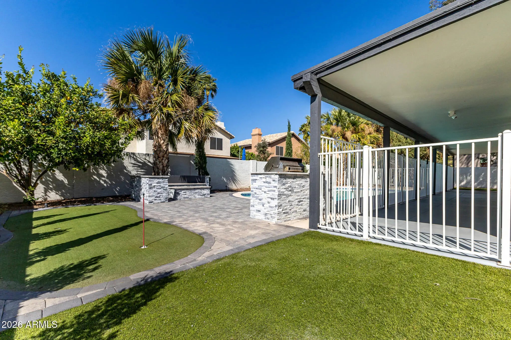 NO HOA in the Magic Zip Code! Perfectly positioned between the PV Mall redevelopment and Scottsdale Quarter, this corner-lot home in Tatum Square offers easy access to top shopping, dining, and entertainment. Complete with a 3-car garage and RV gate, it's designed for both lifestyle and convenience. Inside, you'll find tile flooring, vaulted ceilings, recessed lighting, and a cozy fireplace. The kitchen features white cabinetry, granite counters, stainless steel appliances, a mosaic backsplash, and an island with breakfast bar seating. The oversized primary suite includes vaulted ceilings, dual sinks, and a walk-in closet. Enjoy Arizona living in the backyard oasis with a covered patio, putting green, built-in BBQ, fire pit, and sparkling pool. Don't miss this one!