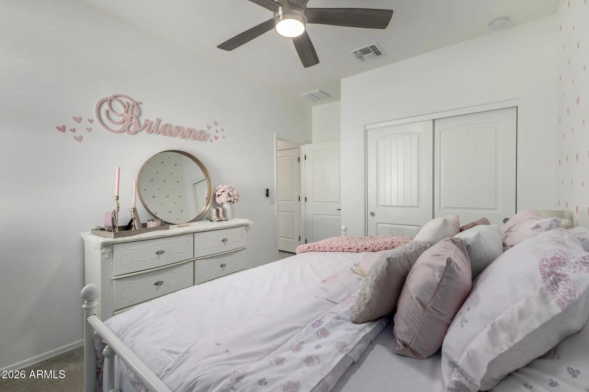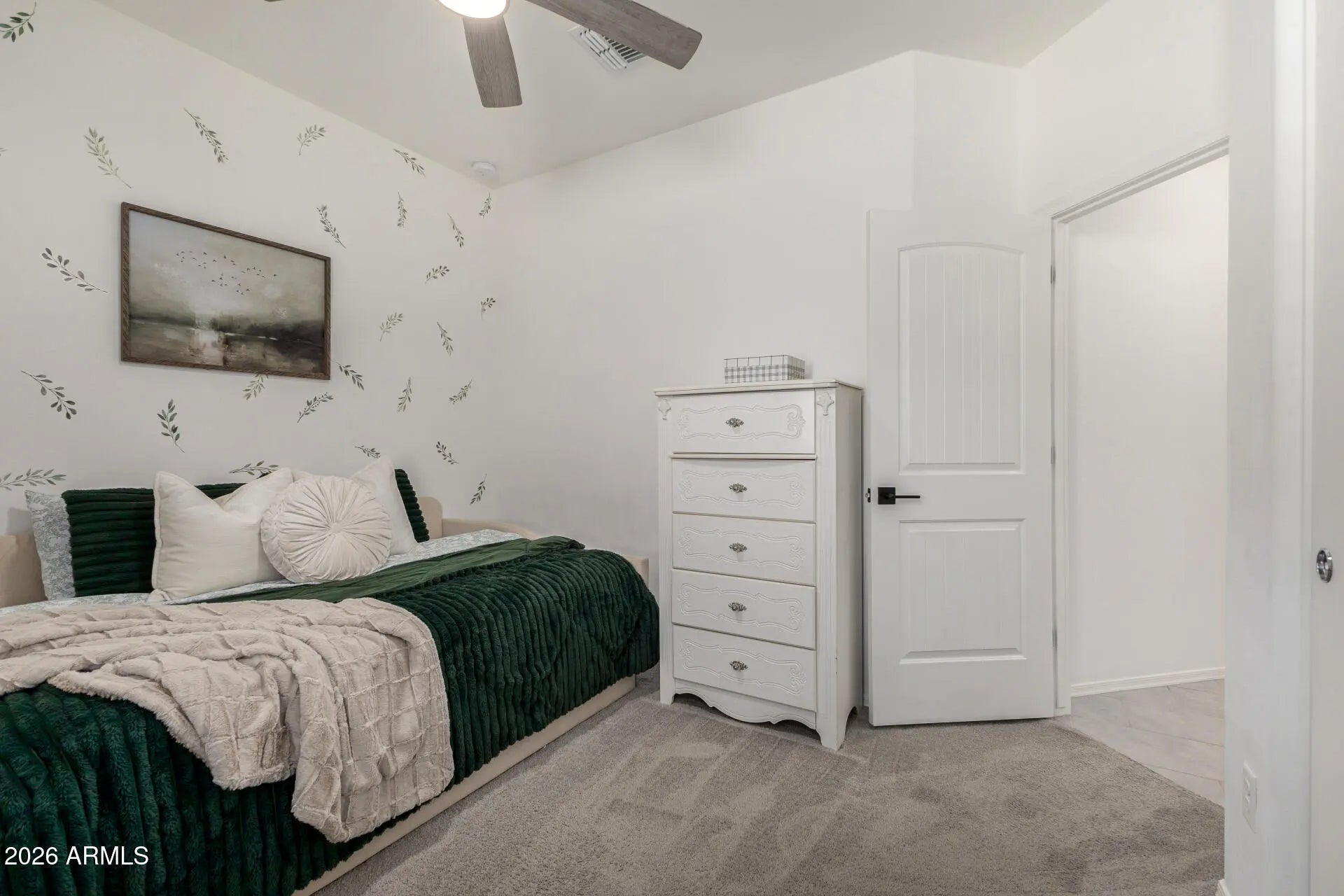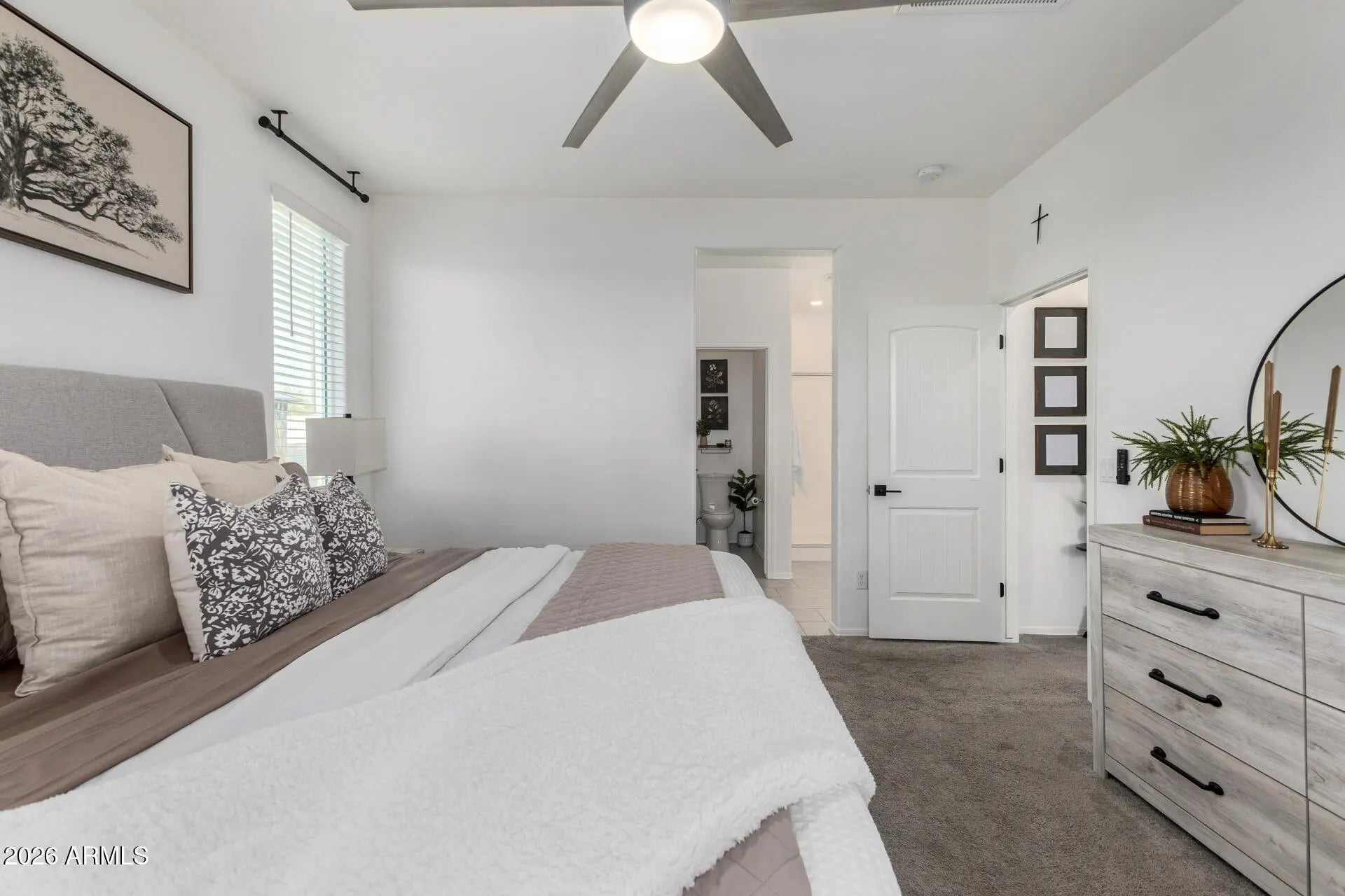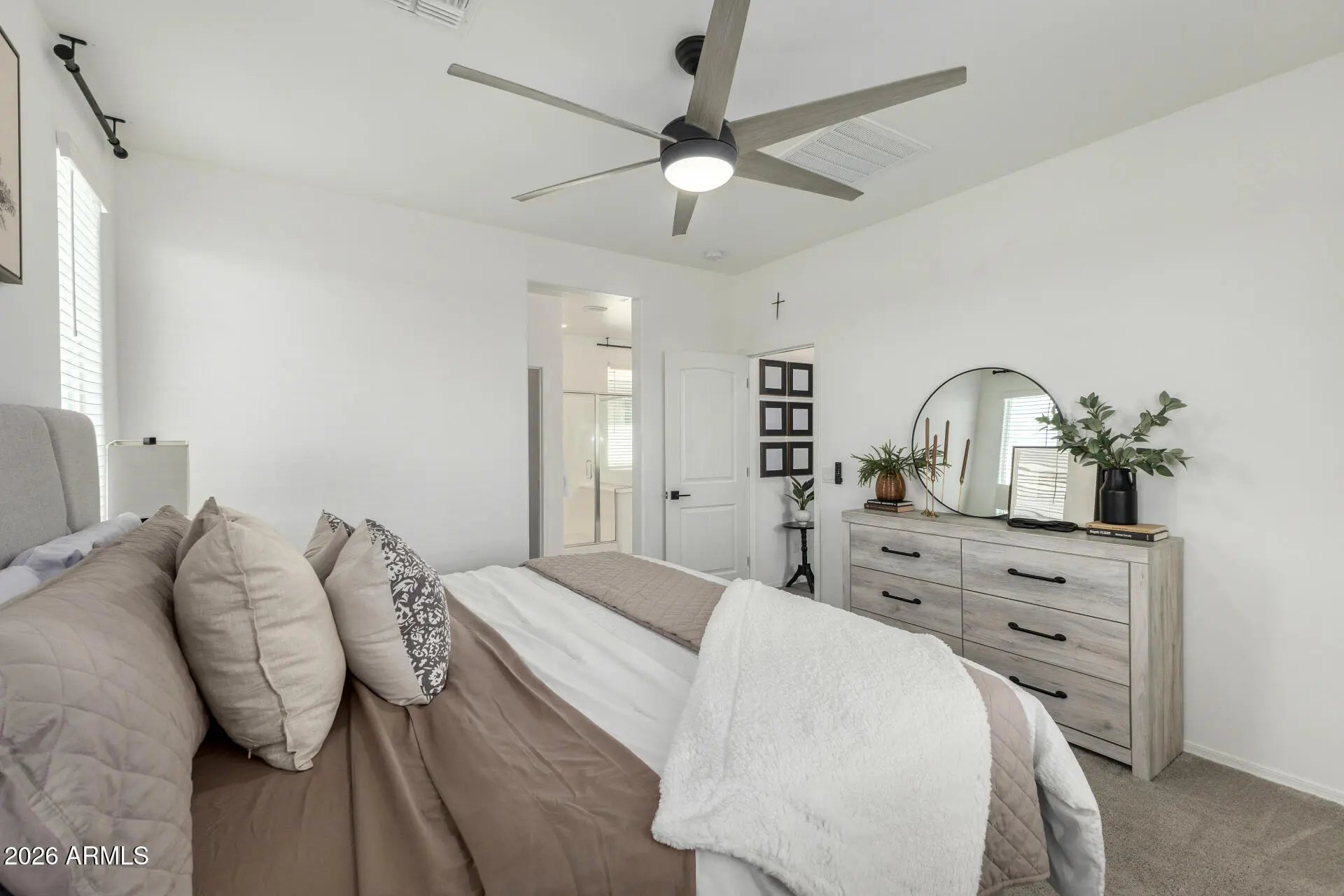 Welcome to this extensively upgraded Scott Communities home located in The Views at Rancho Cabrillo in North Peoria. This desirable Plan 3513 offers approximately 1,958 sq ft on an oversized premium lot with no backyard neighbors, beautiful open sky views, and mountain views from both the backyard and the primary bathroom. With over $70,000 in upgrades completed since June 2023, this home stands apart from typical builder properties and is truly move-in ready. The home features 4 bedrooms with all walk-in closets, 2.5 bathrooms, which one is a custom added half bathroom within the laundry room. The open-concept layout offers a large great room (approx. 17'4'' x 23'0'') flowing seamlessly into the kitchen and dining area, creating ideal space for entertaining. The kitchen has been upgraded with extended quartz countertops, a custom porcelain sink, and an upgraded brass faucet. Tahoe Maple Slate cabinetry has been enhanced with custom brass hardware throughout. The stainless gas appliance package, island seating, and pantry space complete the functional and modern kitchen design. Interior upgrades include custom lighting in the entrance hallway and dining room, and LED lighting throughout the entire home for energy efficiency and a clean modern feel. Oversized smart ceiling fans have been installed in the living room, primary suite, and patio, with additional smart fans installed in all remaining rooms. Custom blinds and blackout shades have been installed throughout. Interior paint has been refreshed. All interior door handles and hinges have been upgraded from chrome to black, creating a cohesive contemporary finish throughout the home. The main front door has also been upgraded with a smart lock system for added security and convenience. The laundry room has been fully customized and includes a newly added half bathroom. A Smart LG stacked washer and dryer set is included. The primary suite offers a spacious layout (approx. 14' x 12'8"), dual sinks, cultured marble finishes, upgraded low-wall shower configuration with 42" x 42" shower pan, slide-in garden tub, walk-in closet, and mountain views from the bathroom window. Structural upgrades include a 2' garage extension and an upgraded 8' garage door. The extended driveway accommodates up to 3 vehicles. The garage includes new LED lighting and a smart garage door system. The exterior has been professionally upgraded with approximately $25,000 invested in synthetic grass in both the front and backyard, pavers, decorative rock, plants, irrigation system (drip and sprinkler components), custom steps, and a pergola. There is no dirt backyard or unfinished desert landscaping. The yard includes mature bougainvillea, guava tree, pomegranate tree, miniature lime and orange trees, and a mini palm tree, creating a private outdoor retreat with no rear neighbors. Additional features include: - Post-tension slab construction - Energy Star efficiency - Dual-pane Low-E windows - R-38 ceiling insulation and R-19 wall insulation - 15 SEER high-efficiency A/C - 40-gallon gas water heater - Soft water loop - Structured media wiring with TV outlets in great room and primary bedroom - Smart thermostat - Upgraded exterior front porch lighting - Block-fenced rear yard - Paver driveway and walkway The home is located near a newly built approximately 5-acre community park featuring two dog parks, five pergolas, two playgrounds, a basketball court, and a large open turf area suitable for soccer or baseball, adding significant lifestyle value to the neighborhood. The property remains covered by a 10-year construction warranty along with a 10-year A/C warranty. Located near hiking trails, parks, Loop 303 access, and North Peoria amenities, this property offers privacy, smart upgrades, premium lot positioning, and outstanding community features. Move-in ready and extensively upgraded -- this home is ready for its next owner.