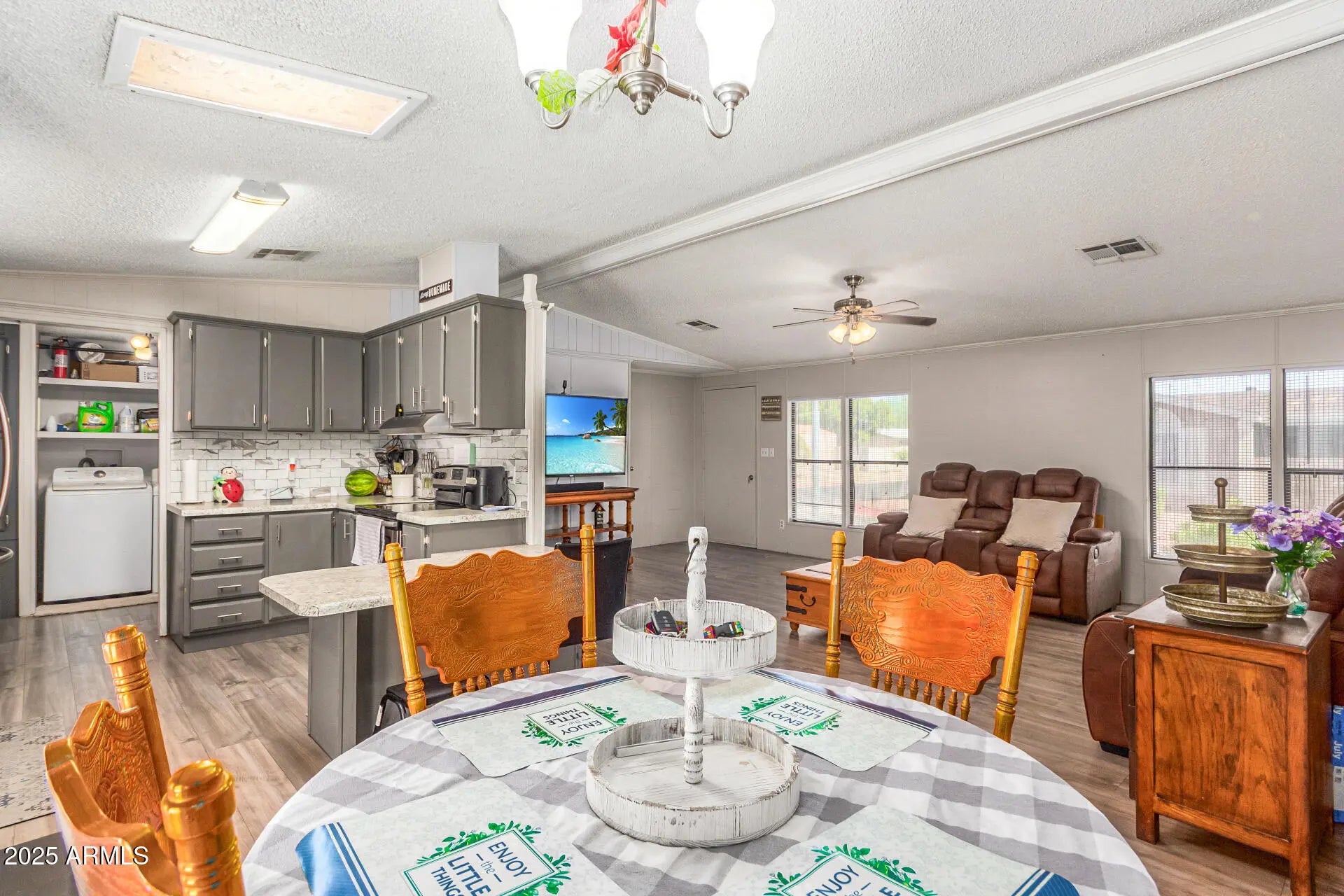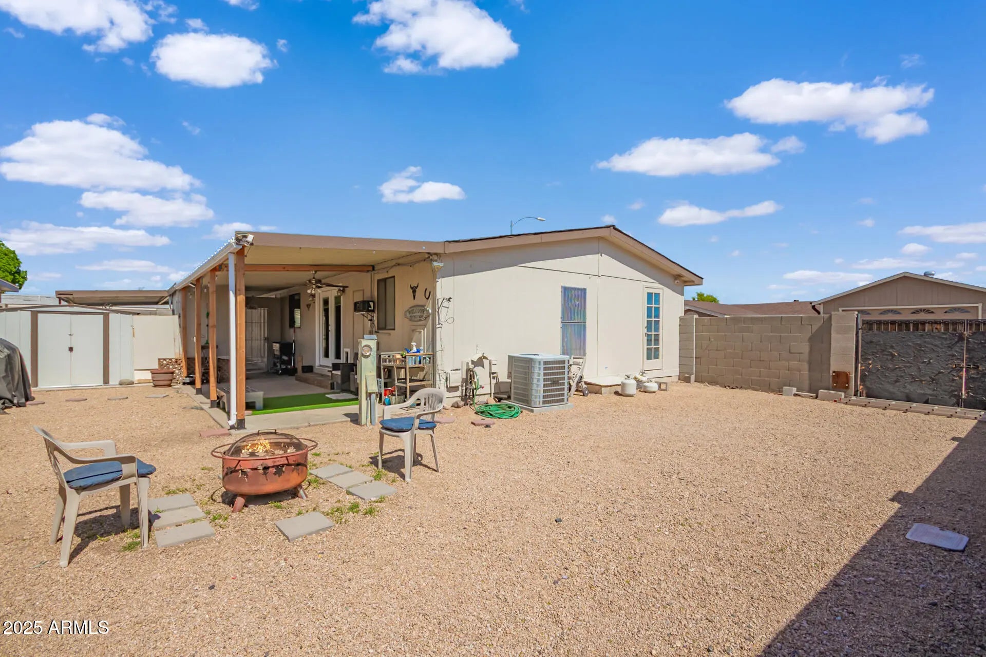 CORNER LOT w/LIMITED NEIGHBORS for Added PRIVACY! Move-in-Ready Doublewide Home on Owned Land. DUAL Covered Parking & RV GATE, Perfect for the Lake Pleasant Enthusiast. Enjoy a Contemporary OPEN-CONCEPT Design featuring a SPACIOUS Great Room that flows into the Formal Dining & Eat-in Kitchen. Modern Finishes complement the Laminate/Vinyl Wood Flooring. Thoughtfully Designed Floorplan ensures Convenience & flow between rooms. DOUBLE ARCADIA DOORS bring in Natural Light & Cross-Breezes, Opening to a Large Backyard!! ideal for Barbecues, Entertaining, Children & Dogs. Easy Access to 101 & Westgate & Cardinals Stadium. Very BUDGET FRIENDLY Property. Inspection Ready!!