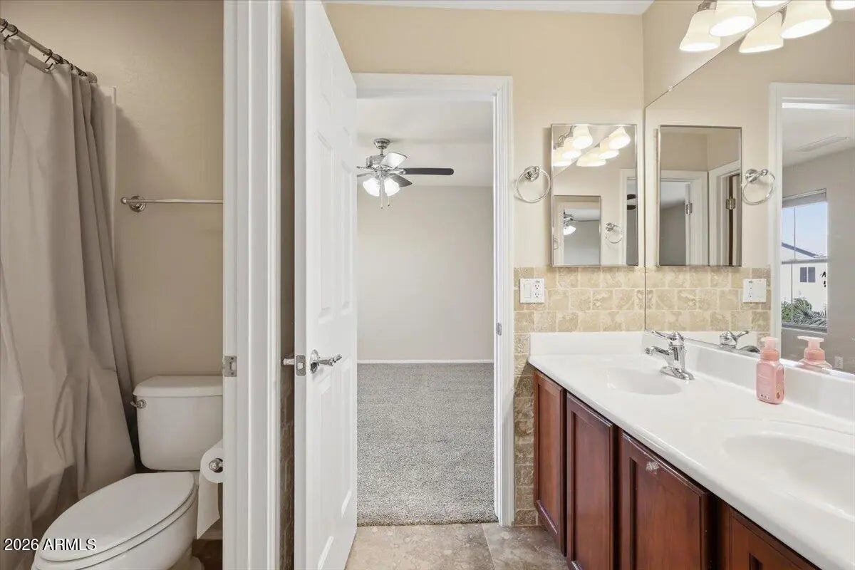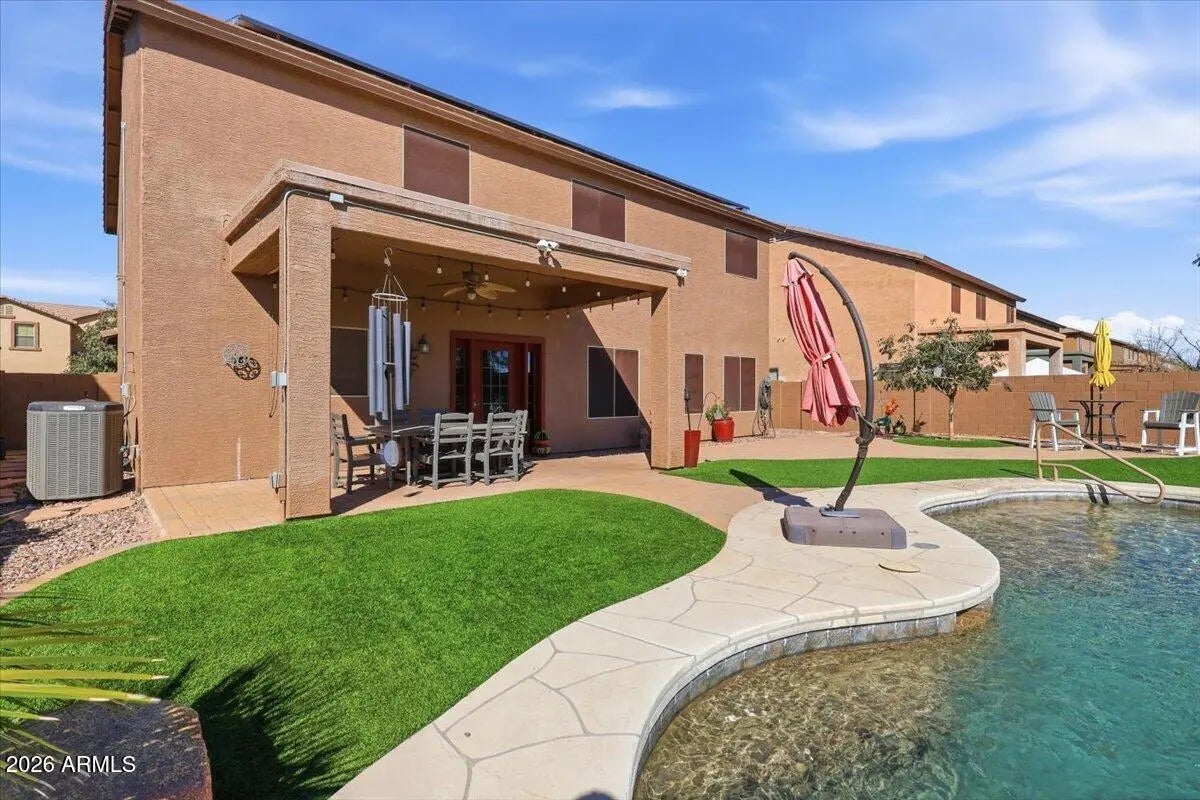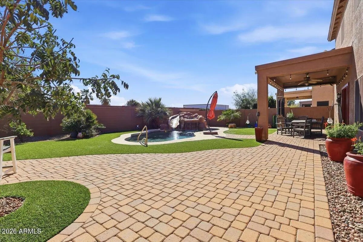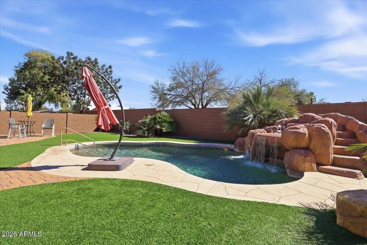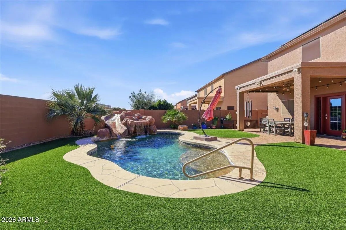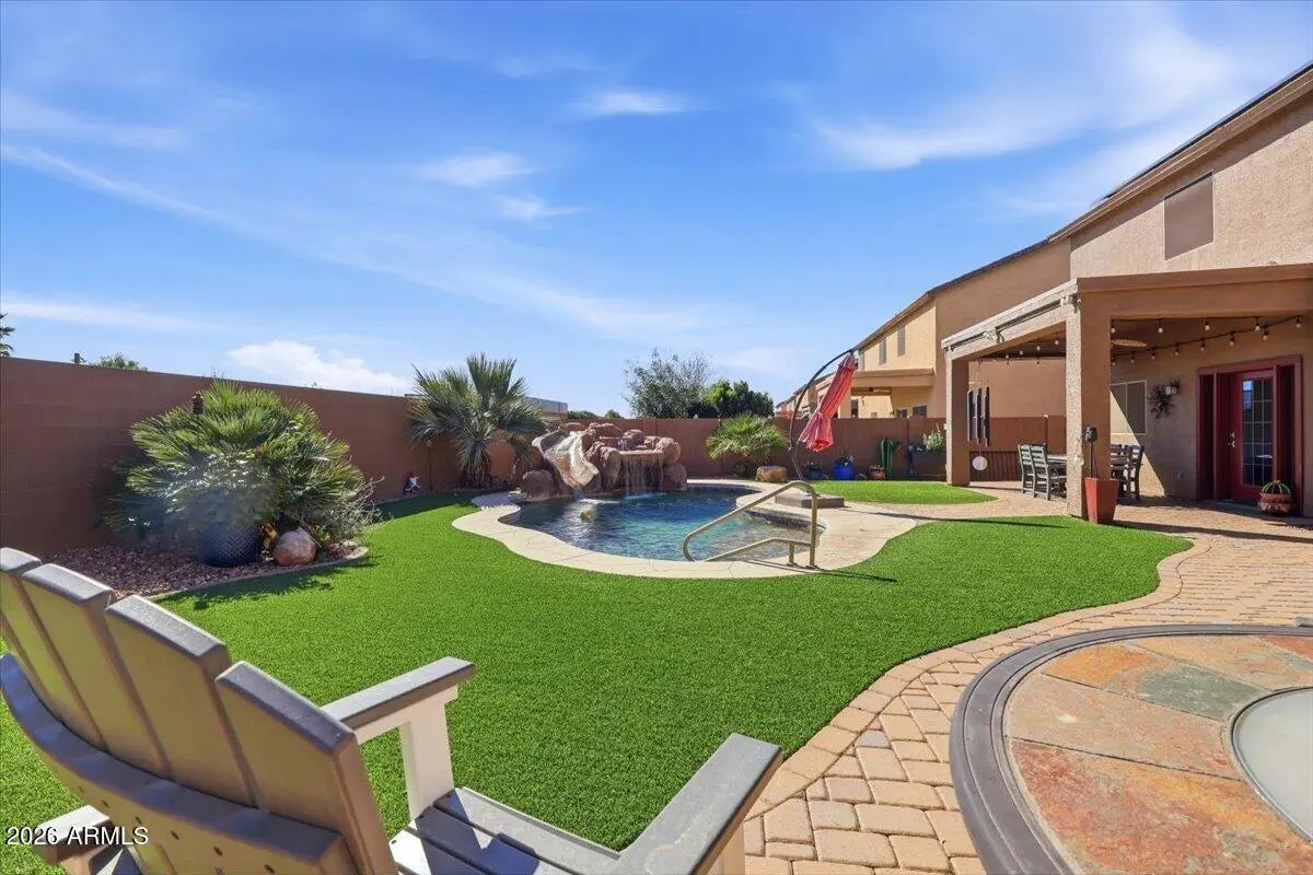 If you've been searching for space, style, and a backyard built for entertaining, this nearly 3,800 sq ft two-story home with a heated pool and waterfall is the one. Beautifully maintained and move-in ready, this spacious home offers 4 bedrooms and 2.5 baths with a bright, open layout designed for comfortable living and effortless entertaining. The kitchen features stainless steel appliances, a stylish backsplash, and generous counter space, all opening seamlessly to the main living areas. Tile flooring in all the right places provides both durability and easy maintenance. Step outside to your entertainer's backyard on a larger lot, complete with a heated pool, stunning waterfall feature, pavers, and low-maintenance synthetic grass--perfect for relaxing evenings or hosting family and