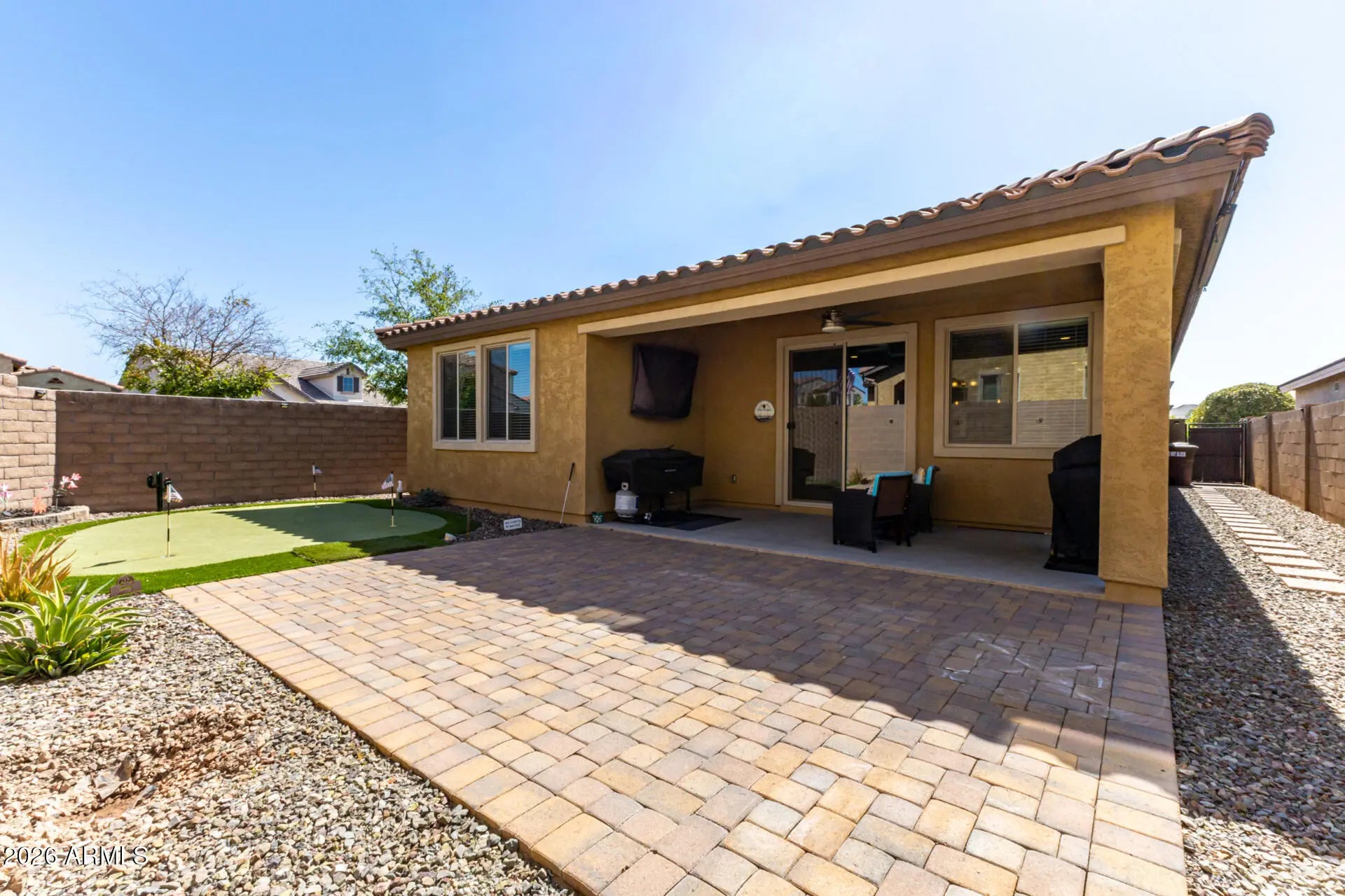 Beautiful move-in ready home in the Highly sought-after MEADOWS community in Peoria! This 3 bedroom, 2 bathroom home offers a spacious split floor plan with upgraded cabinetry, granite countertops, and a large oversized kitchen island perfect for cooking and entertaining. The open layout provides comfortable living and great natural flow throughout. Enjoy a low-maintenance backyard featuring a charming putting green--ideal for relaxing or entertaining guests. The garage includes cabinets and a workbench, offering plenty of storage and workspace. Energy-efficient features add extra value to this well-maintained home. One of the best-priced homes in the Meadows- this one won't last long!