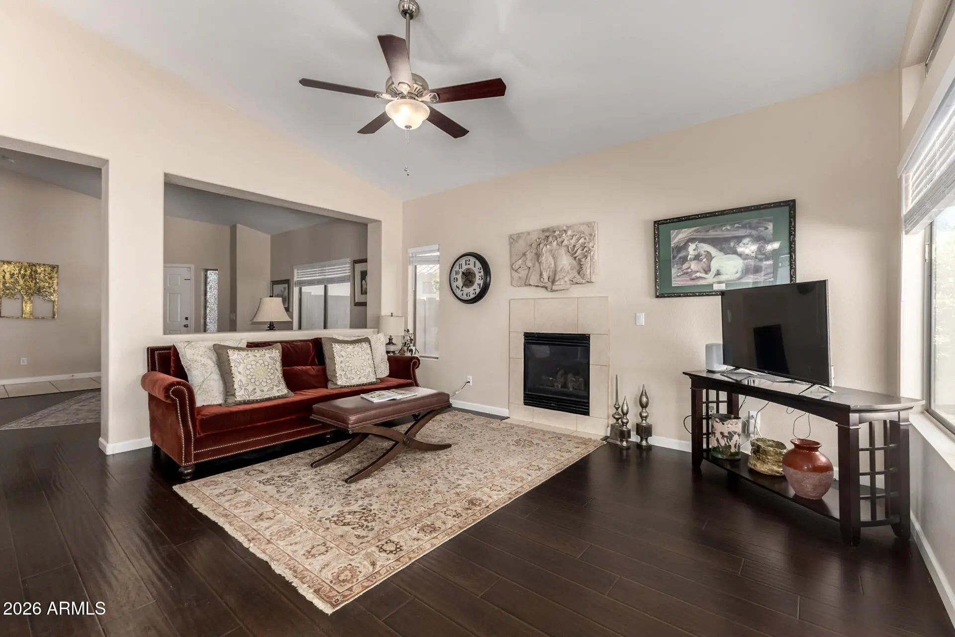 Beautifully maintained home in the coveted community of Anthem Parkside offering over 1,670 sq.ft. of thoughtfully designed living space. Rich plank and elegant tile flooring, soaring vaulted ceilings, and a neutral color palette create a warm and inviting atmosphere throughout. Enter into a welcoming living room that flows seamlessly into a bright family room highlighted by clerestory windows and a cozy fireplace. The open concept kitchen is ideal for everyday living and entertaining, featuring a kitchen island with breakfast bar, sleek stainless steel appliances, and abundant cabinet storage. Recent kitchen updates include a new range, microwave, sink, faucet, and island countertop, adding both style and functionality. The spacious primary suite includes an en suite bathroom with dual vanities, a separate shower and soaking tub, plus a large walk in closet. A split floor plan provides privacy for the guest bedrooms along with a full guest bathroom for added convenience. Numerous recent improvements enhance the home's value and comfort, including new interior paint in 2023, new window blinds installed in 2023 (except guest bedrooms), HVAC service in Oct. 2025, partial roof replacement completed in 2023, and new handheld showerheads and new primary bathroom shower door in 2026. Step outside to a fully landscaped backyard complete with a relaxing covered patio, extended pavers, fire pit, and low maintenance foliage. Enjoy the exceptional lifestyle Anthem living provides, with amenities that include a community center, pool, sport courts, library, parks, schools, shopping, dining, and more.