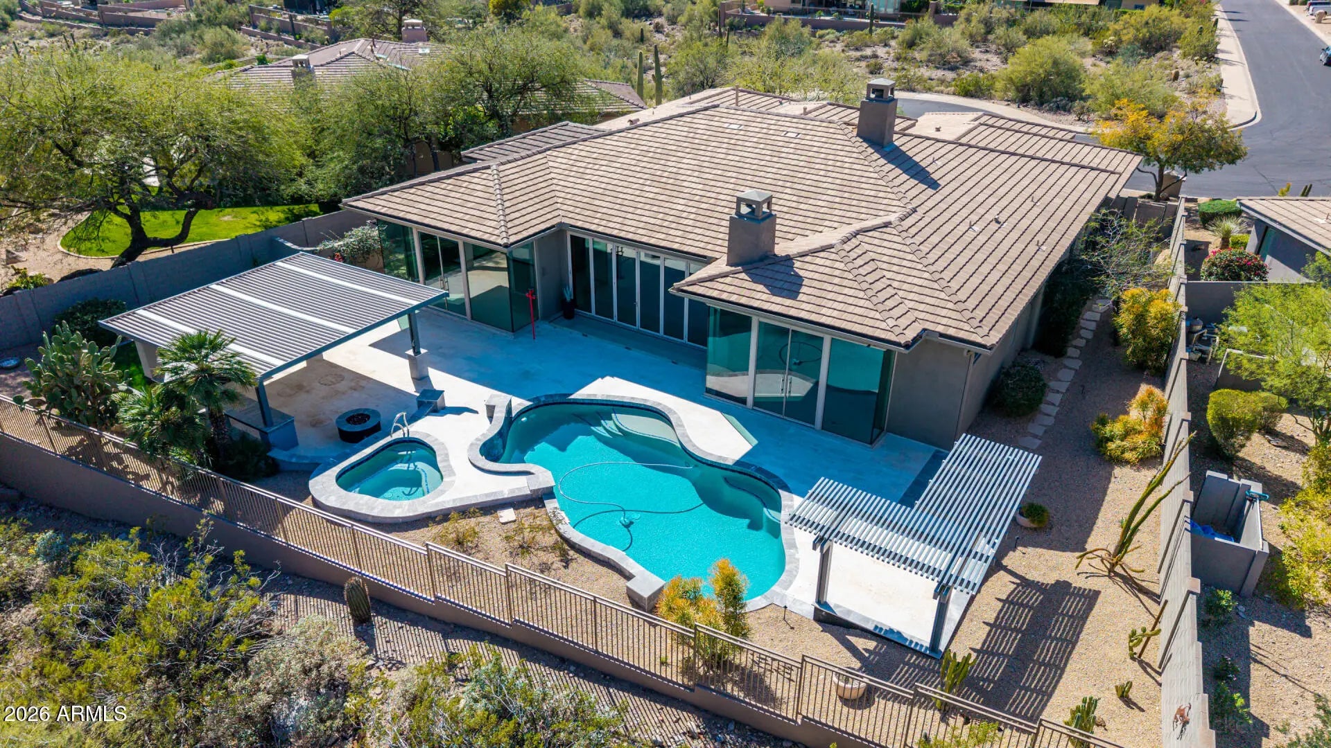 Stunning views from this contemporary home in a quiet cul-de-sac in Trovas at McDowell Mountain Ranch. Popular Medici model with 3 Bedrooms, 4.5 Baths, Office and exercise room. Step through the iron door to amazing views through a wall of glass. Great room concept with glass rock fireplace and entertainment built-ins. Highly-upgraded kitchen with walnut cabinets, Caesarstone counters, dual dishwashers, dual warming ovens, professional gas range, double ovens, oversized refrigerator and pantry with beverage cooler. Tile flooring throughout for seamless flow. Split primary bedroom with collapsing double doors, spa-like bathroom with granite soaking tub, walk-in steam shower adjacent to exercise or flex room and full laundry room with storage. Guest wing includes media room, two ensuite bedrooms. Office with built-in desk and private patio access. Remote-control shades and surround sound add to the smart touches in this home. Open the accordian-style wall of glass to the spectacular backyard bordering the preserve, perfect for entertaining under covered ramada with grill, firepit and heated pool and spa. Just blocks from the Gateway Trailhead for miles of hiking. McDowell Mountain Ranch offers amazing amenities with clubhouse, fitness center, multiple pools and activities.
