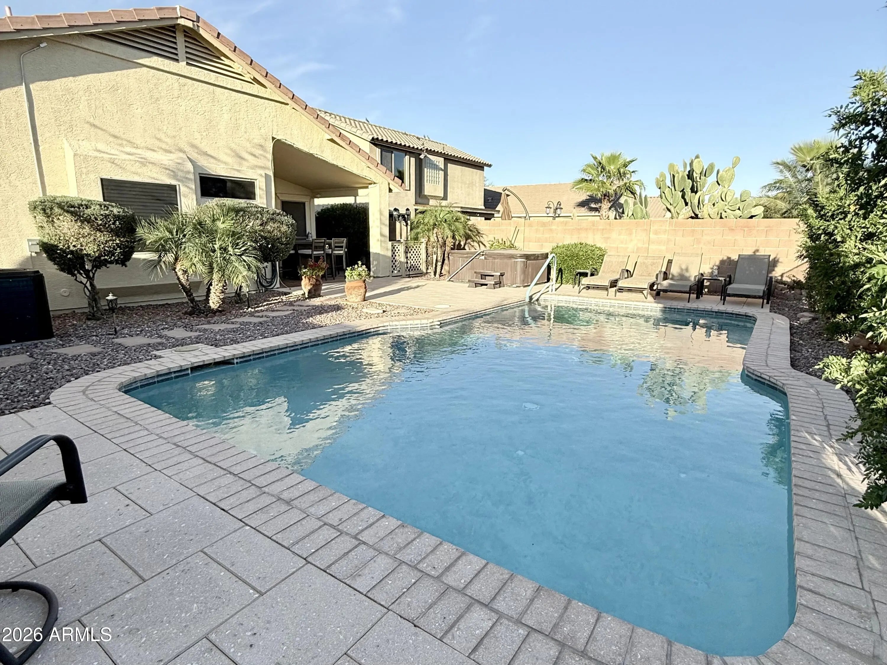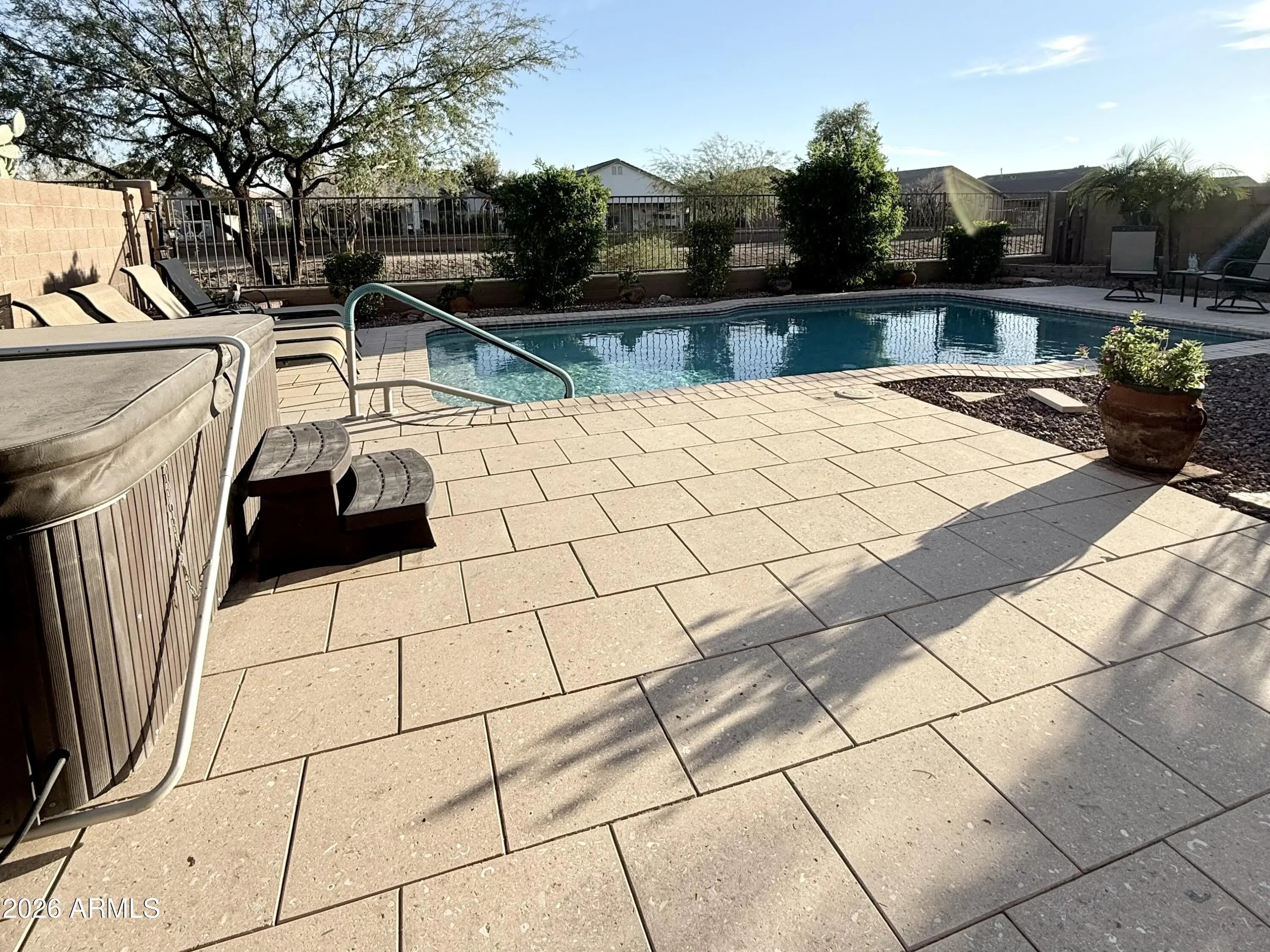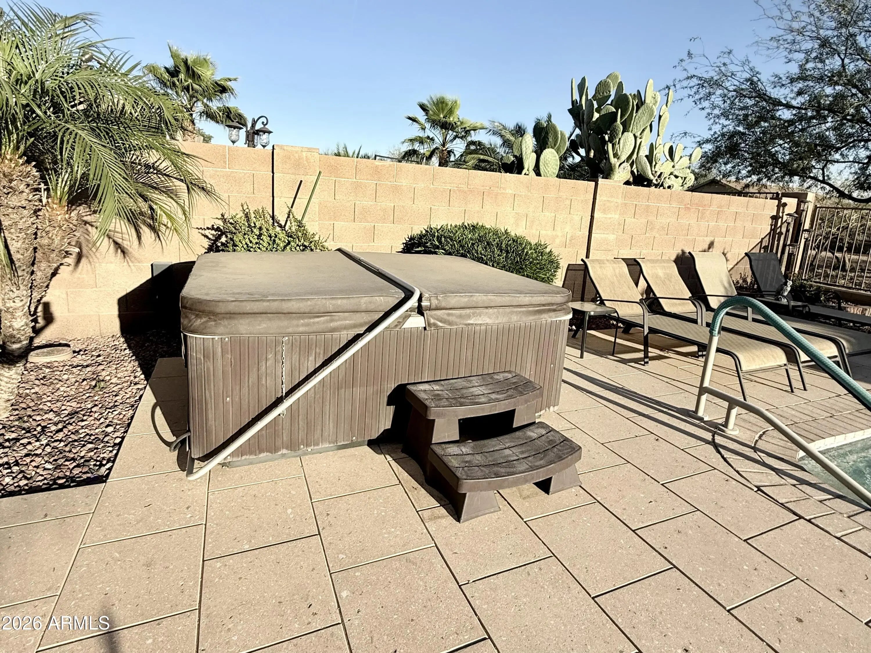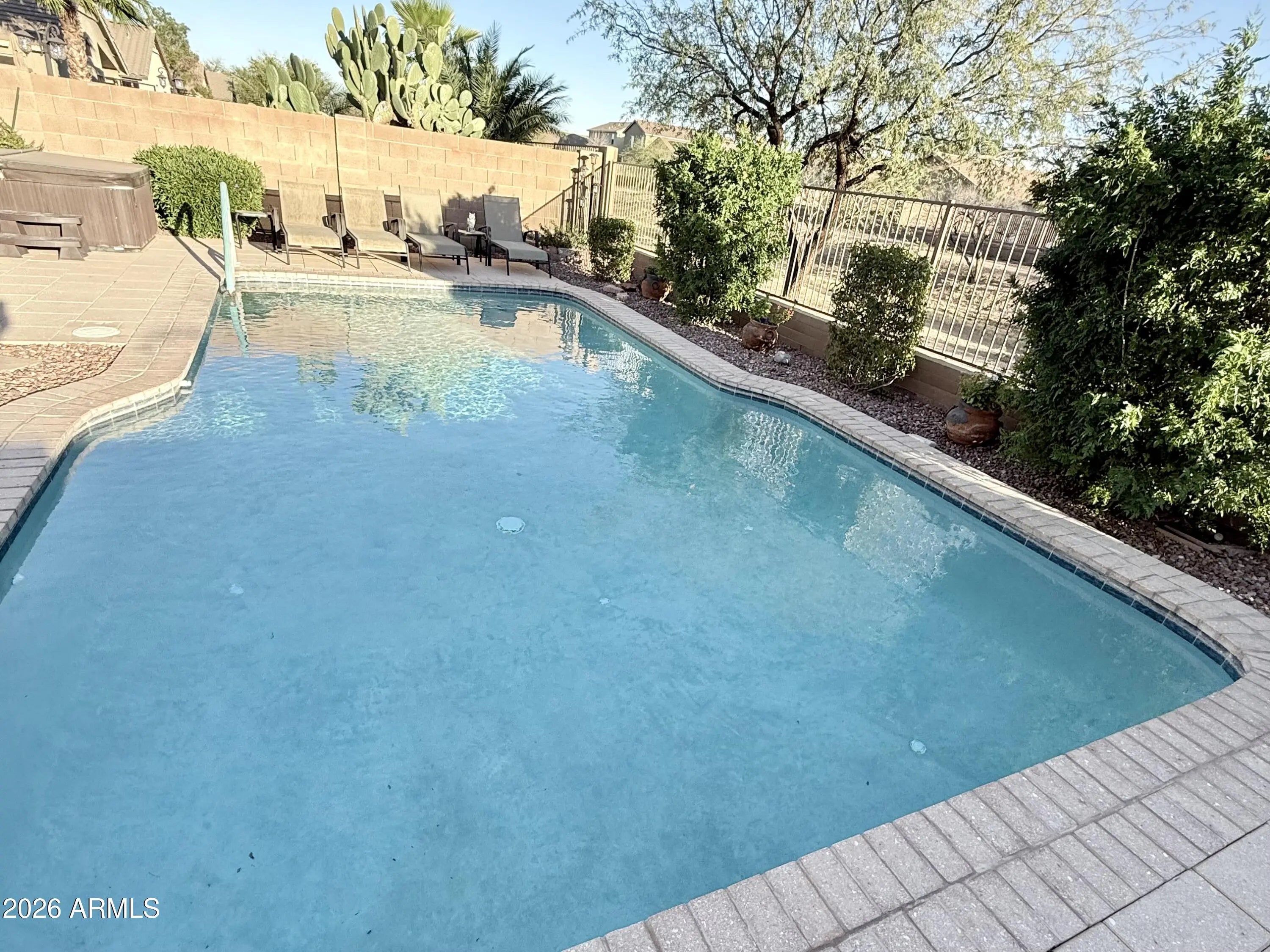 From the moment you arrive, you'll fall in love with the charming, oversized covered front patio, the perfect spot for morning coffee or winding down in the evening. This beautifully maintained single-story home offers 3 bedrooms, 2 bathrooms, a sparkling pool, above-ground hot tub, and view fencing that backs to a wash, giving you privacy along with stunning mountain and sunset views. North-south exposure keeps the home comfortable year-round. Inside, the home is fully furnished and truly move-in ready. The kitchen is thoughtfully positioned so you can look out toward the front yard while doing dishes, it opens into a cozy Dining Room and right around the corner is the living space featuring a fireplace that makes the whole home feel warm and inviting. You'll immediately notice how clean and well cared for everything is. Recent upgrades include freshly repainted cabinets, updated light fixtures throughout, glass shower doors, new blinds, new refrigerator, new doorknobs, AC capacitor, new pool heater, new pool pump, new drip system, and new pool floor cleaner actuator. The garage features built-in cabinets for added storage, and the home includes an owned soft water system. The backyard is beautifully landscaped and designed for entertaining, complete with a large covered patio, pool, hot tub, and peaceful wash views. It's the kind of space you'll actually use year-round. Located just 15 minutes from shopping, restaurants, and a movie theater, and about 10 minutes from Pecan Lake Entertainment, you're close to everything you need. Parks, schools, and everyday conveniences are all nearby. This home truly checks all the boxes with its location, upgrades, and incredible views. It offers the comfort of a well-maintained home, the convenience of nearby amenities, and the kind of backyard setting that's hard to find. Whether you're looking for a full-time residence, a winter retreat, or something fully furnished and ready to go, this one delivers.