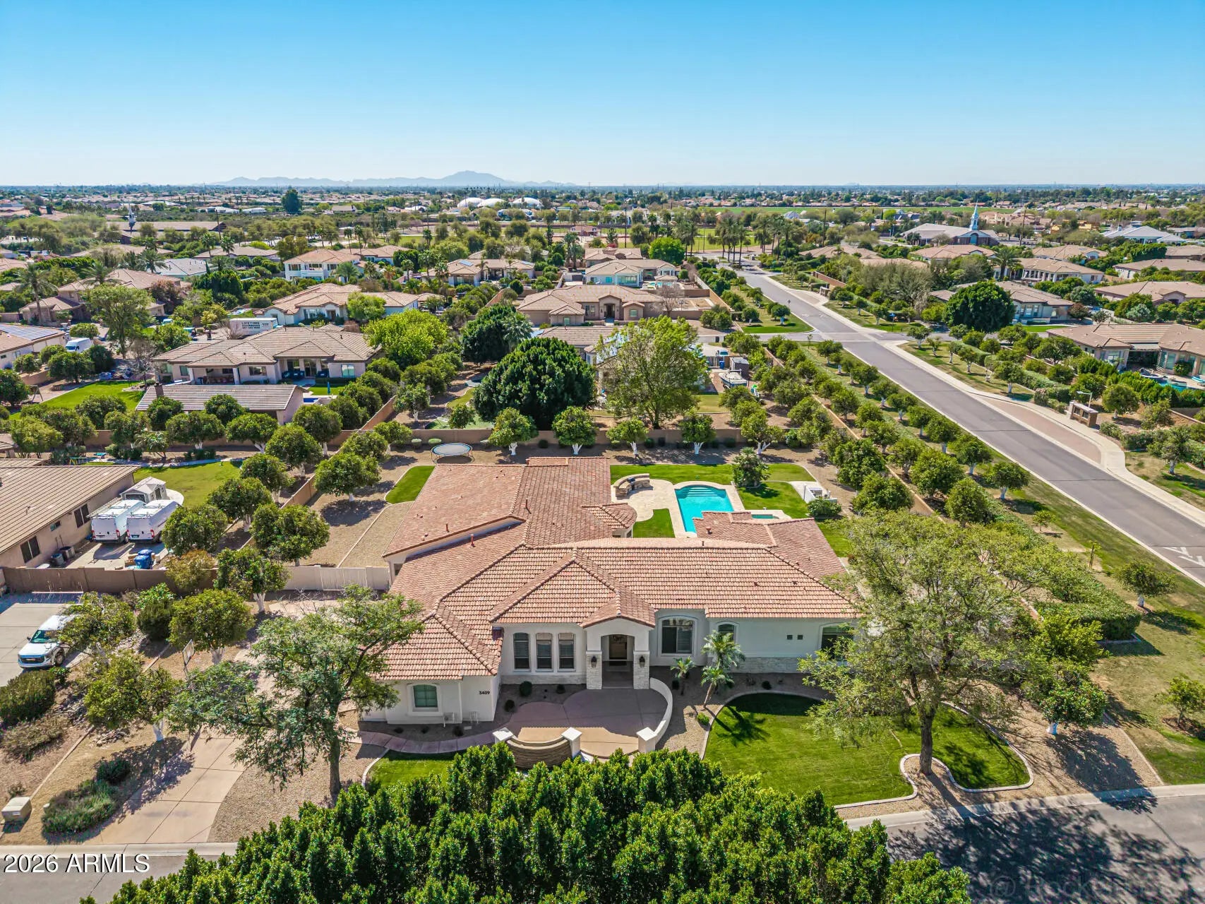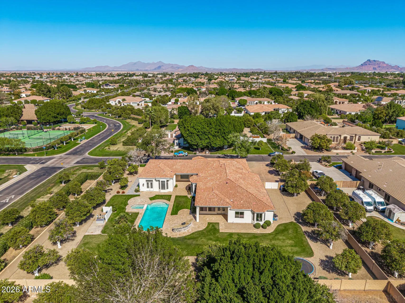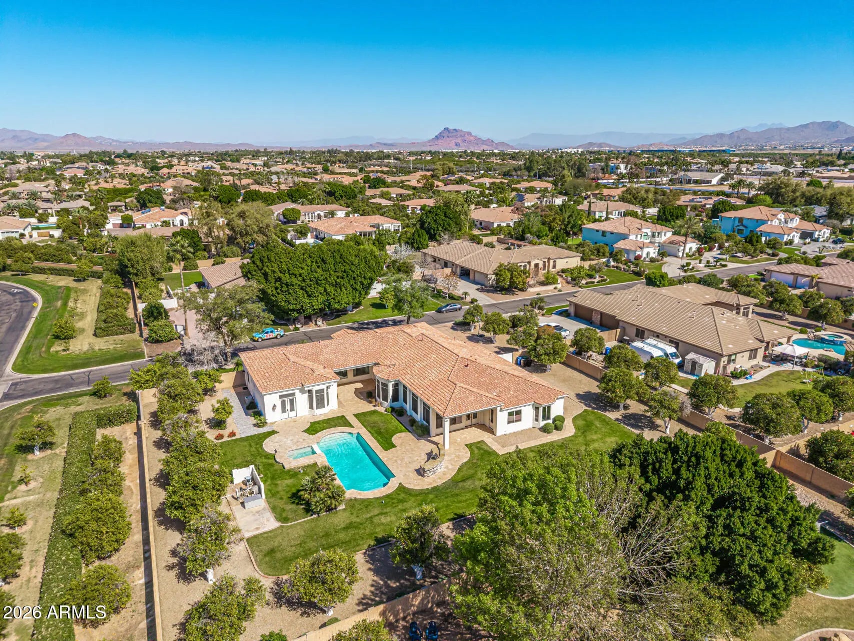 Fully remodeled 6,401 SF luxury basement home with casita in the heart of Arboleda! 6 beds, 4.5 baths, 4-car garage. Set on ¾-acre corner lot next to central park with pickleball, tennis & more, far from busy streets, close to 202, Scottsdale, Tempe, PHX. Gourmet kitchen with Sub-Zero fridge, Wolf cooktop, double ovens, sinks, dishwashers. Main office/library with custom workstations. Large primary suite with exercise room/second office/second laundry, huge closet. Interior casita has own kitchen, family room, second primary suite, exterior entrance. Timeless finishes throughout: wide hardwood floors, new cabinets, counters, bathrooms, doors, fixtures, fans, crown, base, trim. Resurfaced backyard pool, spa, travertine, RV gate, grass, citrus. Largest original single-level floor plan with basement in Arboleda with all extensions--5,084 square feet on main level with 4 bedrooms plus 1,317 square feet in basement with additional family/movie room, 2 more bedrooms, newly added storage. Meticulous remodel completed for long-term living with no expense spared (not cheaply for a quick flip). Examples: all old arches removed in favor of clean lines, redesigned custom office, second laundry added, new closets created (in primary bedrooms and basement), 14,000 lbs of new decorative rock added to yard, new travertine patios, custom cabinets and hood to maximize storage and walkways to the inch, high-end finishes including new (not repainted) cabinetry, extra-wide flooring, all new doors, crown, tall base, molding, fixtures, shutters, etc. High quality repaint inside and out. Reverse osmosis units in main kitchen and butler pantry sinks and connected to pantry fridge. Water softener and continuous hot water loop system installed. No wall hangings since completion of remodel. No smoking or pets in home during current ownership (6+ years). Gourmet kitchen is equipped w/everything needed for chef cooking, cabinetry to near ceiling, new counters, walk-in pantry, tile backsplash, stainless steel appliances, drop-in microwave, prep island, breakfast nook, and a peninsula w/a breakfast bar, lots of seating. Long bowling-alley-style hallways lead to enormous primary suite with lovely bay window, direct outdoor access, 2nd fireplace, a new ensuite w/dual vanities and tub, two shower heads and bench, and huge walk-in closet with its own walk-in linen closet. Lowest HOA cost in town for the amenities in a lush community where kids still play and neighbors walk and talk. One-of-a-kind opportunity.