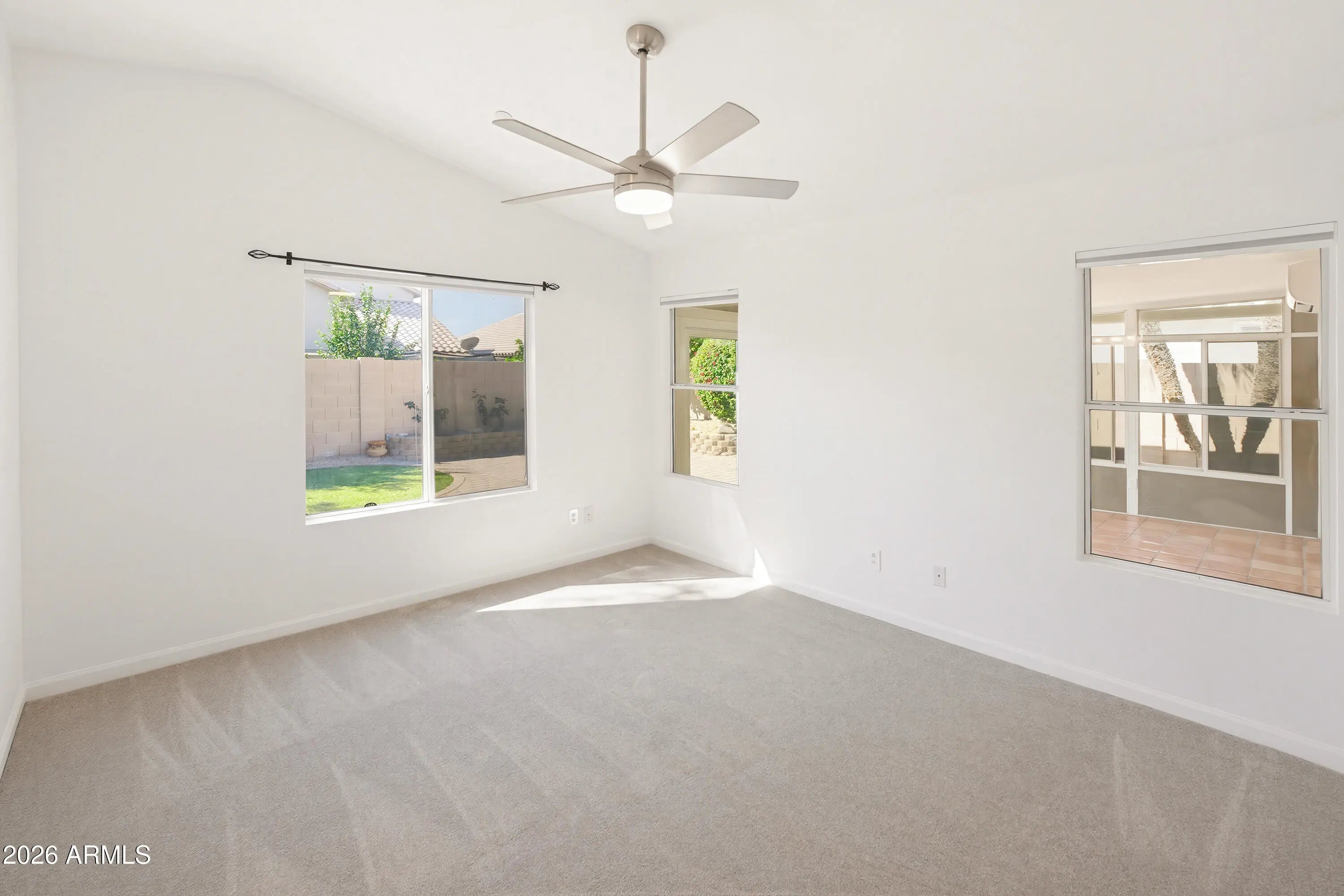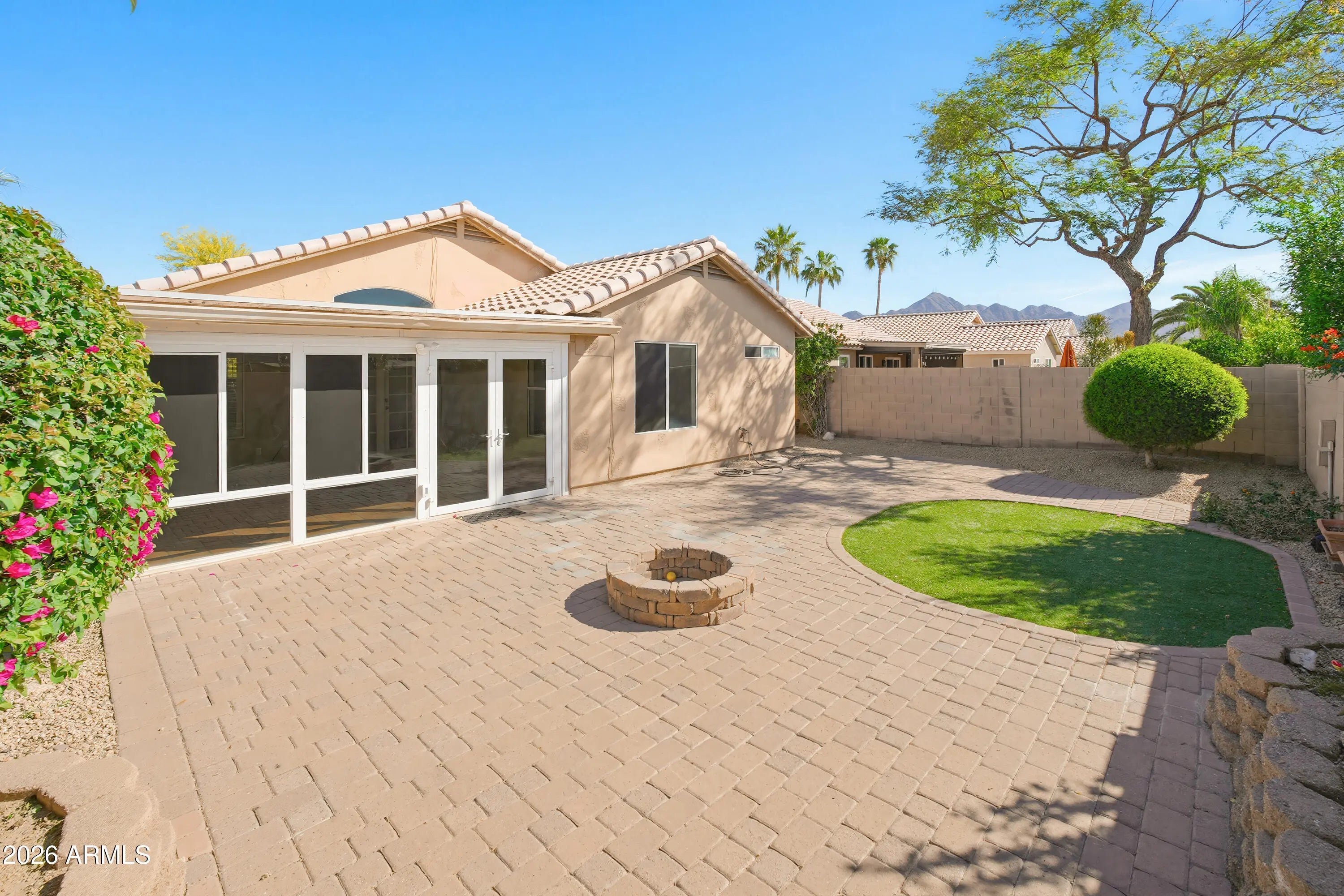 Perfectly located in North Scottsdale, this clean and bright home features granite countertops and stainless steel appliances in the kitchen. The family room offers vaulted ceilings and opens through French doors to a converted Arizona/sun room with AC and heat--ideal for extra living space. Enjoy a backyard with pavers, artificial grass, and a fruit tree, perfect for relaxing or entertaining. Washer, dryer and refrigerator are included, along with landscaping service.