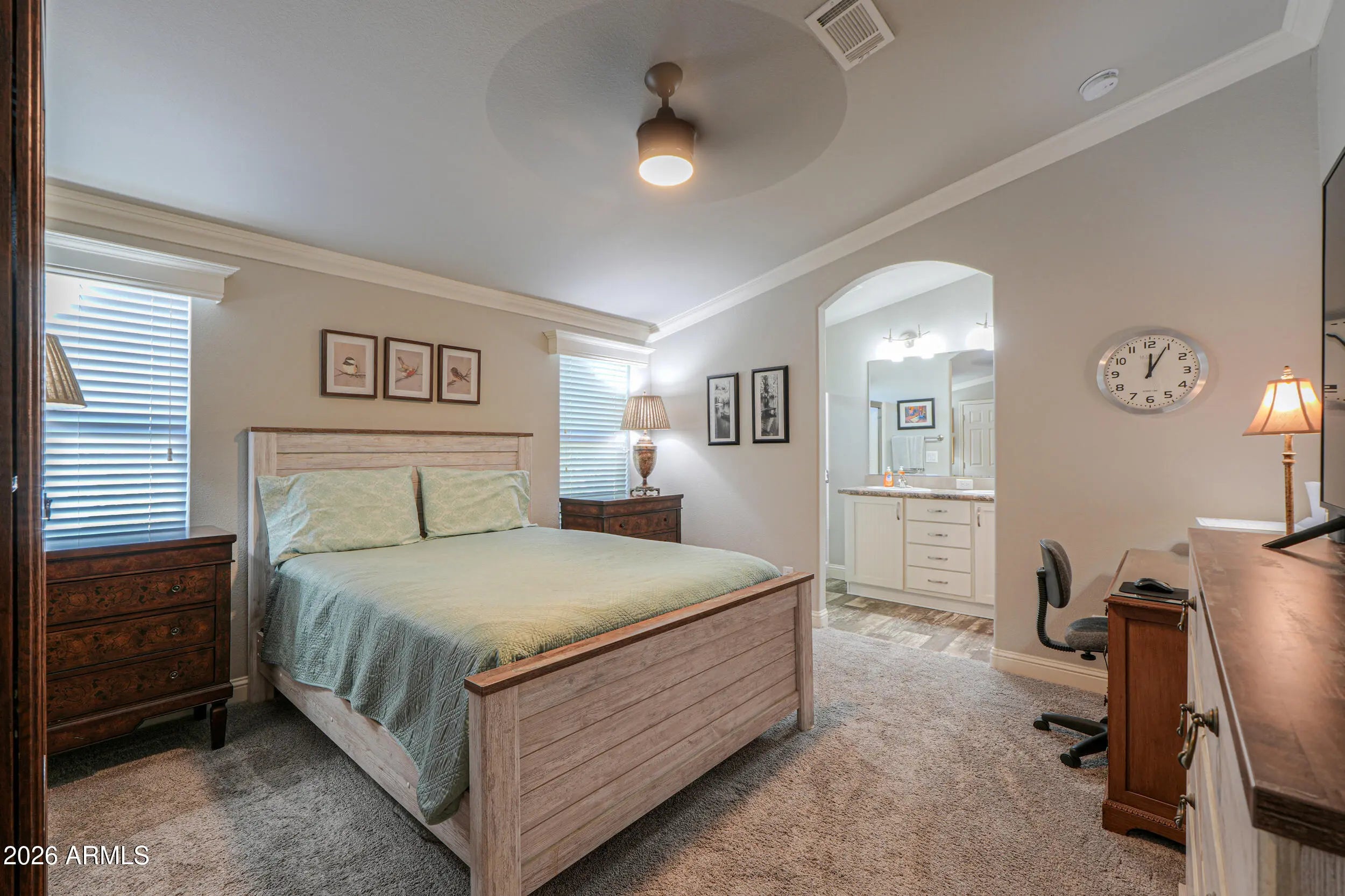 Beautiful open floorplan with vaulted ceilings, offering a bright and spacious feel throughout. The kitchen includes custom cabinetry, all appliances, a breakfast bar, a built-in desk area with extra storage, and a cozy eat-in dining space. Split floorplan provides excellent privacy for guests, with generously sized carpeted bedrooms. The primary suite features a dual-sink vanity and a walk-in shower. The land lease conveniently covers water, sewer, and trash. Additional features include: Crown molding throughout, Ceiling fans, Raised toilets, Tinted energy-efficient windows, sun shades, Screened-in patio, Water softener & RO system , Exterior storage Two-car carport, Low-maintenance desert landscaping with hard-wired lighting. Fresh exterior paint & pre-termite treatment.