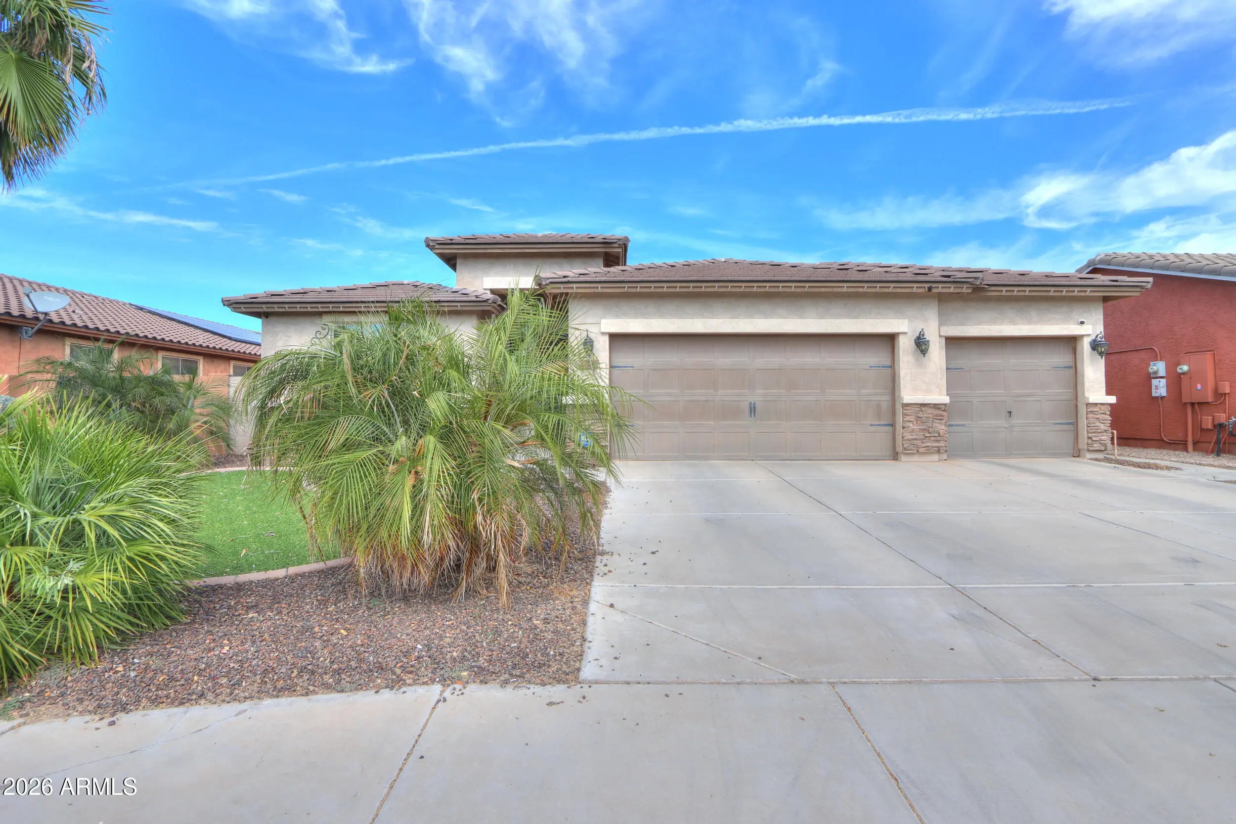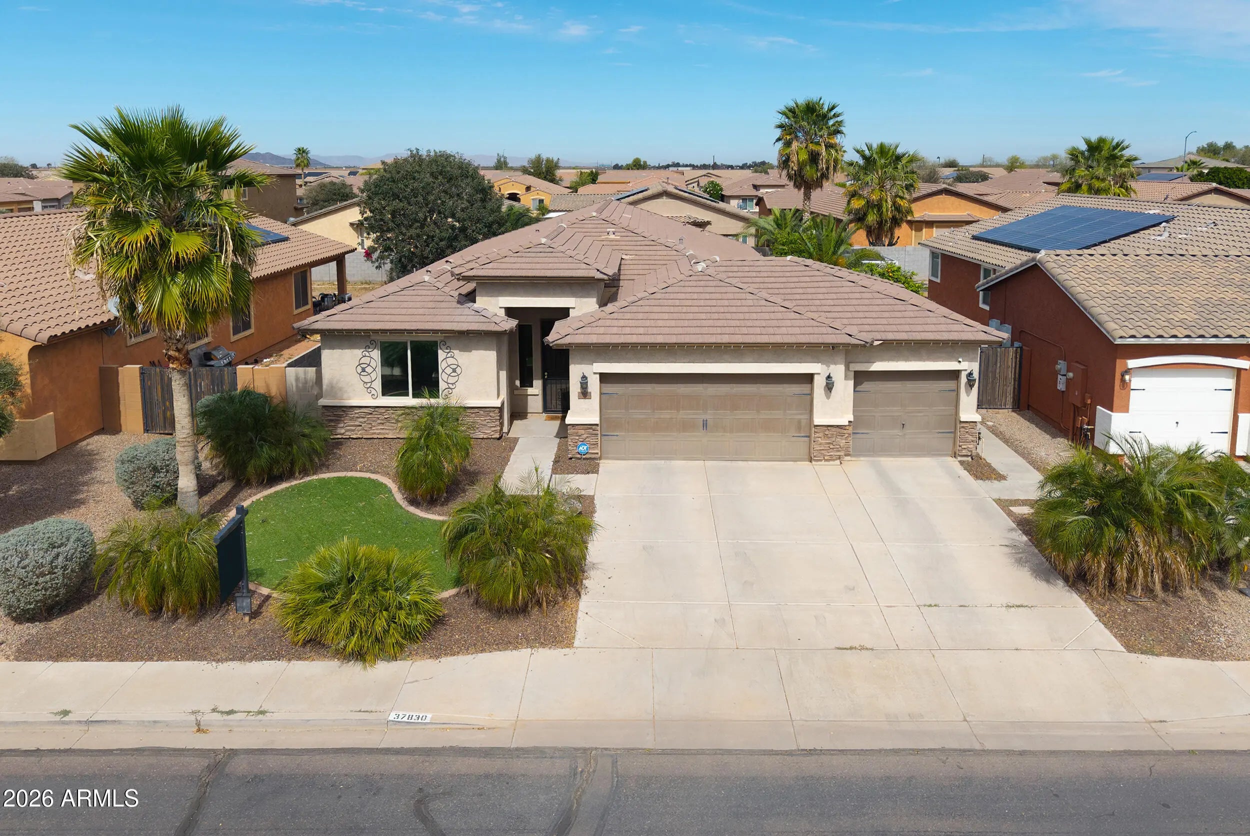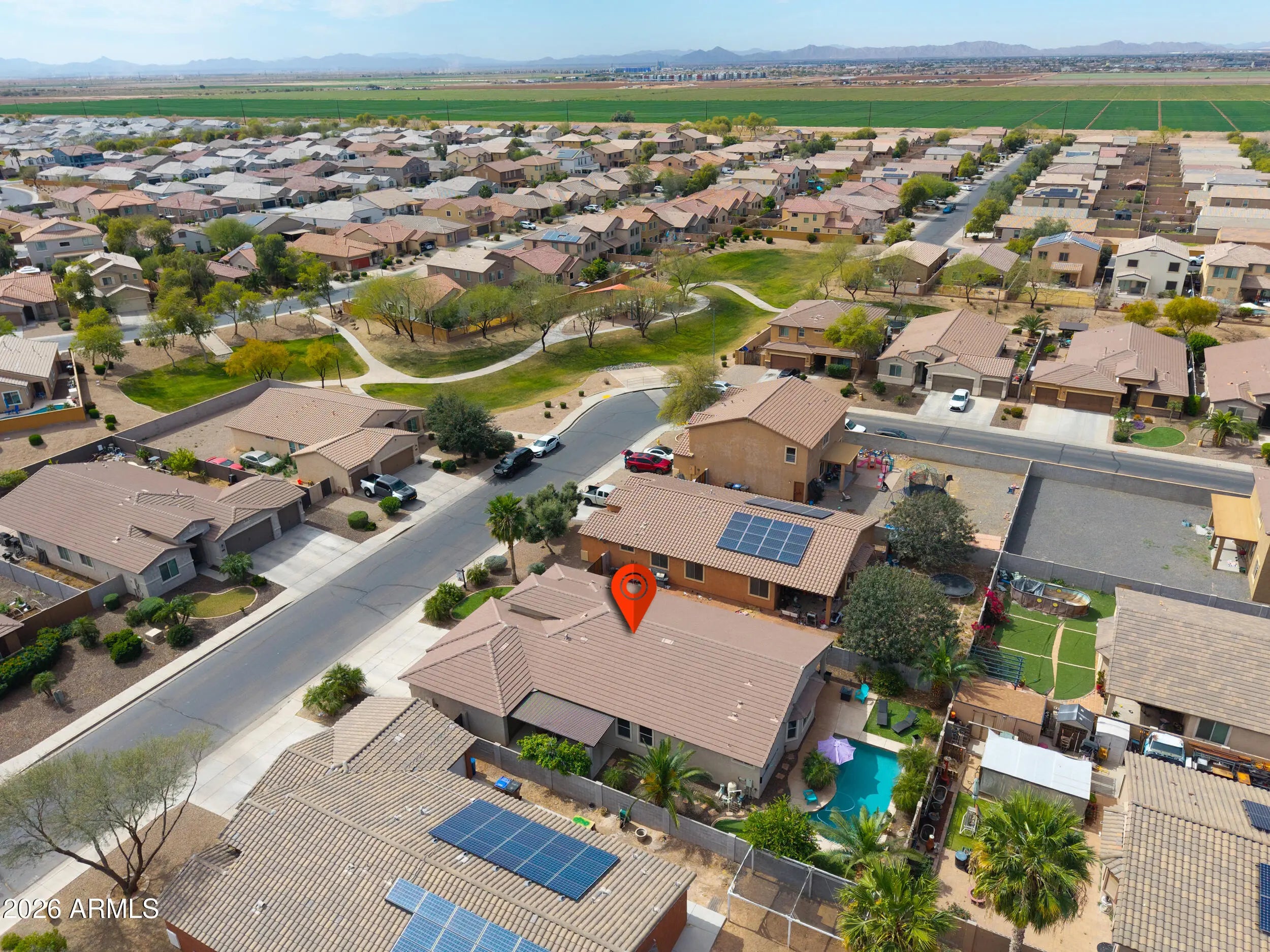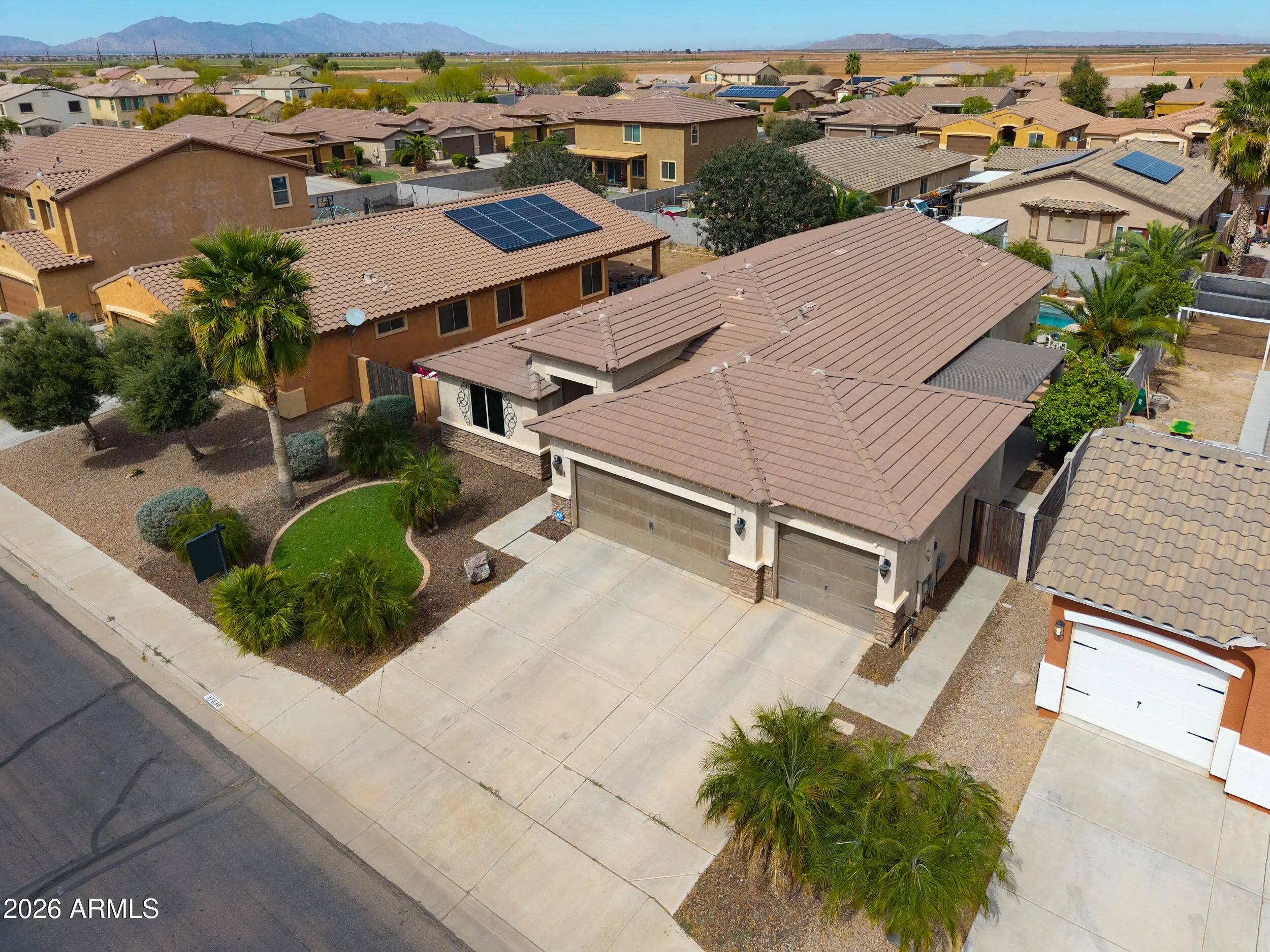 3 CAR PULL-THROUGH GARAGE & POOL! This spacious single level home shows true pride of ownership & features over 2200 sq ft with 4 bedrooms + enclosed den, 3 FULL baths, (with secondary suite), large great room, 3 car garage with pull through to backyard with covered pegola & more! Upgrades include designer paint & 20 inch tile, entertainer's kitchen with Espresso cabinetry, granite countertops, SS appliances, double oven & tile backsplash & stunning upgrades throughout! Palatial master features custom walkin closet & ensuite with oversized walkin shower & dual sinks! Step into the backyard oasis with SPARKLING POOL, artificial turf &citrus trees! Conveniently located in Maricopa's premier community of Rancho Mirage with lake, tot lots, walking & biking paths & close to schools & shopping!