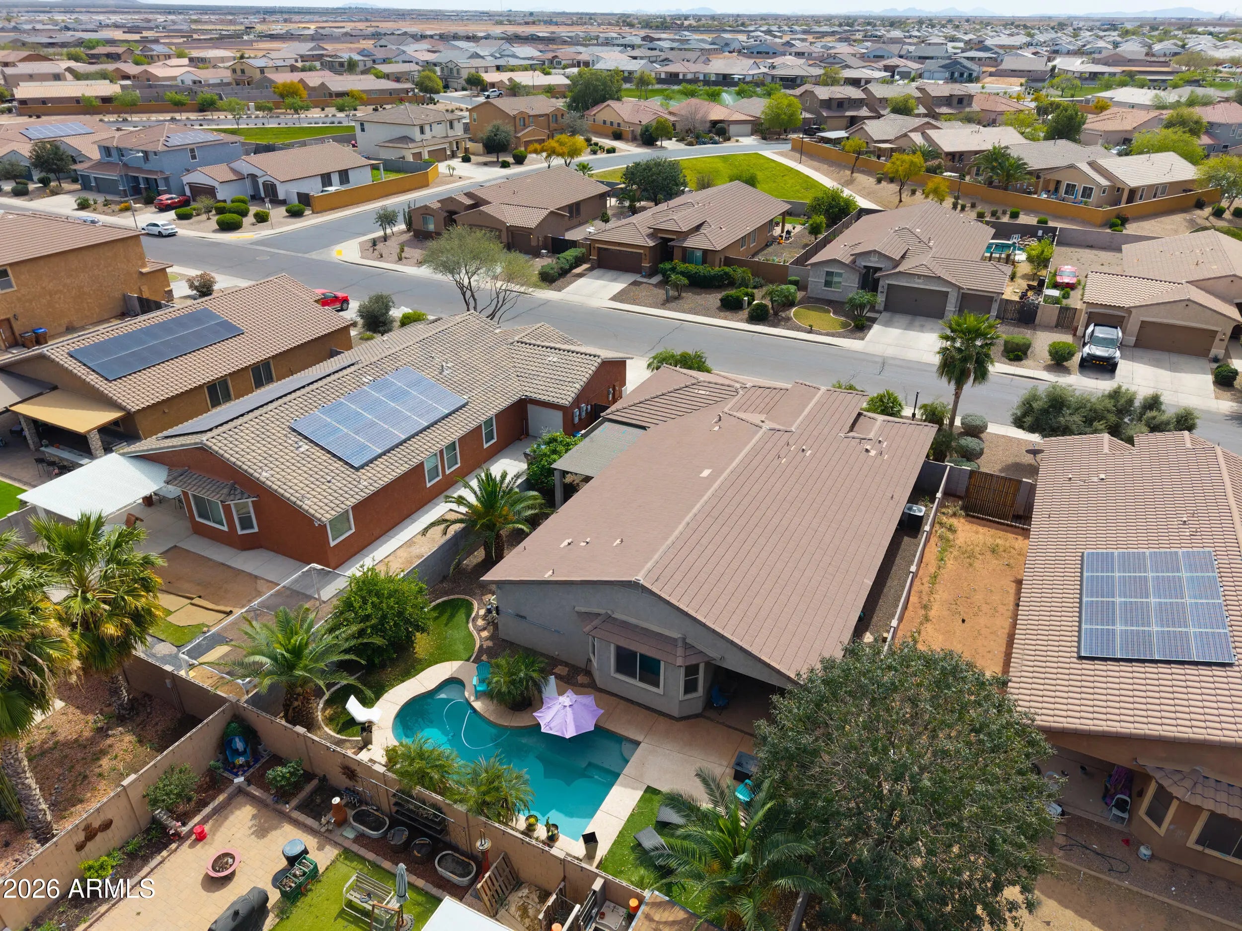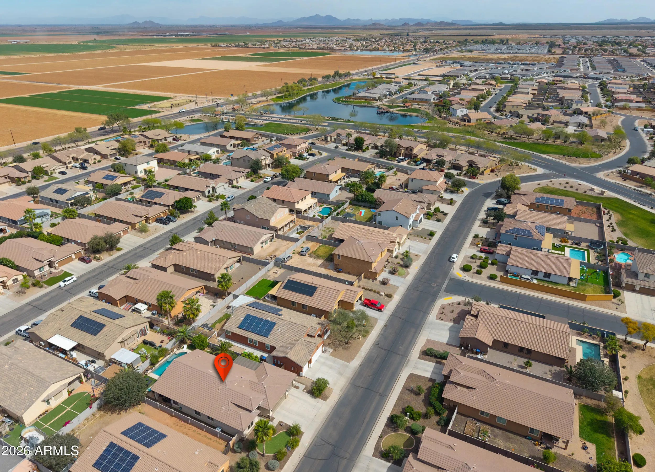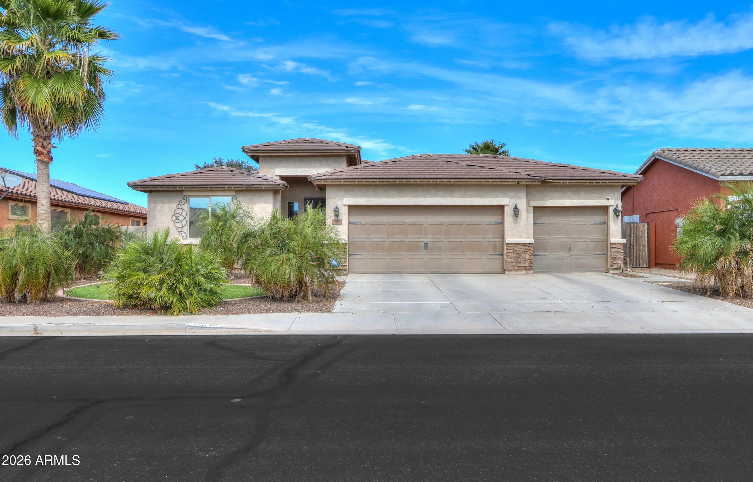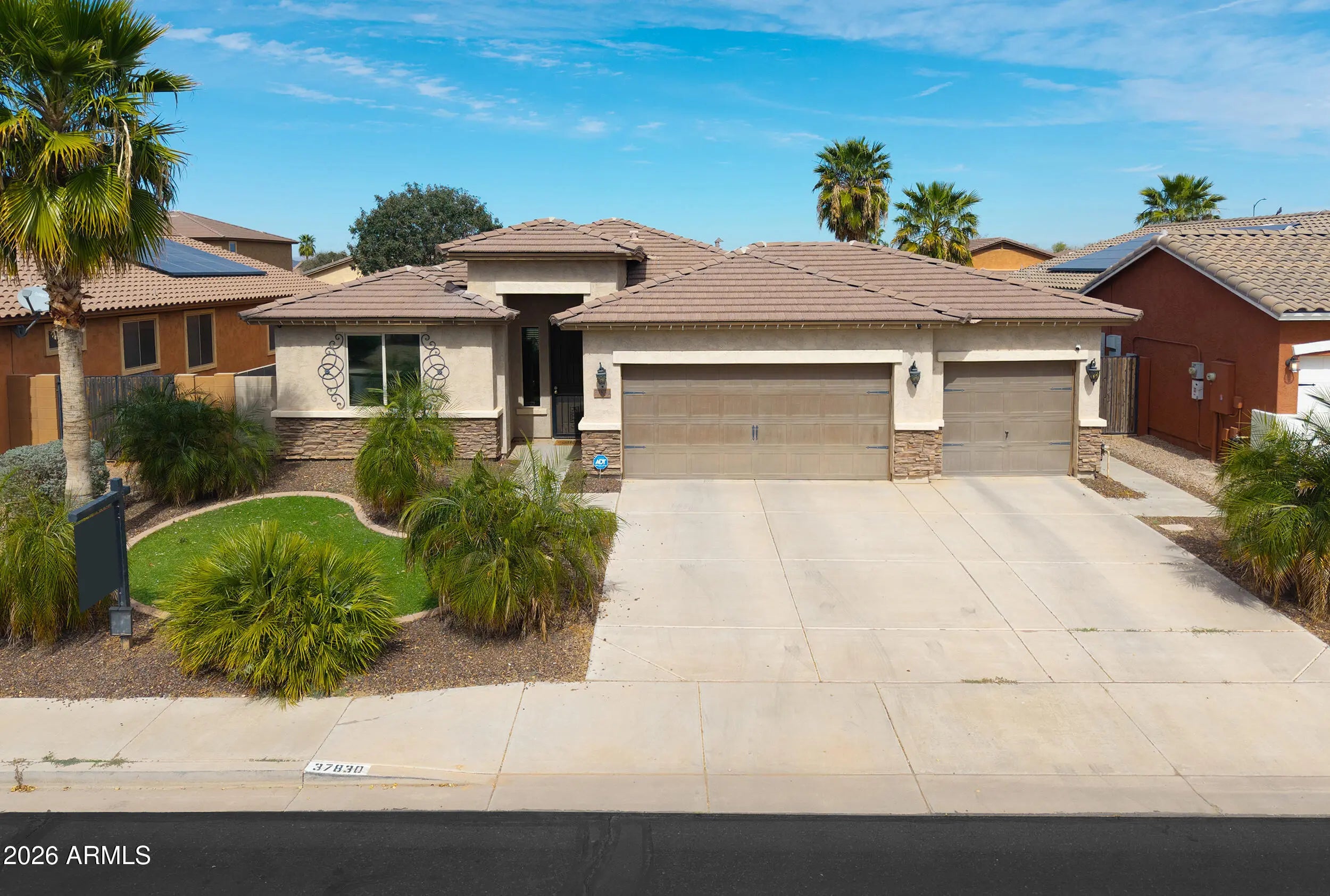 3 CAR PULL-THROUGH GARAGE & POOL! This spacious single level home shows true pride of ownership & features over 2200 sq ft with 4 bedrooms + enclosed den, 3 FULL baths, (with secondary suite), large great room, 3 car garage with pull through to backyard with covered pegola & more! Upgrades include designer paint & 20 inch tile, entertainer's kitchen with Espresso cabinetry, granite countertops, SS appliances, double oven & tile backsplash & stunning upgrades throughout! Palatial master features custom walkin closet & ensuite with oversized walkin shower & dual sinks! Step into the backyard oasis with SPARKLING POOL, artificial turf &citrus trees! Conveniently located in Maricopa's premier community of Rancho Mirage with lake, tot lots, walking & biking paths & close to schools & shopping!