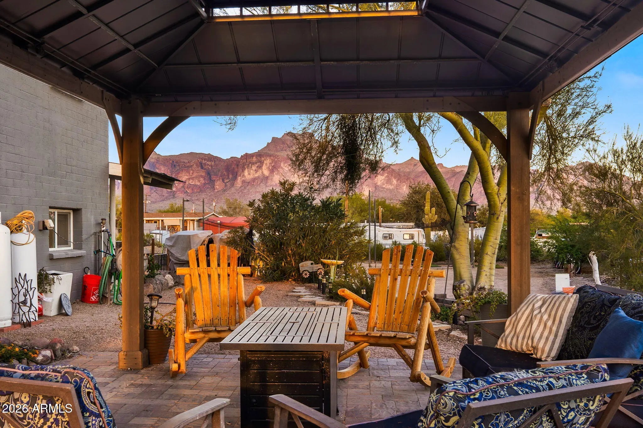 Welcome to life in Apache Junction, one of the Valley's most exciting places to live for outdoor lovers. Set beneath the breathtaking backdrop of the legendary Superstition Mountains, this community offers incredible desert scenery and endless opportunities to explore. From your doorstep you're just minutes from Canyon Lake, along with miles of hiking, biking, and riding trails that wind through some of Arizona's most beautiful landscapes. Set in the heart of this incredible location is the opportunity to own 2.5 acres with room to breathe, roam, and create the lifestyle you've been dreaming about. The beautifully remodeled main home offers comfortable living with thoughtful updates throughout, including beautiful maple floors that bring warmth and character to the living spaces. The property also features a separate two bedroom casita complete with its own kitchen, full bathroom, and private entrance, ideal for multi generational living, extended guests, or additional income potential. Both the main home and casita are solid block construction and feature newer dual pane windows for energy efficiency and comfort. Step outside and enjoy your own retreat featuring a two year old saltwater pool with upgraded Pentair equipment and a Baja shelf for easy entry, creating the perfect place to relax and cool off during Arizona's sunny days. The property is designed for flexibility and convenience with two full laundry rooms, making everyday living for multiple households simple and functional. The outdoor space offers even more to love. A large garden area provides plenty of room to grow your own produce, while the property is already home to apple, peach, apricot, plum, lemon, grapefruit, and orange trees, creating your own private orchard. There is also a chicken coop, making it easy to enjoy fresh eggs and a more self sufficient lifestyle right at home. For sports and recreation, the property even includes a batting cage, perfect for practice, play, and outdoor fun. With 2.5 acres, there is still plenty of room for horses, additional structures, recreational vehicles, or whatever fits your lifestyle. Properties that offer this combination of land, mountain views, updated living spaces, and a separate casita are truly special in Apache Junction. Come experience the space, views, and flexibility this property offers and imagine the possibilities of making it your own.