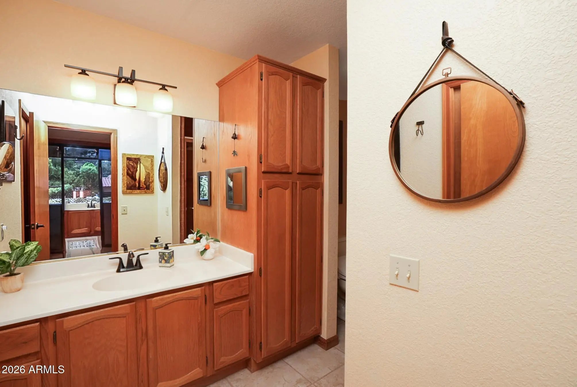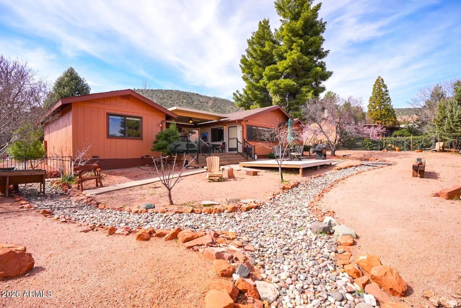 Nestled in a tranquil enclave in the Village of Oak Creek, this home offers a front-row seat to Sedona's iconic red rock vistas. Experience the magic as you settle into this beautifully situated and appointed home. The interior flows seamlessly from a spacious tiled and oak-accented kitchen with sun-drenched breakfast nook into a grand dining and great room. Defined by vaulted ceilings, wood-casement windows, abundant natural light and surrounding red rock views, the room is exceptionally conducive both to entertaining or just relaxing. A versatile bonus room off the kitchen provides the perfect flex footprint for a dedicated home office, gym, or creative space. The views continue as you move into the primary bedroom and large en suite bathroom with walk in closet, jacuzzi tub and commode bidet. Guest amenities include a large second bedroom and adjoining guest bathroom. Step outside to stunning red rock views and a dual-deck oasis. Whether you're hosting a BBQ in the expansive, fenced backyard, stargazing from the open-air deck, or enjoying your morning coffee or an evening beverage from the cozy covered deck, this property blends low-maintenance living with access to world-class hiking, golf, shopping and dining. The always needed two-car attached garage has ample built in cabinetry for storage. This sweet property, minutes from bubbling Oak Creek, is the desert oasis you've been seeking!
