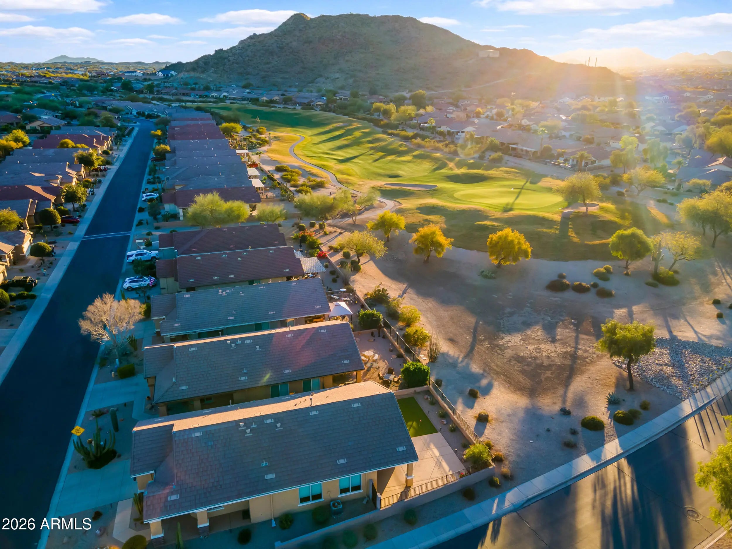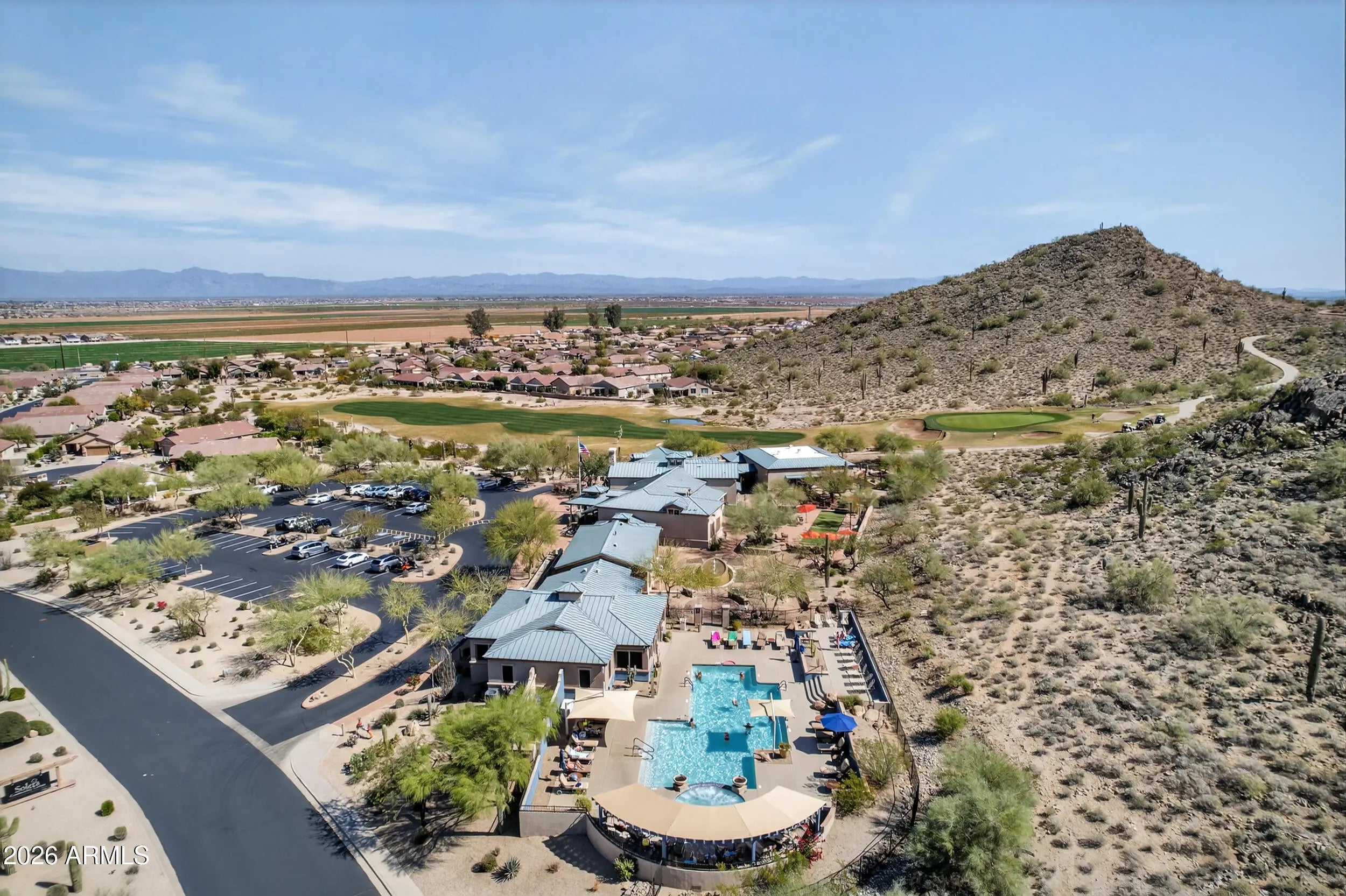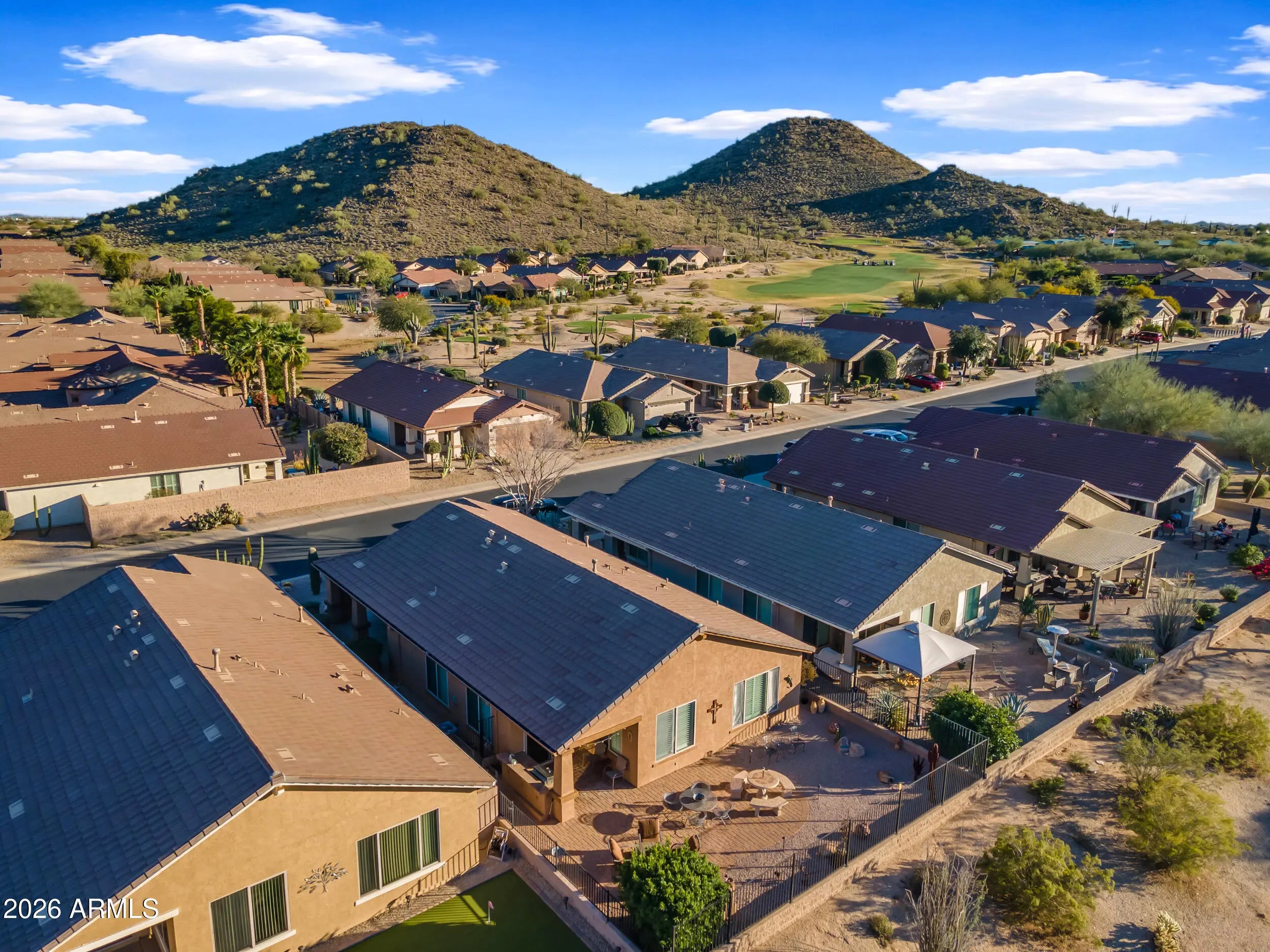 Welcome home to this beautifully maintained Sagebrush model, ideally positioned on a premium golf course, mountain view, and common-area lot. This exceptional home is being offered fully furnished, creating a truly turnkey opportunity for the next owner. The open floor plan includes 2 bedrooms, 2 baths, plus a den and features plantation shutters throughout. The kitchen features Corian countertops, staggered cabinetry, and a breakfast nook. The primary suite has a spacious walk in closet, double sinks, and a separate tub and shower. Step outside to a west-facing backyard overlooking the 5th green of Johnson Ranch Golf Club, where breathtaking Arizona sunsets are part of everyday life. The expanded paver patio is perfect for relaxing or entertaining, complete with a built-in gas BBQ, tranquil fountain, and gas firepit, an ideal setting for enjoying evenings under the desert sky. Located just a short walk from the Solera community center, where residents can enjoy resort-style amenities such as golf, pool, spa, fitness center, billiards, pickleball and many social activities, living a true active 55+ lifestyle. More than just a home, this is a rare opportunity to enjoy a beautifully maintained, fully furnished retreat in the highly desirable Solera at Johnson Ranch community.