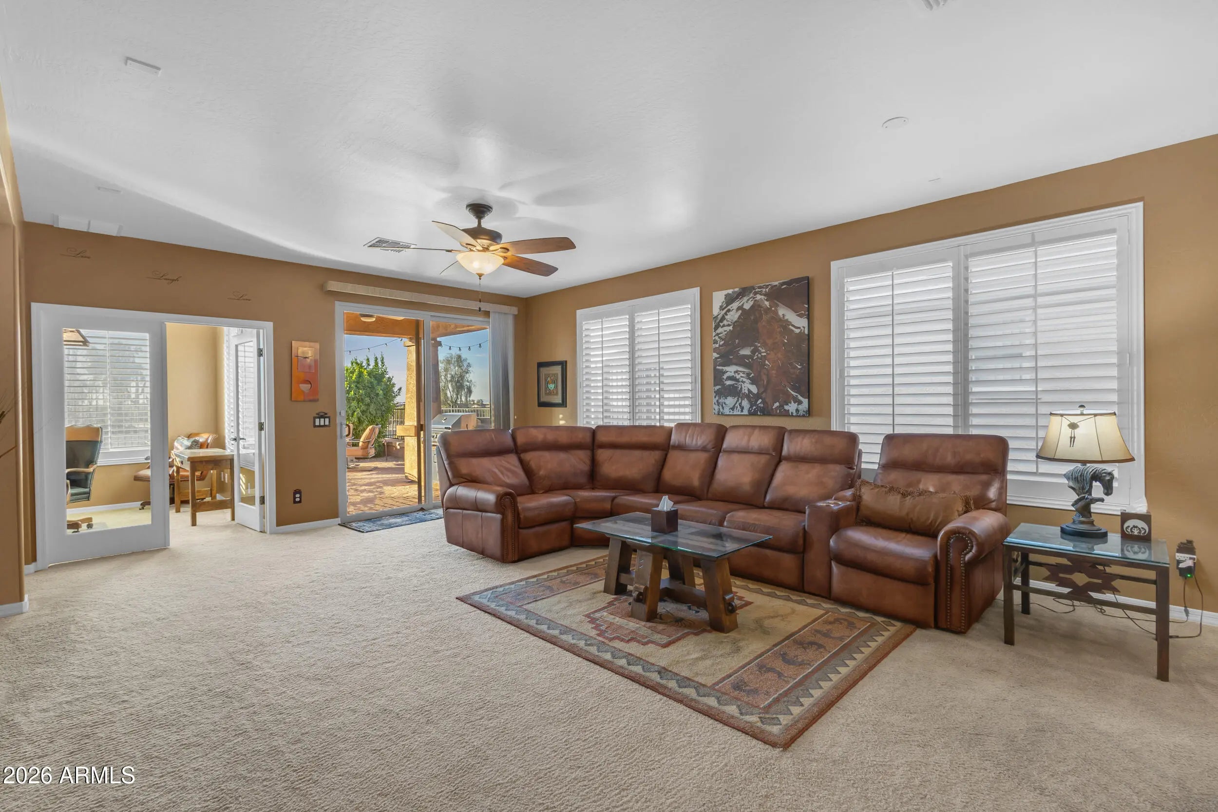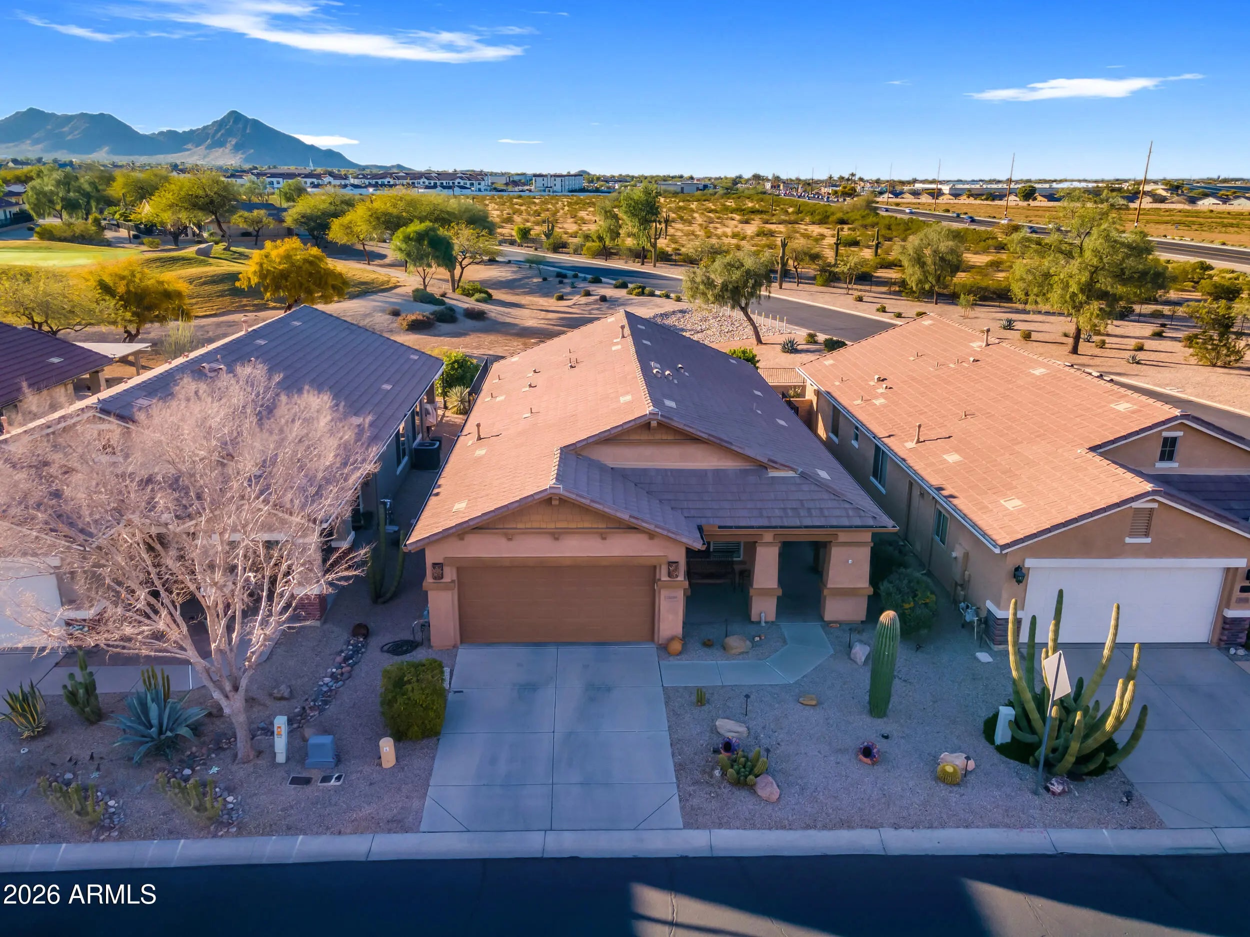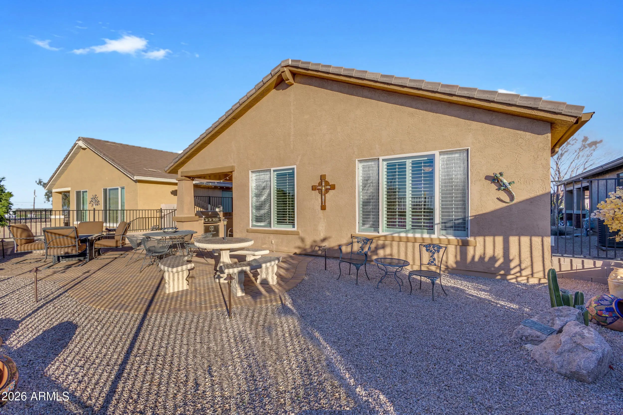 Welcome home to this beautifully maintained Sagebrush model, ideally positioned on a premium golf course, mountain view, and common-area lot. This exceptional home is being offered fully furnished, creating a truly turnkey opportunity for the next owner. The open floor plan includes 2 bedrooms, 2 baths, plus a den and features plantation shutters throughout. The kitchen features Corian countertops, staggered cabinetry, and a breakfast nook. The primary suite has a spacious walk in closet, double sinks, and a separate tub and shower. Step outside to a west-facing backyard overlooking the 5th green of Johnson Ranch Golf Club, where breathtaking Arizona sunsets are part of everyday life. The expanded paver patio is perfect for relaxing or entertaining, complete with a built-in gas BBQ, tranquil fountain, and gas firepit, an ideal setting for enjoying evenings under the desert sky. Located just a short walk from the Solera community center, where residents can enjoy resort-style amenities such as golf, pool, spa, fitness center, billiards, pickleball and many social activities, living a true active 55+ lifestyle. More than just a home, this is a rare opportunity to enjoy a beautifully maintained, fully furnished retreat in the highly desirable Solera at Johnson Ranch community.