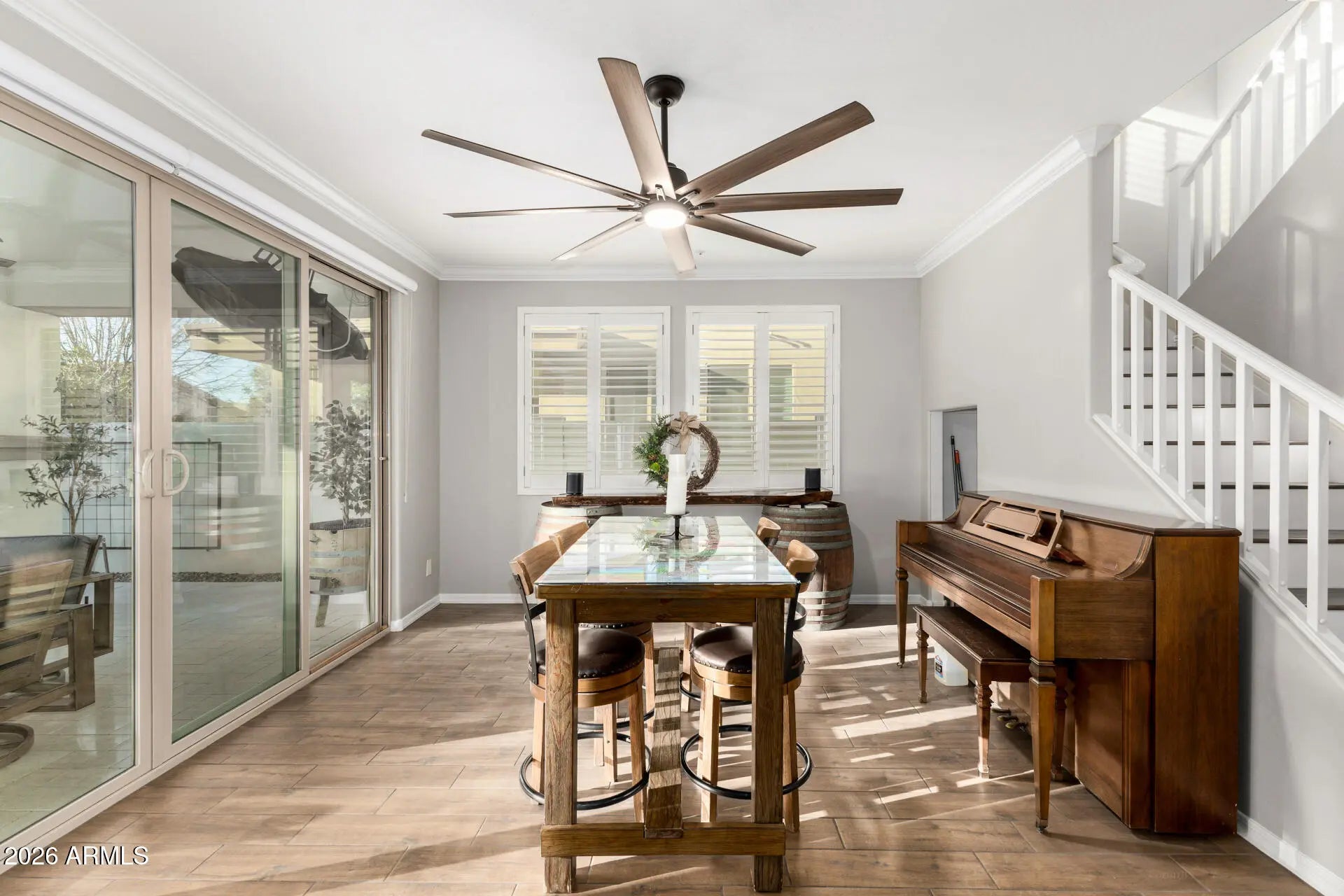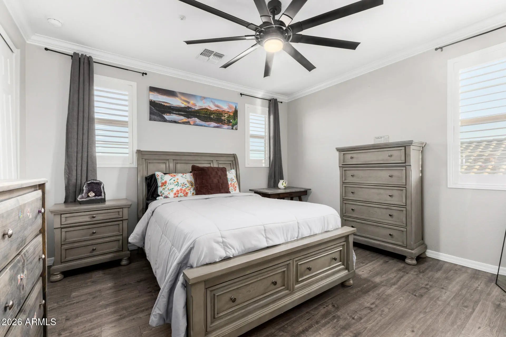 This gorgeous 4-bedroom home is truly a dream come true! A 3-car garage & professional landscaping enhance its curb appeal. Thoughtfully designed interior exudes comfort & style at every turn. Spacious open floor plan showcases wood-look tile flooring, plantation shutters, crown moulding, abundant natural light & ceiling fans throughout. Gourmet kitchen is a chef's delight, fully equipped w/ high-end stainless steel appliances, tile backsplash, designer cabinetry, quartz counters & a large island w/ breakfast bar. Upstairs, the flexible loft can easily serve as a playroom or office. Romantic main retreat offers a functional barn door leading to the ensuite, soaking tub, floor-to-ceiling tiled shower & walk-in closet. Step out to the Entertainers Dream Backyard Pool Oasis w/ OWNED solar! PLUS! Wonderful backyard is made for entertaining, boasting a covered patio, gazebos, and an enticing pool with water features. This gem is sure to impress!
