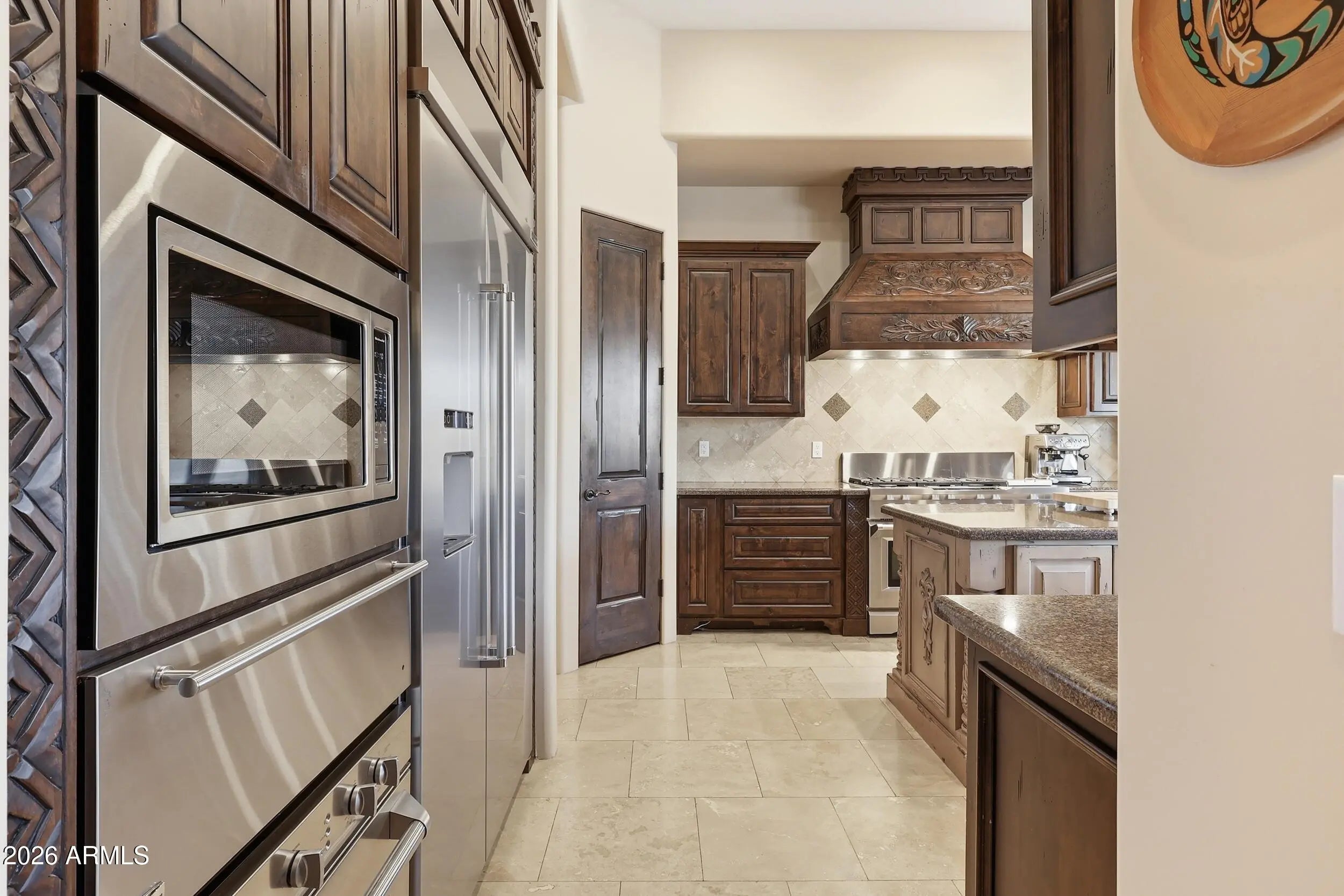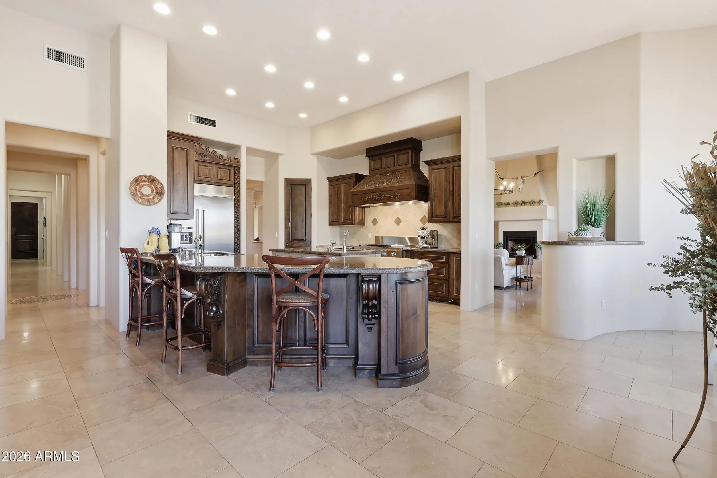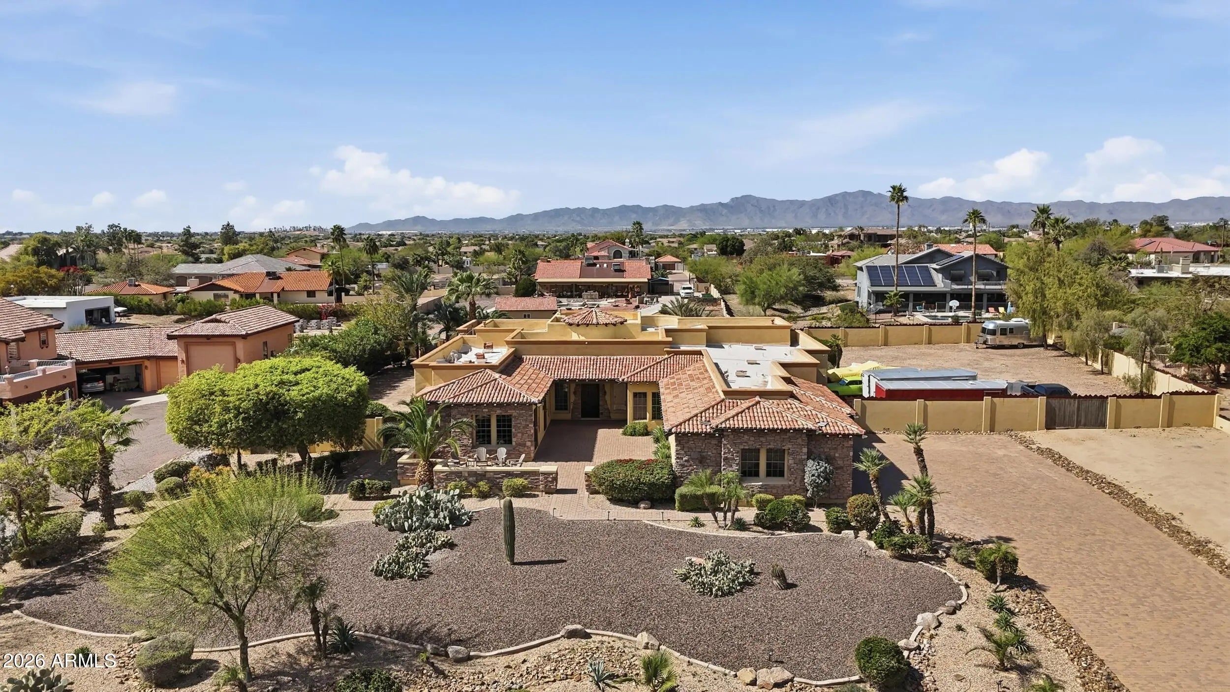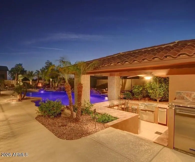 Stunning custom estate is your own private oasis at end of a quiet street on an elevated one-acre lot with sweeping mountain and city views in desirable Litchfield Park*Rich architectural details include exposed beams, warm natural finishes, and inviting spaces throughout. The chef's kitchen features a built-in refrigerator, double wall ovens, six-burner gas range, oversized island with prep sink, and walk-in pantry*Split primary bedroom retreat offers a spa bath with jetted tub, walk-in shower, oversized closet, and dedicated washer/dryer**You will love your resort-style backyard with heated pool and spa, rock waterfall, outdoor kitchen pavilion, firepit, and extended covered patio*The expansive acre lot offers space for RV parking, a casita, workshop, or additional garages*