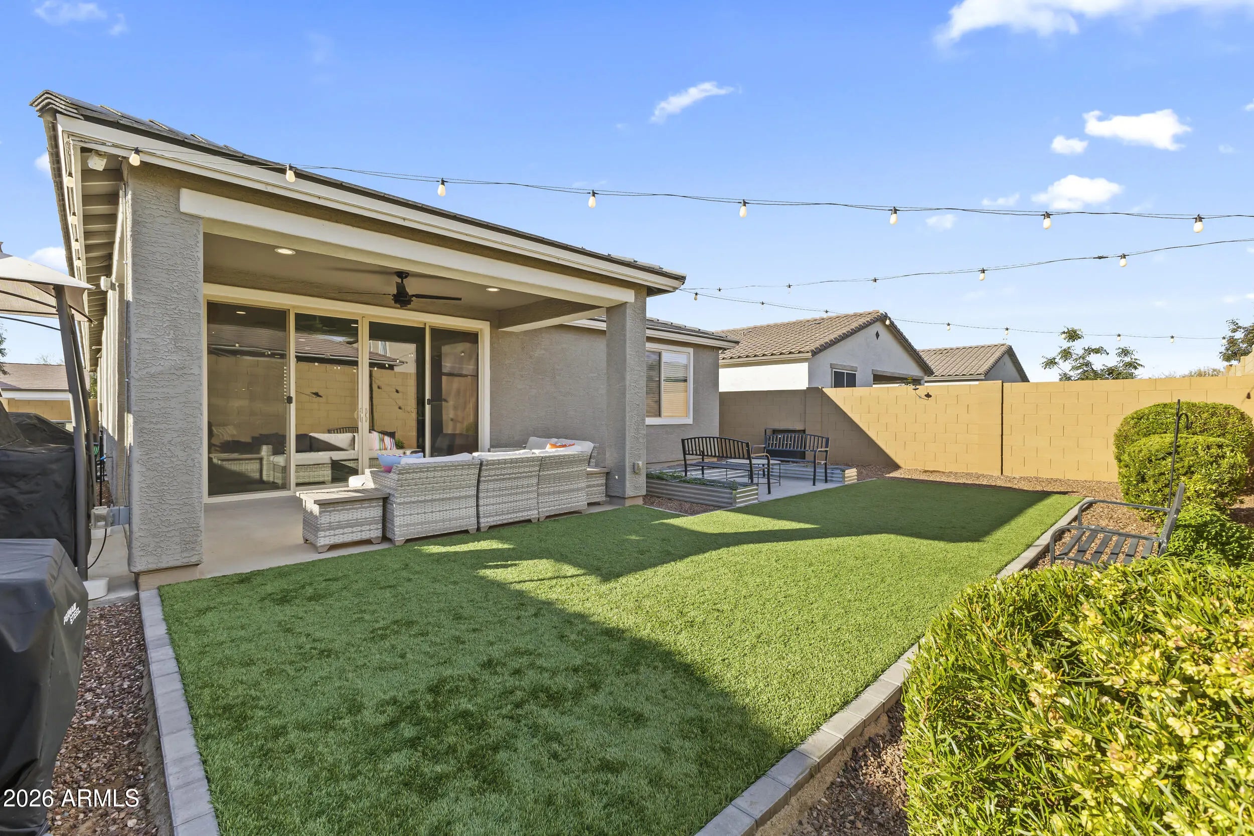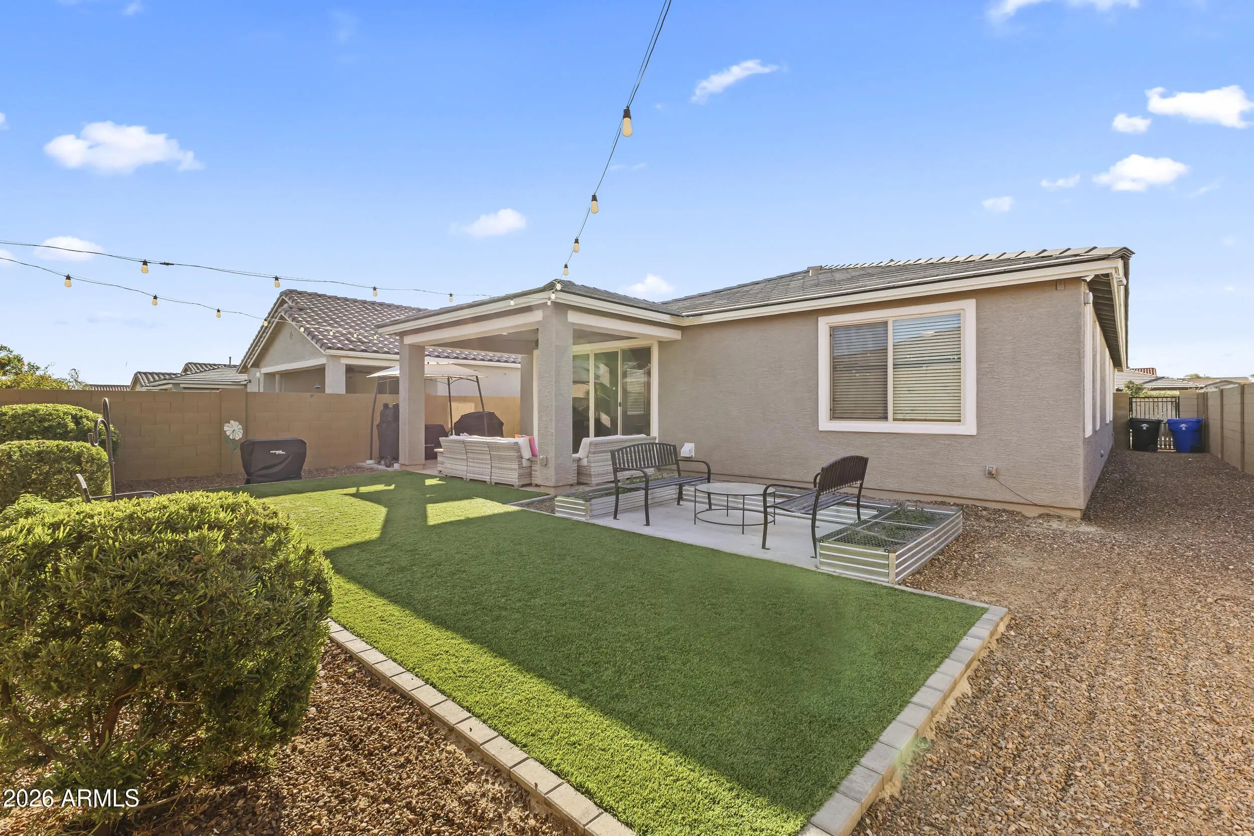 Immaculate 5 bed, 3 bath home in Surprise features open floorplan, tons of storage space & natural light throughout. The kitchen has dark stainless steel appliances, reverse osmosis system, beautiful quartz countertops, breakfast bar & walk-in pantry. The owner's suite has 2 spacious walk-in closets & dual vanity. Outside you'll enjoy desert landscaping, artificial turf in the rear yard, covered patio, separate concrete seating area, raised garden beds & small storage shed. There's also a 2-car garage w/ attached cabinets & utility sink, dry bar w/ wall shelving, laundry room w/ extra storage, water softener system & whole home security system. Located in a great community near lots of shopping, dining & entertainment. Welcome home!