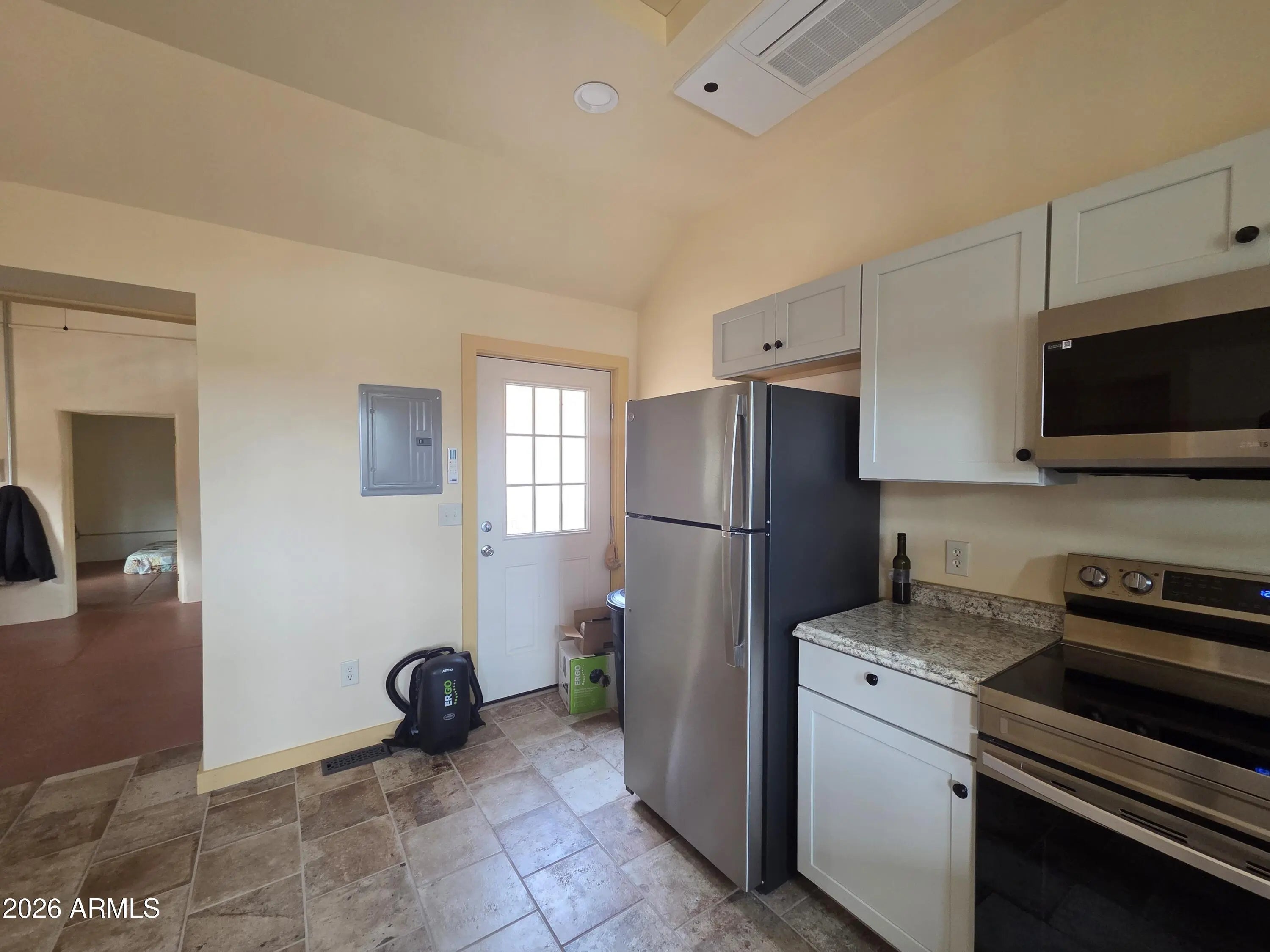 Stacked Washer/Dryer, Dryer, Washer, Refrigerator, Built-in Microwave, Electric Oven