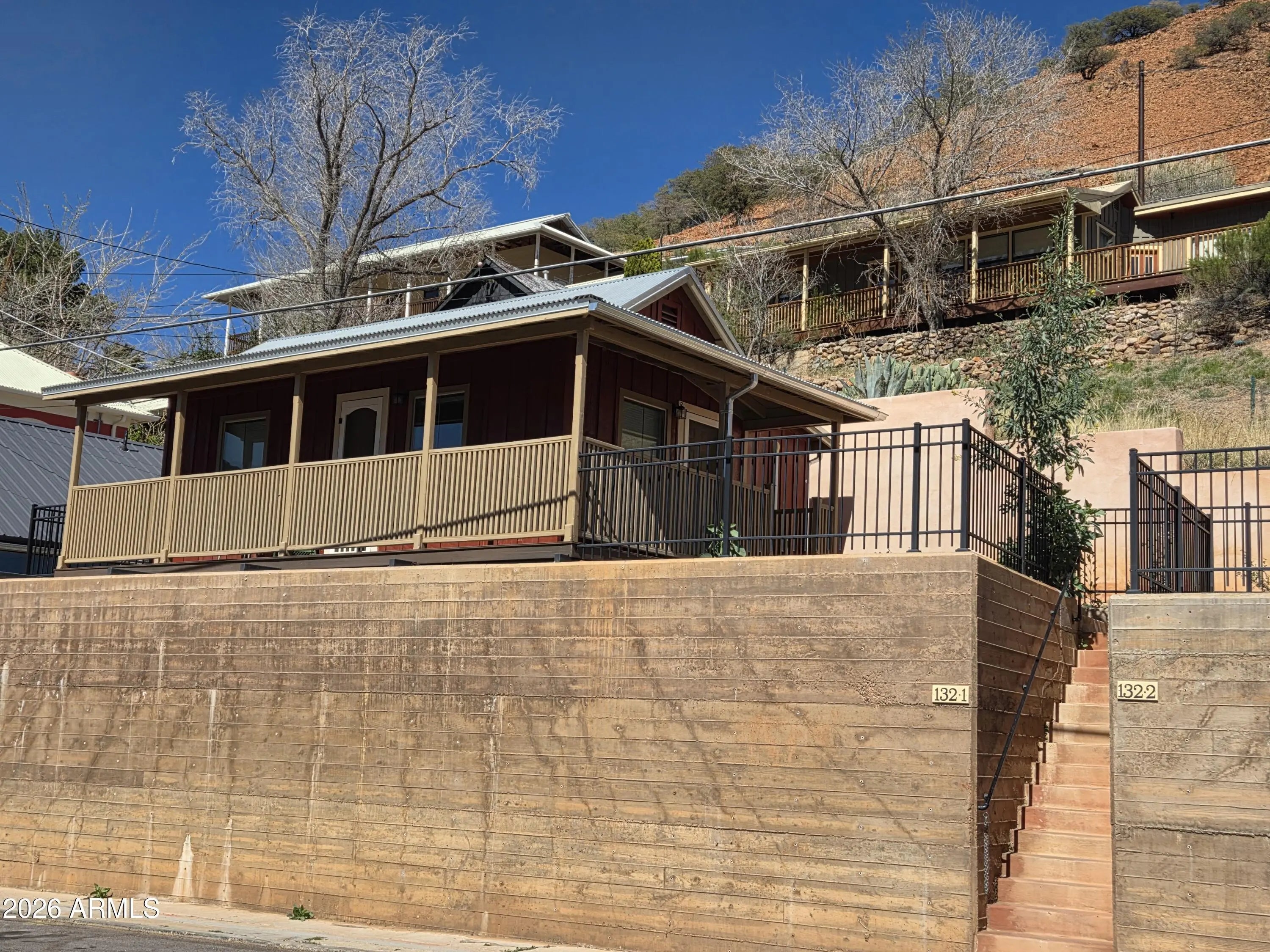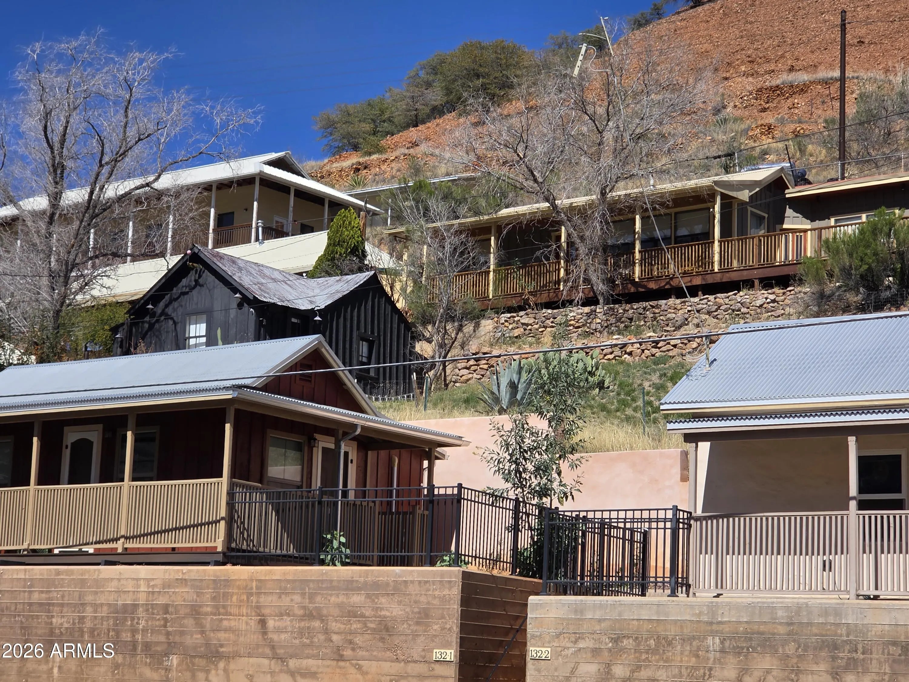 Two charming 19th century miner's cabins, thoroughly renovated and brought up to 2026 building codes and standards. Each house has it's own fenced yard, on a single parcel. Cabins are separately metered. Live in one cabin and rent the other, or guest cabin. Ivory cabin 132-2 is an adobe structure with a framed addition total 598'. Concrete and tile flooring, 2 original beehive non-functioning fire places. 1 bedroom, 1 bath, shower only, side by side washer /dryer. Covered front porch. Red cabin- 132-1, is a framed 415', structure, wood flooring throughout. 1 bedroom, 1bath with tub/shower and stacked w/d. History and modern convenience, with a bird's eye view of the Queen Mine, a scant block from Brewery Gulch, and an easy walk to the rest of the downtown shopping area.