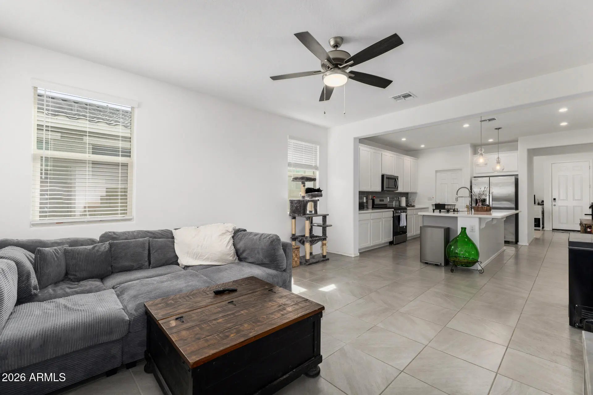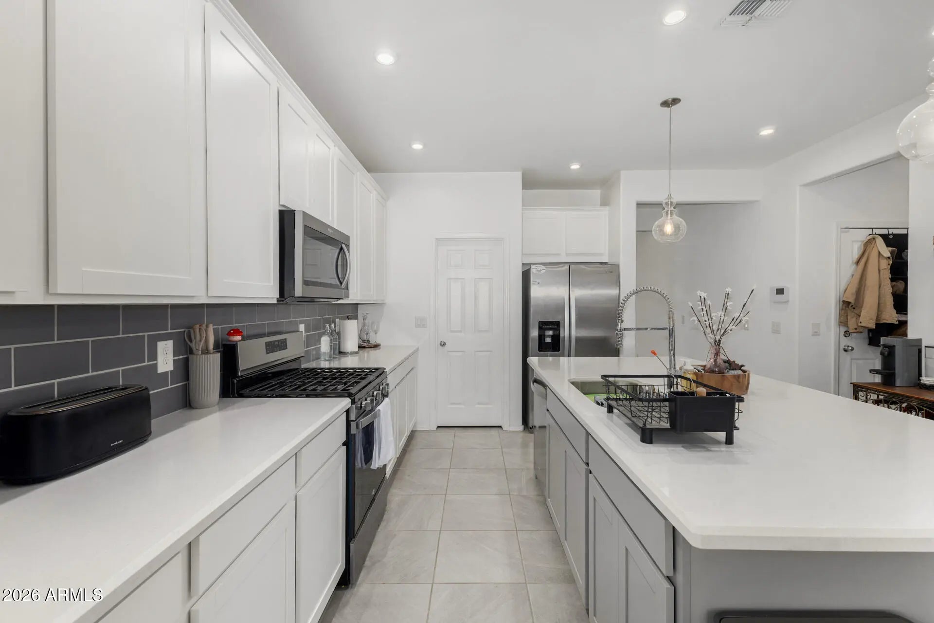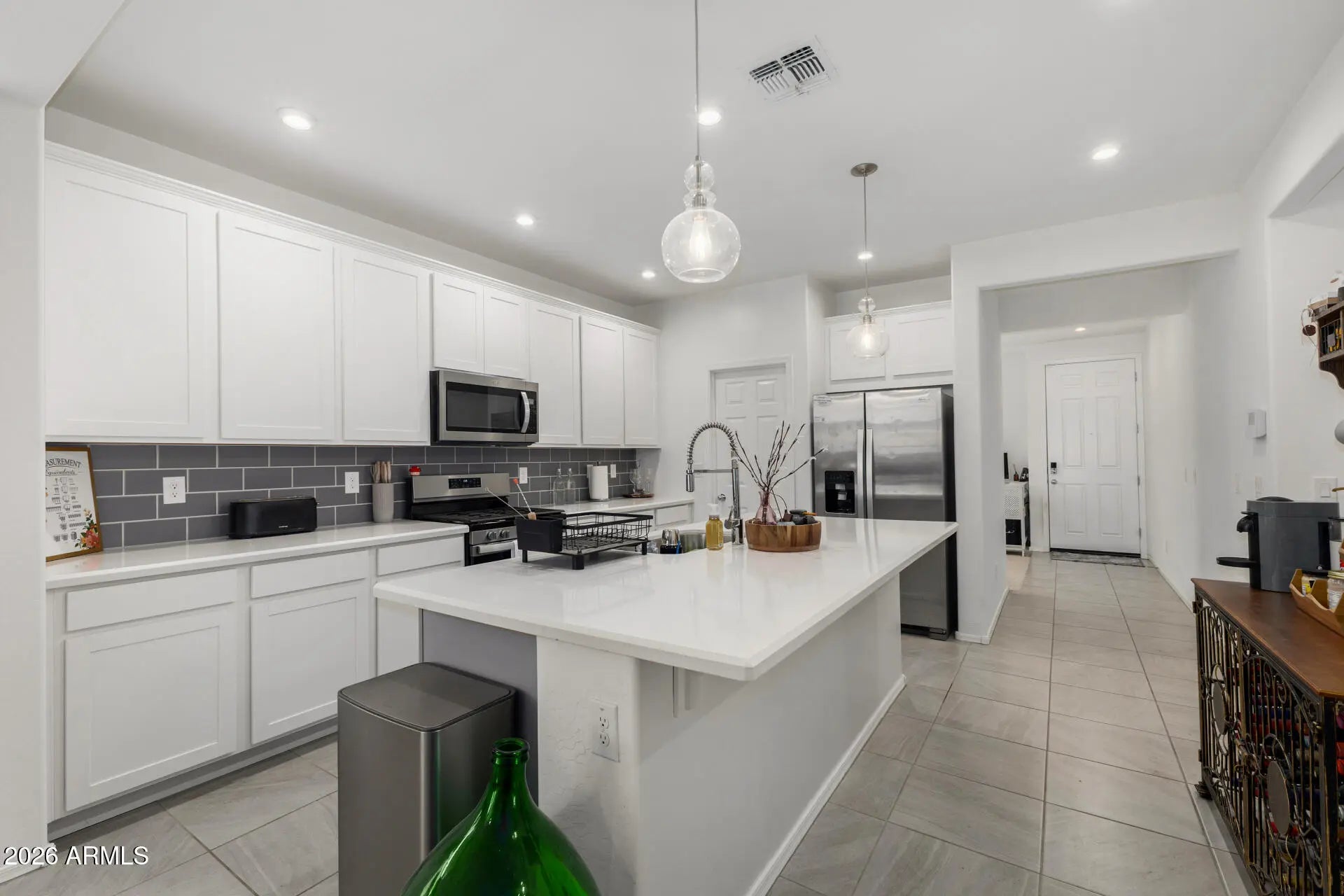 Welcome to your new home in a desirable Litchfield Park neighborhood! This beautifully maintained 3-bedroom, 2-bath home is just a couple years old and offers modern finishes throughout. Enjoy great curb appeal with an inviting, professionally landscaped front yard, all conveniently located directly across from a community park. The upgraded kitchen features quartz countertops and a large island as well as stainless steel Whirlpool appliances, including a convection oven and refrigerator. A Samsung washer and dryer are also included for added convenience. Home has lots of tile throughout except in the two spare bedrooms. Additional highlights include soft water plumbing and Smart Home wiring, providing both comfort and modern functionality.