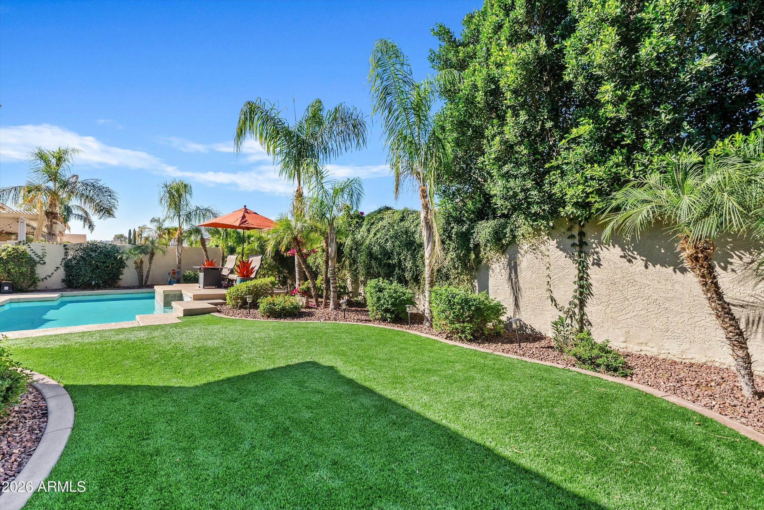 Beautifully updated 4 bedroom plus office, 3 bath home offers the perfect blend of space, functionality and style with sparkling pool. The thoughtfully designed floorplan provides flexible living for everyday comfort and outdoor entertaining. The remodeled kitchen is the heart of the home with granite countertops, refinished cabinets, gas range and double islands which open to the spacious great room with a custom media alcove. Enjoy entertaining in the formal dining room off great room. Recent upgrades include new flooring, baseboards, crown molding, paint and outdoor landscaping. Step outside to your private backyard oasis. Relaxing pool, raised patio, built-in BBQ, covered patio with misting system and synthetic turf. Perfect for entertaining all year long! Situated on a premium corner lot with a 3 car garage, this home offers both privacy and curb appeal in the highly sought after Seville Golf & Country Club. Minutes from the clubhouse.