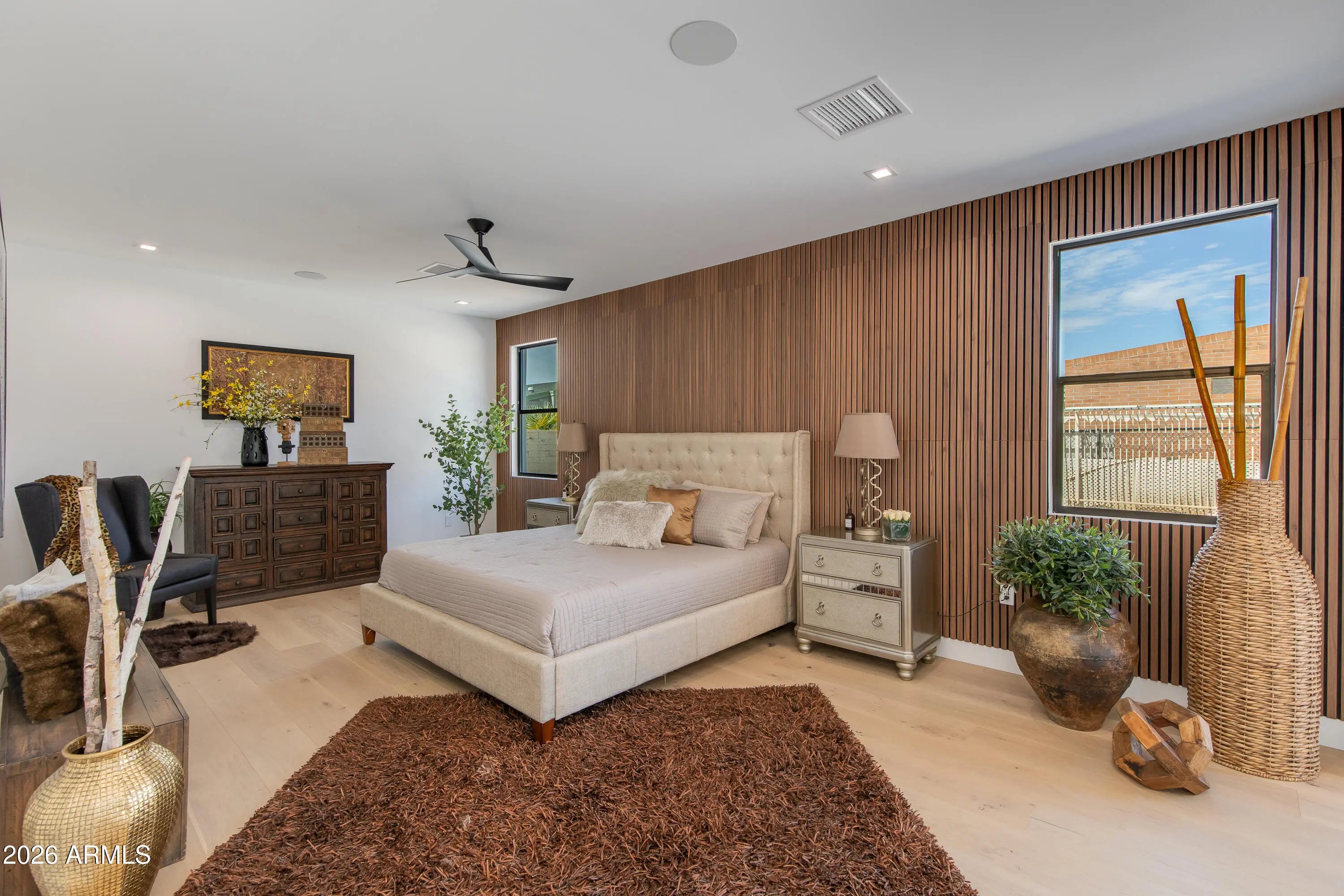Experience the perfect blend of sophisticated design and desert-inspired organic tones in this stunning 2024-modern build. Meticulously constructed from the ground up and designed by a premier architect, this home offers the rare opportunity to own a nearly-new masterpiece in one of Phoenix's most coveted neighborhoods. As you step inside, you are captivated by a gourmet kitchen where vertical subway tiles elegantly line the walls and backsplash. The space flows effortlessly into an inviting living and dining area, anchored by a floor-to-ceiling designer fireplace mantel featuring a smart picture-frame TV that stays with the home. The chef's kitchen is finished with excellence, featuring designer appliances, a gas burner stove, and a large centerpiece island with a deep farmhouse sink. All complemented by beautiful engineered flooring that runs throughout the home. The thoughtful split floor plan ensures maximum privacy, with the primary suite occupying the left wing of the home and boasting modern touches and a large walk-in closet. Practicality meets luxury with a spacious pantry and a dedicated laundry room featuring ample counter space, a sink, and a convenient side entrance. On the right side of the home, you'll find three versatile rooms, including one en-suite guest room and a flexible middle room perfect for a nursery, home office, or game room. The transition to outdoor living is seamless through large glass sliders leading to over 600 sq ft of covered patio space ideal for entertaining. The backyard oasis features a built-in BBQ with a utility sink and a completely re-plastered pool with new pipes and built-in seating. Additionally, the spacious side yard offers room for an RV, boat, or extra vehicle storage. To end each day, you'll pull into a garage with recently finished epoxy flooring and a large tankless water heater for endless hot water. The front yard captures the true essence of Arcadia living, offering a perfect spot to take in the beautiful red rock views of Camelback Mountain. This is a rare opportunity to find a newer home in an area surrounded by homes selling over $2.5M+. Welcome to your new home, where modern luxury meets timeless charm.