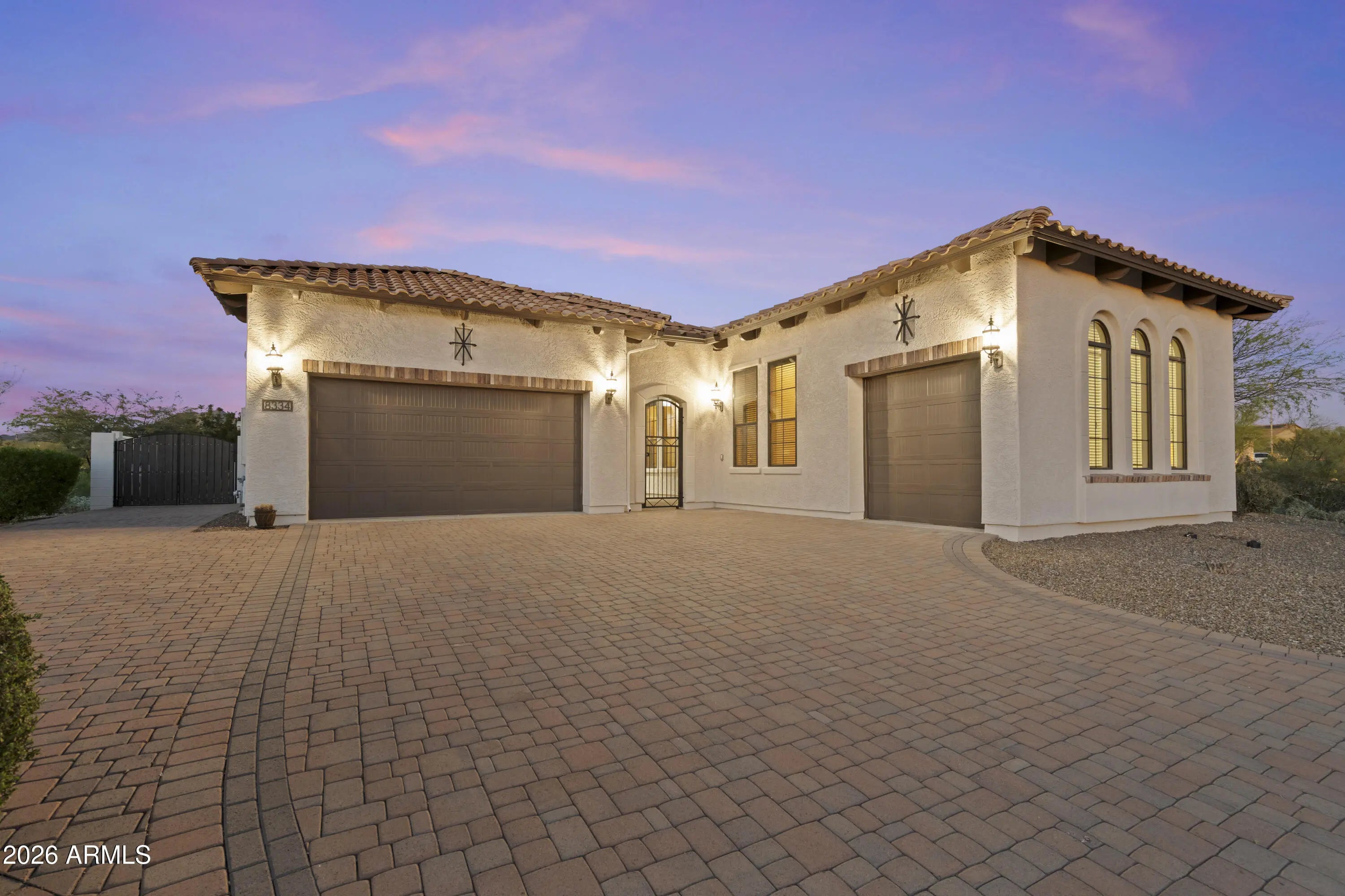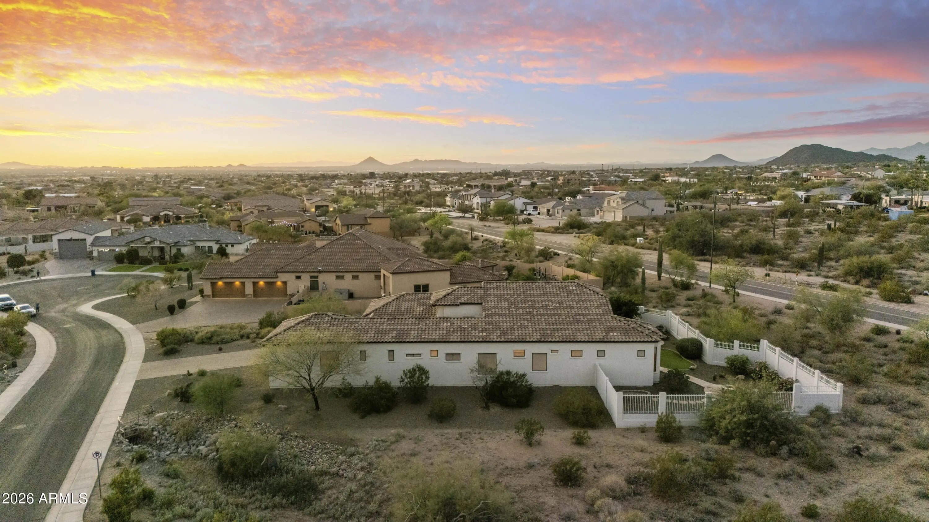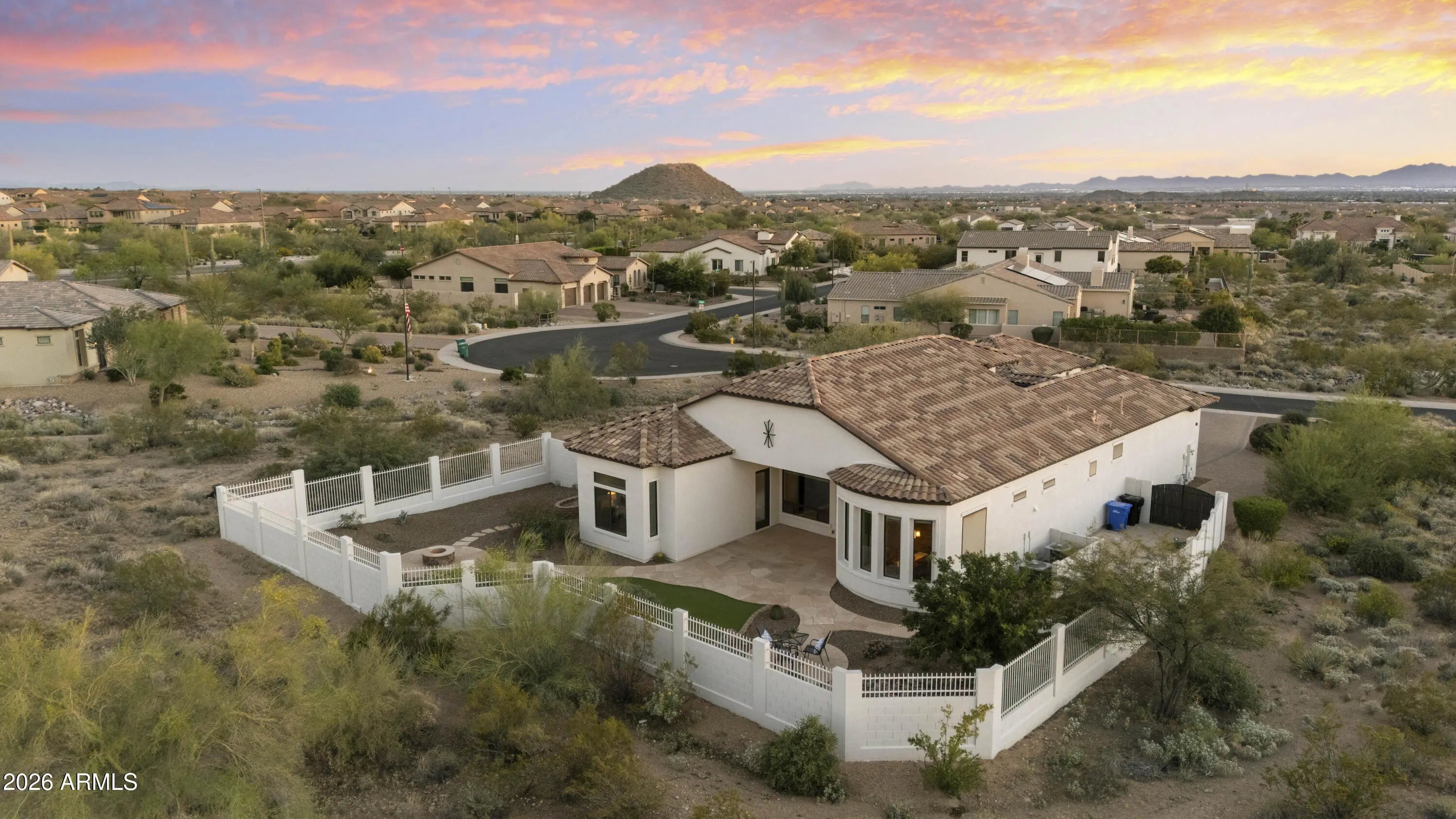 Stunning home nestled in the prestigious Hermosa Estates, set on over a ¾-acre premium lot surrounded by natural washes that provide exceptional privacy. Offering 3 bed 3.5 bath and a versatile bonus room with its own private entrance - perfect for multigenerational living, a guest suite, home office, or gym room. An expansive paved driveway leads to a charming, gated courtyard. Inside, soaring ceilings, graceful archways, and expansive windows create a bright and inviting atmosphere filled with natural light.The heart of the home is the chef's kitchen, thoughtfully designed with beautiful alder cabinetry, built-in refrigerator/freezer, gas cooktop, abundant counter space, and a large sit-up island. The kitchen opens seamlessly to a breakfast room with elegant bay windows that frame serene backyard views. A separate dining room offers versatile space and could easily be used as a den or office. The spacious great room is ideal for both everyday living and entertaining. The split open floor plan offers a spacious primary suite complete with a spa-like bathroom featuring dual sinks, soaking tub, separate shower, and a large walk-in closet. Each bedroom is designed with comfort in mind, offering its own ensuite bathroom and walk-in closet. Bedroom 3 is exceptionally large and includes an additional bonus room, ideal for a private casita, multi-generational living, guest suite or a separate den, gym, or office with its own private entrance. Step outside to your serene private backyard with beautiful mountain views and breathtaking sunsets. Covered patio, a tranquil water feature, artificial turf, and an RV gate. Located just moments from some of the best hiking and biking trails, the Tonto National Forest, championship golf, and the Salt River recreation areas, this home offers the perfect balance of outdoor adventure and peaceful living. Dining, shopping, and convenient Loop 202 access are just minutes away, while Sky Harbor Airport and Scottsdale are only about 20 minutes away.
