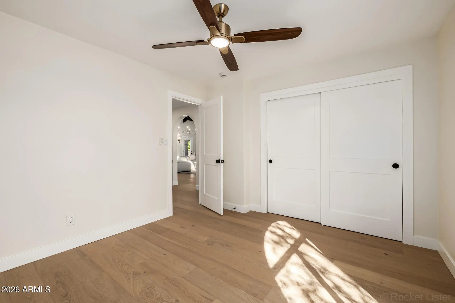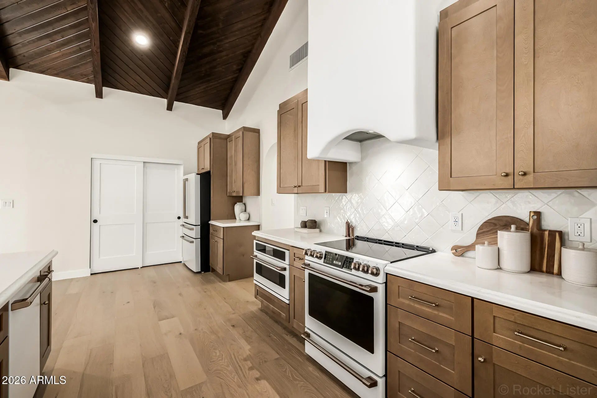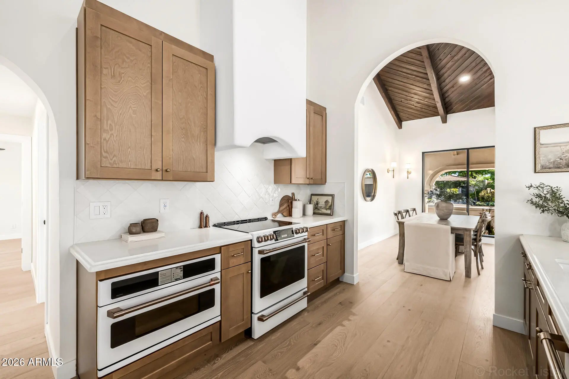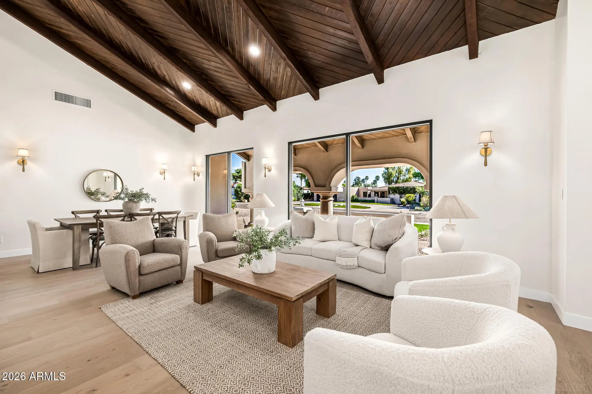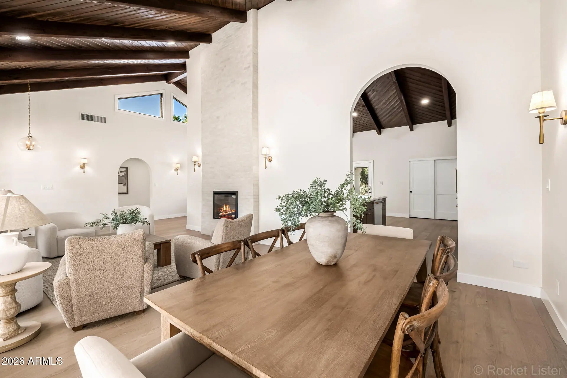Completely renovated McCormick Ranch home tucked away on a quiet cul-de-sac with no neighbors behind. This move-in ready residence offers exceptional curb appeal with a grassy front yard, charming front porch, extended driveway, RV gate, and 2-car garage. Inside, the bright minimalist-inspired interior features rich wood flooring, vaulted wood-beam ceilings, clerestory windows, thick baseboards, modern lighting, and elegant architectural details throughout. The inviting living and dining spaces center around a cozy fireplace, while the spacious family room showcases a dramatic 3-panel sliding pocket door that creates seamless indoor-outdoor living. The beautifully updated kitchen is designed for both everyday living and entertaining, featuring high-end appliances, custom wood cabinetry.. quartz countertops, tile backsplash, pantry storage, and a large peninsula with breakfast bar seating. The open layout allows the kitchen and family room to flow effortlessly together, creating an ideal gathering space for friends and family. The private backyard offers a peaceful retreat with no rear neighbors, providing additional privacy and space to relax or entertain. Whether enjoying quiet mornings on the patio or hosting evening get-togethers, the indoor-outdoor connection makes this home perfect for Arizona living. Located in the highly desirable McCormick Ranch community, residents enjoy access to miles of scenic walking and biking paths, lakes, parks, golf courses, and nearby dining and shopping. With its thoughtful renovation, timeless finishes, and unbeatable location, this home offers the perfect combination of style, comfort, and lifestyle in one of Scottsdale's most sought-after neighborhoods.