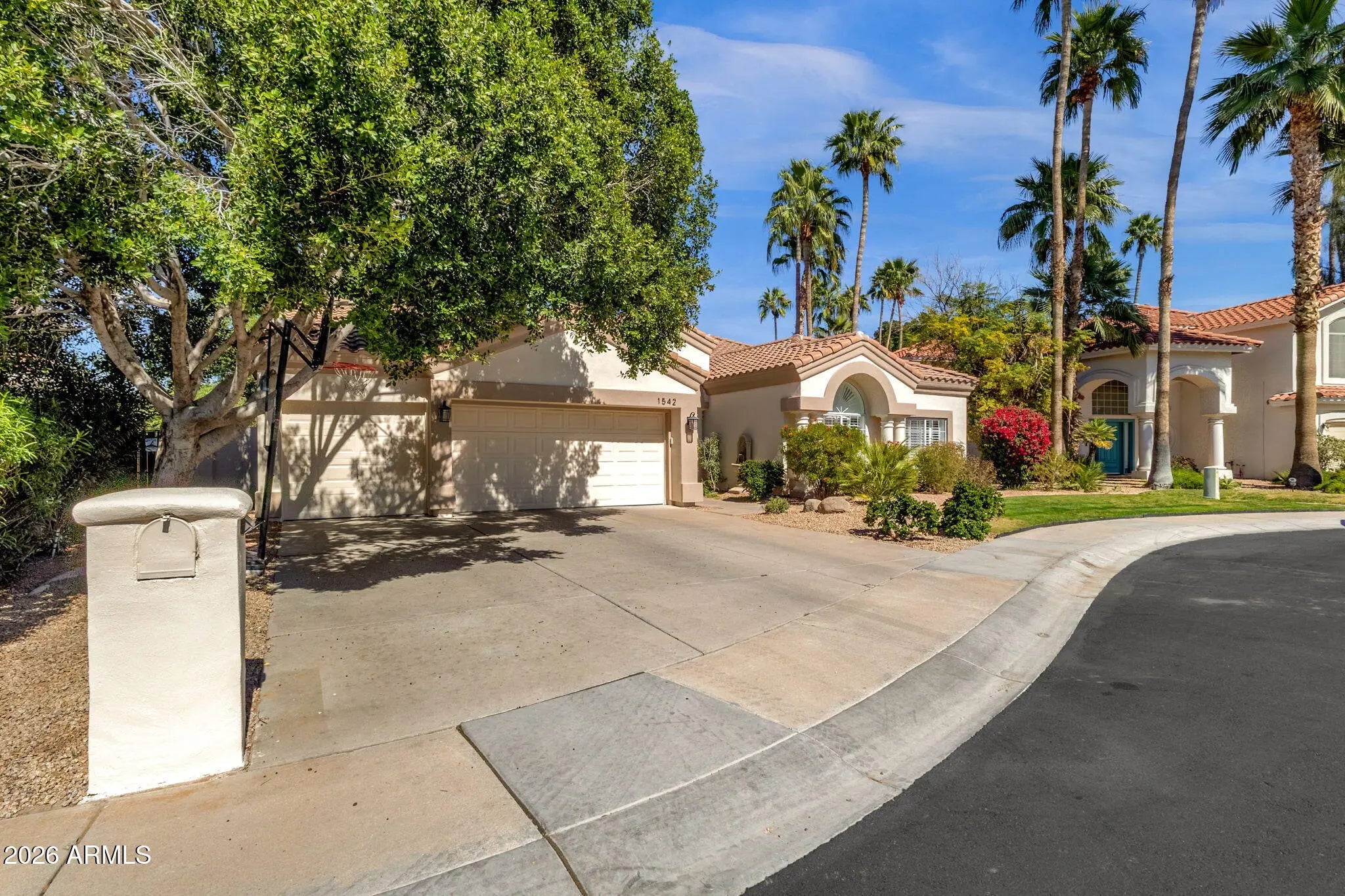 Nestled on a quiet cul-de-sac in the semi-custom community of Mission Bay Estates at Val Vista Lakes, this beautifully designed single-level home sits on a sprawling 13,552 sq ft lot and offers the perfect blend of space, comfort, and thoughtful design. A grand entry welcomes you into the home, where formal living and dining spaces frame picturesque views of the lush backyard beyond--creating an immediate sense of openness and sophisticated elegance. These inviting spaces are ideal for entertaining, holiday gatherings, and everyday living. The eat-in kitchen is both stylish and functional, featuring stainless steel appliances, crisp white cabinetry with sleek hardware, classic white subway tile backsplash, a center island, and a dedicated walk-in pantry. Abundant recessed lighting and windows brightens the space while the functional layout flows seamlessly into the family room, creating a natural hub for gathering and connection. The split floor plan offers privacy and flexibility. The expansive primary suite is truly impressive, large enough to accommodate a dedicated office area--currently partitioned for privacy by the homeowner--overlooking the tranquil backyard. The primary bath features dual sinks, a garden soaking tub, and a separate walk-in shower, both enveloped in custom tile work, along with a spacious walk-in closet. This wing of the home also includes a convenient powder room and an functional laundry room complete with butcher block folding space, built-in seating, and abundant cabinetry. On the opposite side of the home, three generously sized bedrooms share a full bathroom, creating an ideal layout for family or guests. Step outside to a lush north-facing backyard oasis. The expansive yard is filled with mature shade trees, large grassy areas, and privacy provided by a tree-lined perimeter fence. Tucked away in the corner you will spot a cute little tiny house, a perfect playhouse for the wee ones. A covered patio and extensive, thoughtfully designed stonework create multiple outdoor living spaces perfect for dining, relaxing, and entertaining. Additional highlights include stylish updated tile, updated modern lighting, plantation shutters, new roof (2026), fresh exterior paint, and HVAC systems updated in 2024 and 2019 for added piece of mind. Val Vista Lakes is a peaceful, well-maintained neighborhood with an active, community-oriented lifestyle and year-round recreational opportunities. Residents enjoy a private clubhouse, beach-entry pool, lap pool, spa, fitness center, tennis & racquetball courts, parks, and miles of walking paths. The best part is you don't even have to cross the street. There is a tunnel under Val Vista so it's easy, safe, and convenient! A beautiful place for life's next chapter -- 1542 Catamaran.