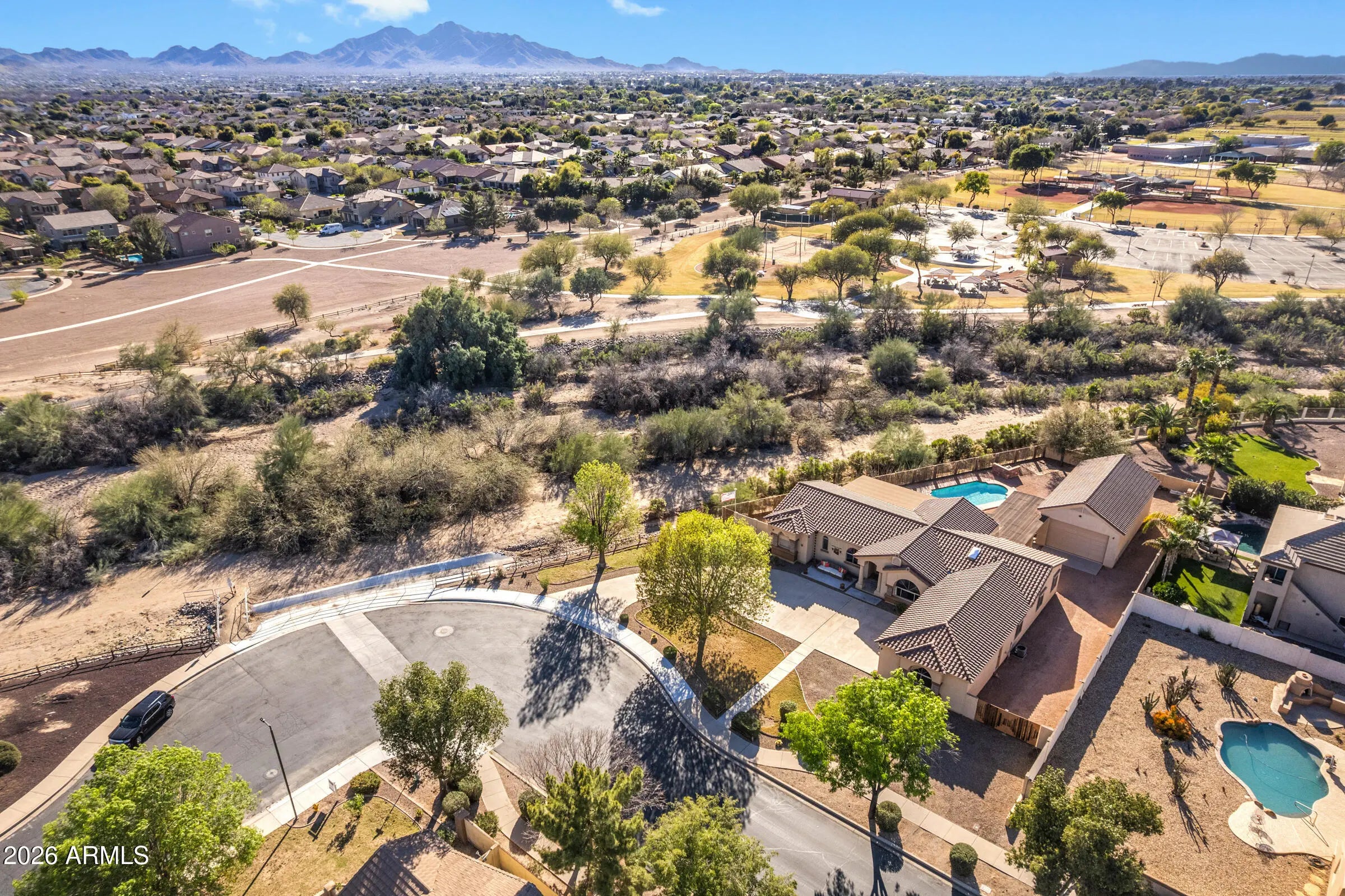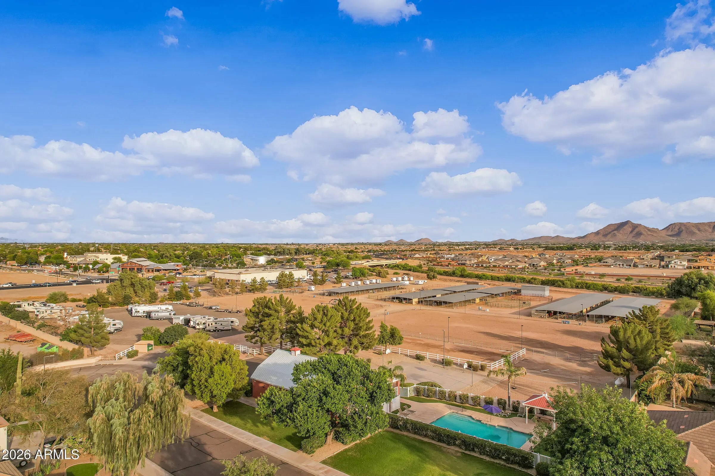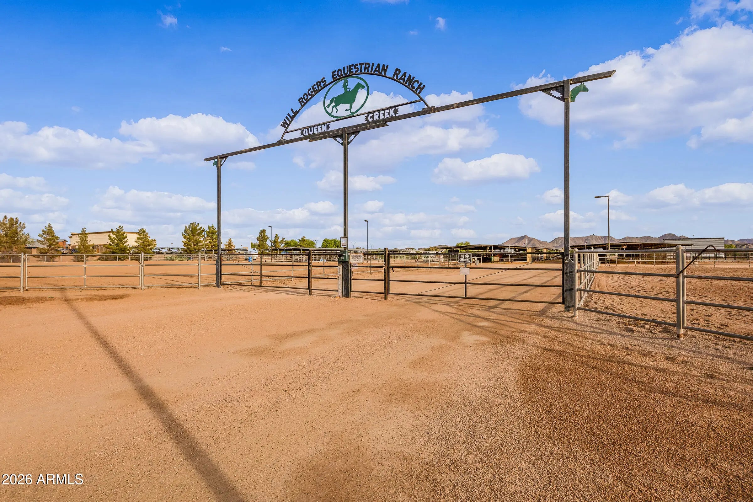 *A Slice of Country Living | Conveniences of the City * Situated on just shy of a ½ acre (.44 lot), this perfectly placed estate is quietly tucked away in Will Rogers Equestrian Ranch Community. This gorgeous ranchette screams ''country life in the city'' where desert views, stunning sunsets, direct access to riding trails, and the BEST of amenities the vibrant Town of Queen Creek offers, come together. From the moment you arrive, this home's stunning curb appeal highlights welcome home. From its sprawling driveway and 3 car gar that allow for ample parking, to copper details that adorn its façade, to the personal entrance & walkway that beckons you to the front patio for morning & evening reflection, this home delivers convenience, comfort, and relaxed living. Step inside this single story, 4bd 3ba + FlexRm home to find a thoughtfully designed open-concept layout that showcases soaring 10' ceilings with vaulted accents, elegant natural edge slate flooring, newly installed neutral carpet, and vintage farm style barn doors that add warmth and architectural charm. The inviting great room is anchored by a custom Dutch Lap Entertainment center with built-in storage, creating a polished yet comfortable gathering space for relaxation. The Kitchen is pure delight, both in its vintage charm & functional space perfect for executing your favorite meal. Its stainless appliances (yes, the fridge stays), abundant storage, expansive pantry, warm wood details, open shelving, and rustic style promote a chef's creativity, enjoyment & entertaining. A split floor plan ensures privacy for all, with 3bdrms & Private Guest Bath (the 2nd bathrm) on one side of the home, and an expansive Primary Suite with sitting room/work-out space, patio with private access, walk-in closet, garden tub, and spa-inspired step-in travertine shower. Step outside to your private backyard oasis where the extended covered patios and breezeway, along with the 3rd bath lead to the impressive 24x44 RV garage/workshop with 240V service creating easy indoor-outdoor living. The sparkling pool, complete with a variable-speed programmable pump, is surrounded by earth toned pavers/sitting area, mature Ocotillo landscape, all which create privacy, and a tranquil, resort-style setting. Additional highlights include an RV gate with huge side yard, newer outdoor ceiling fans, & electric sun screens. Will Rogers Equestrian Ranch Community stands unrivaled due to its unique offerings to its Residents. All residents will enjoy incredible resort-style amenities including a community pool, clubhouse, various sport courts, & firepit gathering areas. Those residents who are equestrian enthusiasts have option to utilize the private, and exclusive to residents, horse boarding facility, riding arena, and turn-out areas, along with the ability to store your RV/Horse Trailers in resident only parking areas. Don't sleep on this beautiful estate & community - yes, you can have it all !