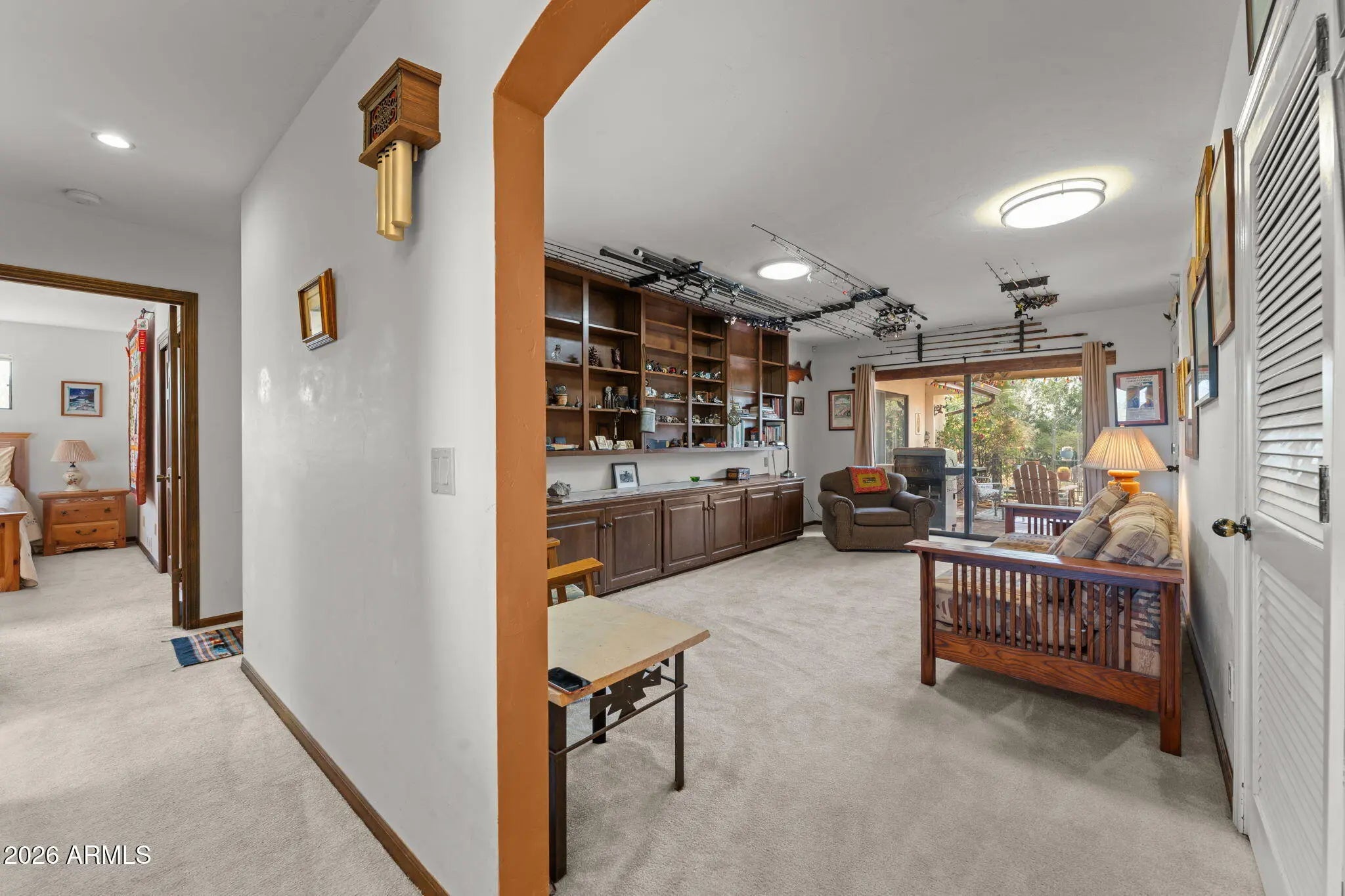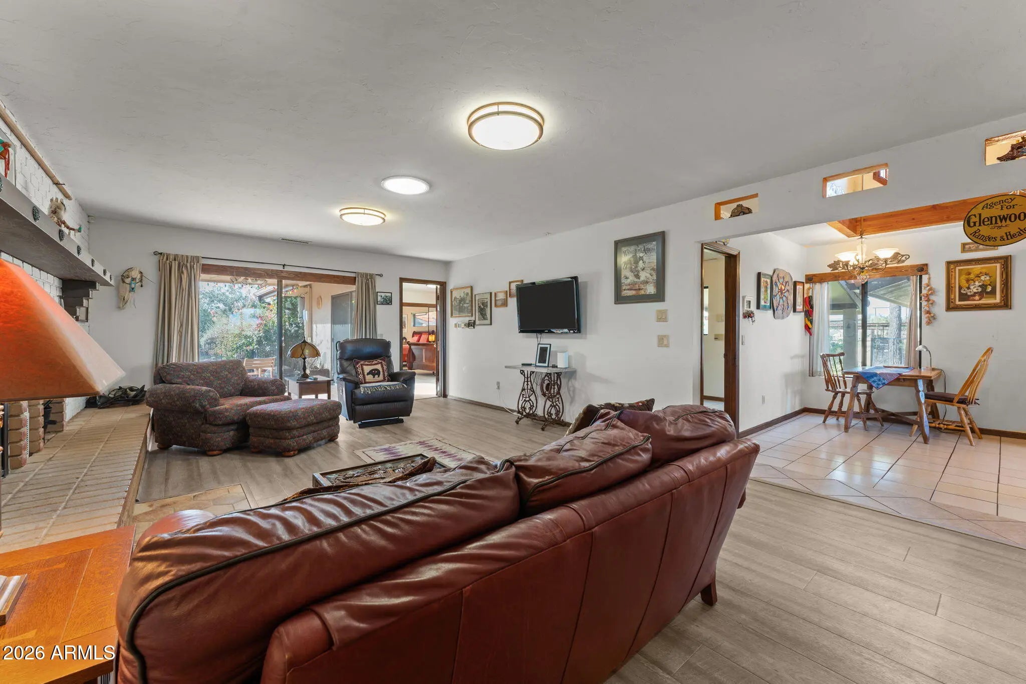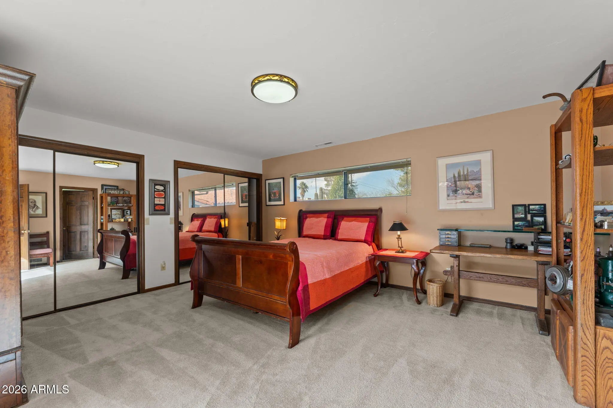 Charming and full of character, this unique property feels like it was made for a boutique B&B. The thoughtfully designed layout features 2 primary suites, split floor plan, plus 2 spacious guest bedrooms and 3 full baths offering comfort and privacy for visitors or family alike. Enjoy unforgettable mountain views from the formal dining room's large picture window, relax in the living room with a real wood-burning fireplace, or retreat to the library with beautiful built-in bookshelves. The vintage-inspired kitchen features tile counters and picture-perfect windows framing the mountains. Situated on 1.629 horse-zoned acres with a private well, 18x36 greenhouse, 30'RV cover, fenced grassy yard for pets, and inviting patios for soaking in Arizona sun. Home is being sold furnished too!