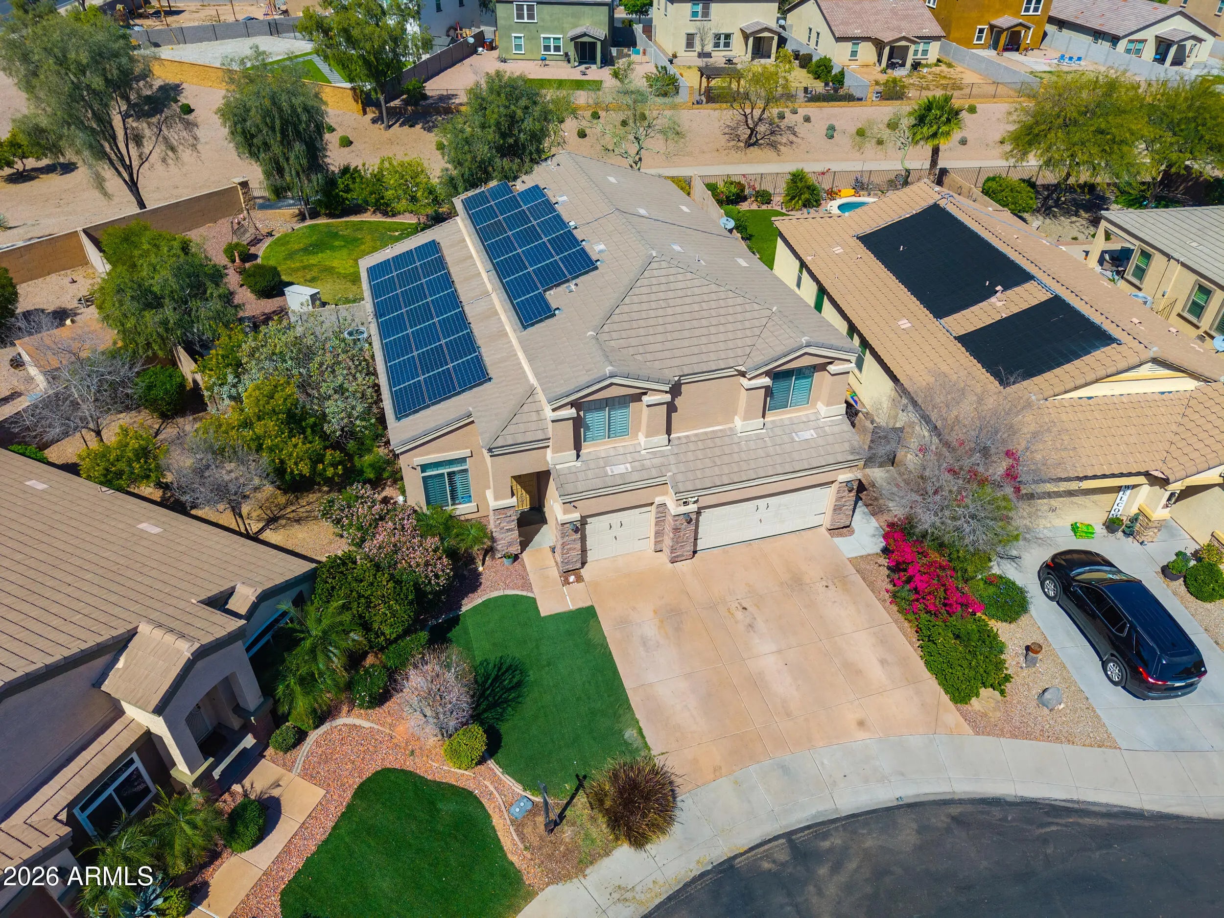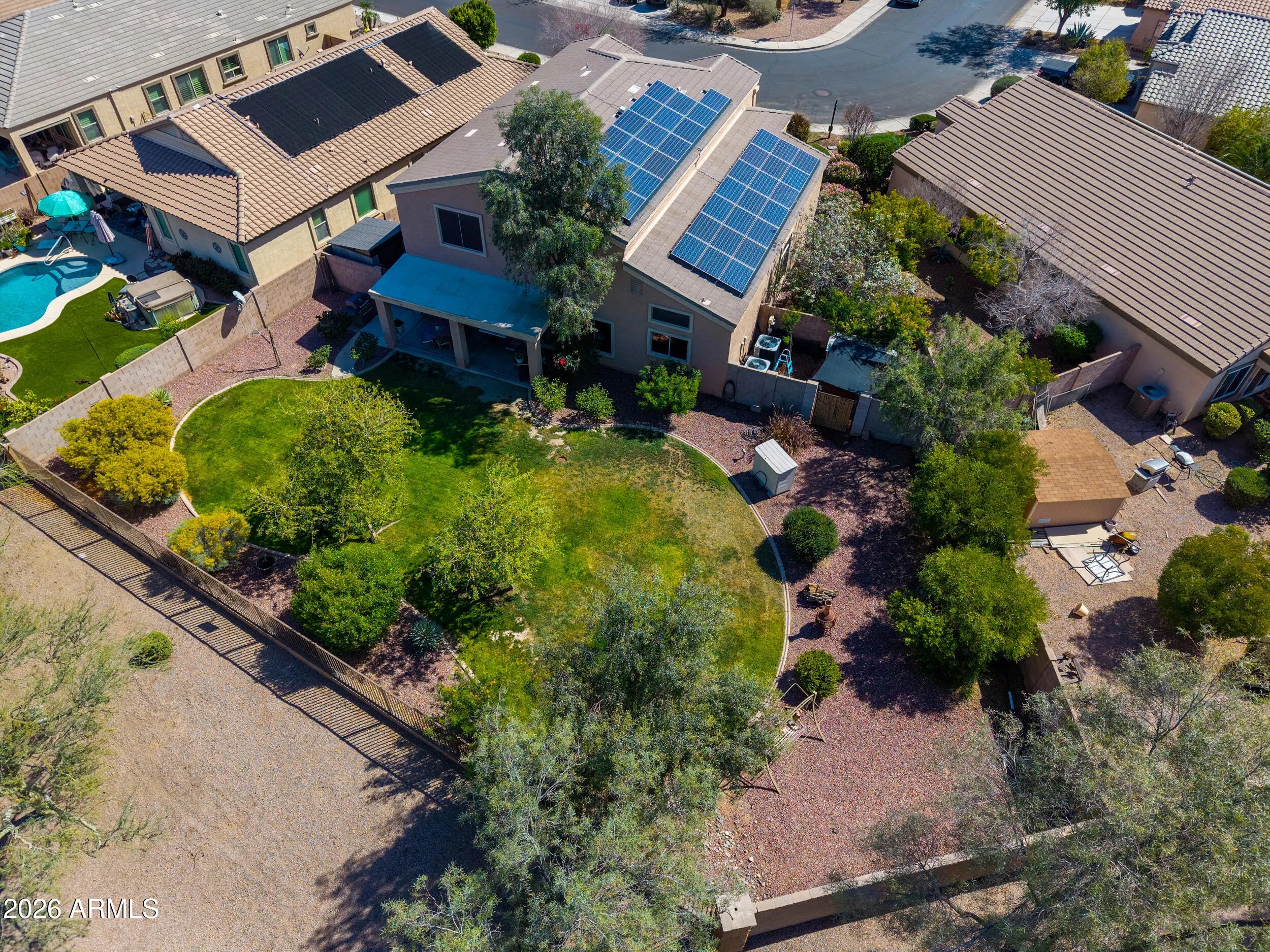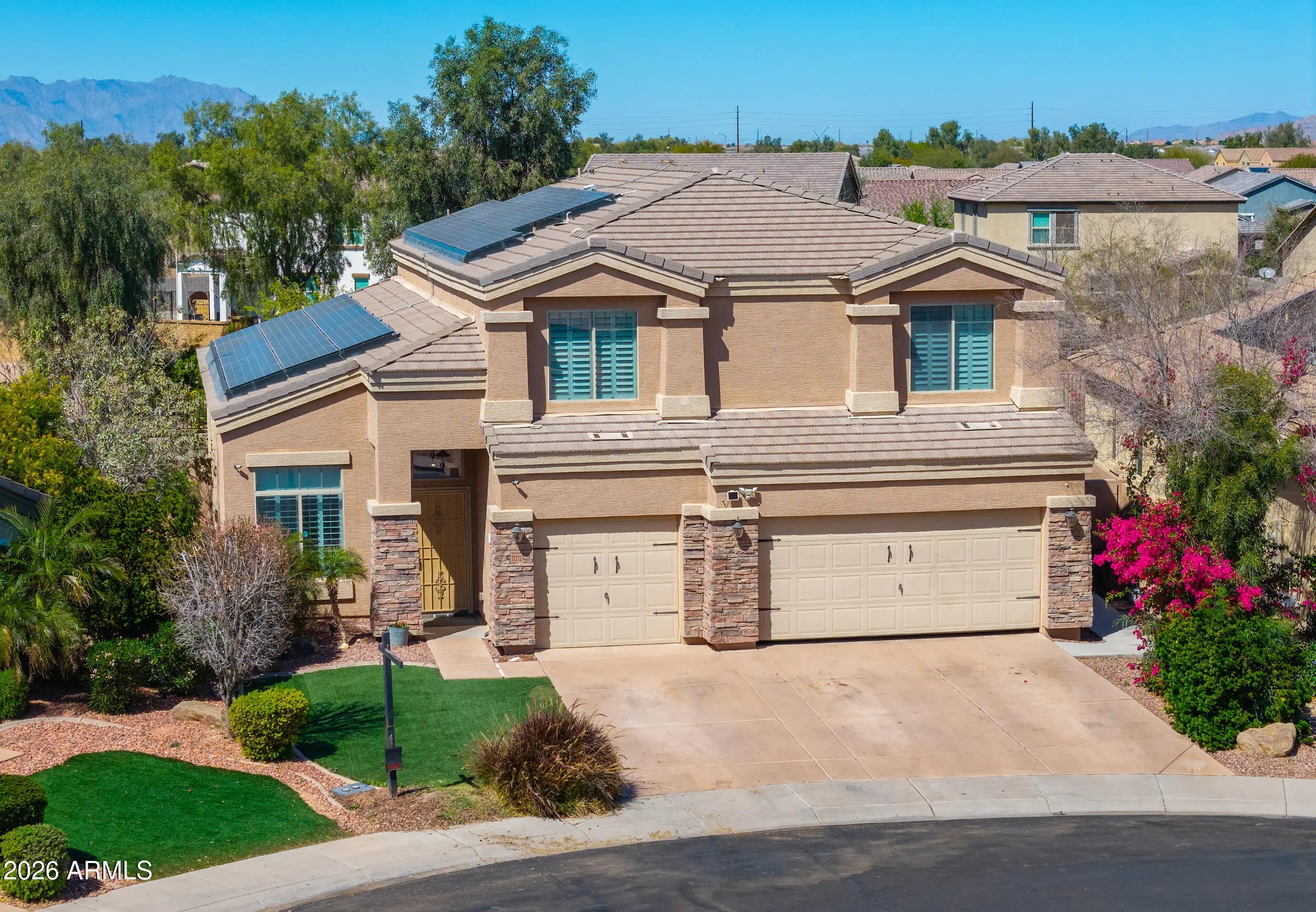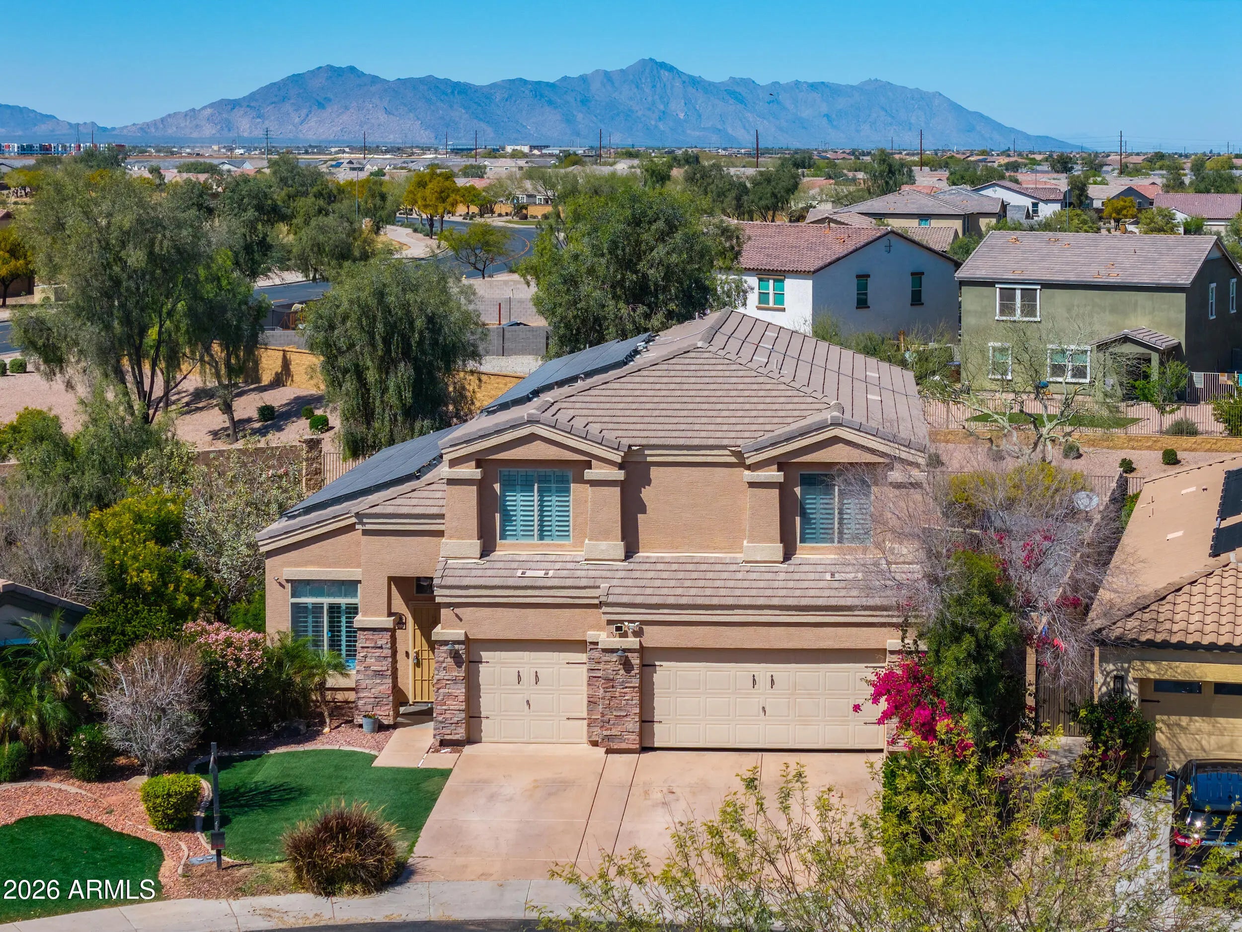 FORMER MODEL on OVERSIZED LOT with VIEW FENCING! This gorgeous & expansive home shows true pride of ownership & boasts entertainer's floorplan with 4 spacious bedrooms, 3 FULL baths (one bed/bath downstairs), formal living/dining room, huge loft & large great room! Upgrades abound & include soaring vaulted ceilings, plantation shutters, designer 2-toned paint, 20 in staggered tile in all the right places, Berber carpet, SOLAR, 3 car garage & more! Chef's kitchen features granite countertops, staggered Cherry cabinetry, tile backsplash & island overlooking the great room! Palatial master bedroom boasts walkin closet & ensuite bath with dual sinks & separate shower & soaking tub! South facing backyard with covered patio & tons of space to add your personal touch! Over 10,000 sq ft lot with North/South exposure, mature foliage, lush grass area, oversized covered patio & view fencing with no neighbors behind! TRULY A MUST SEE!