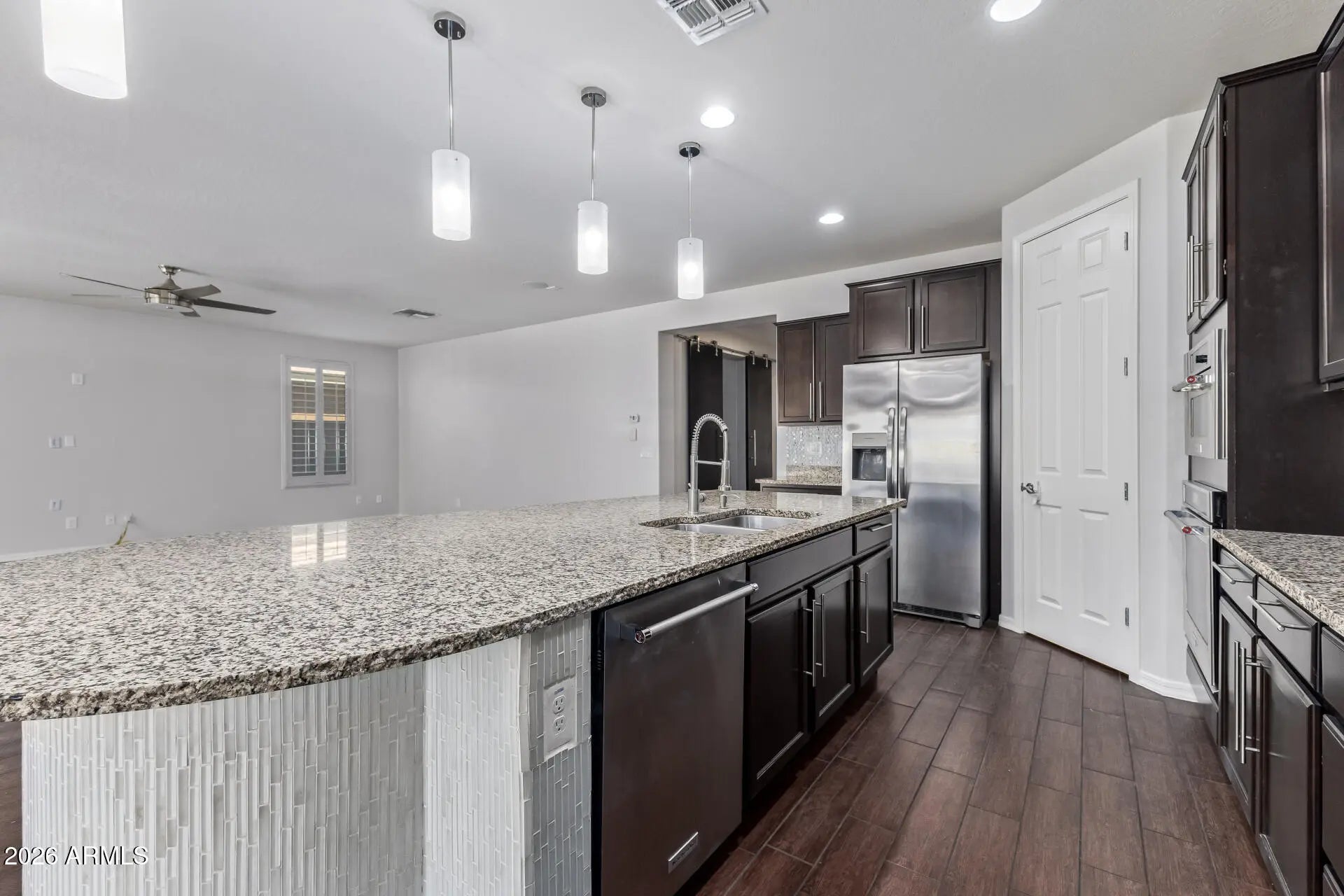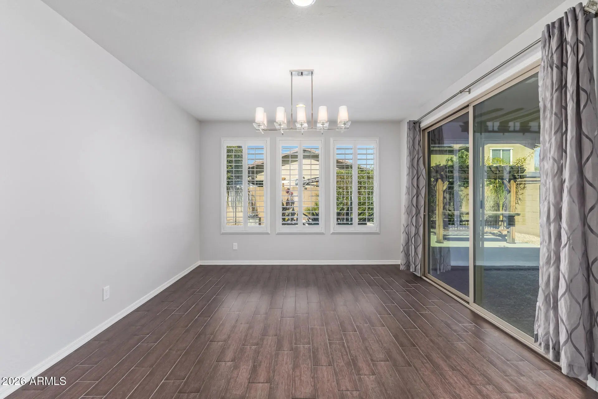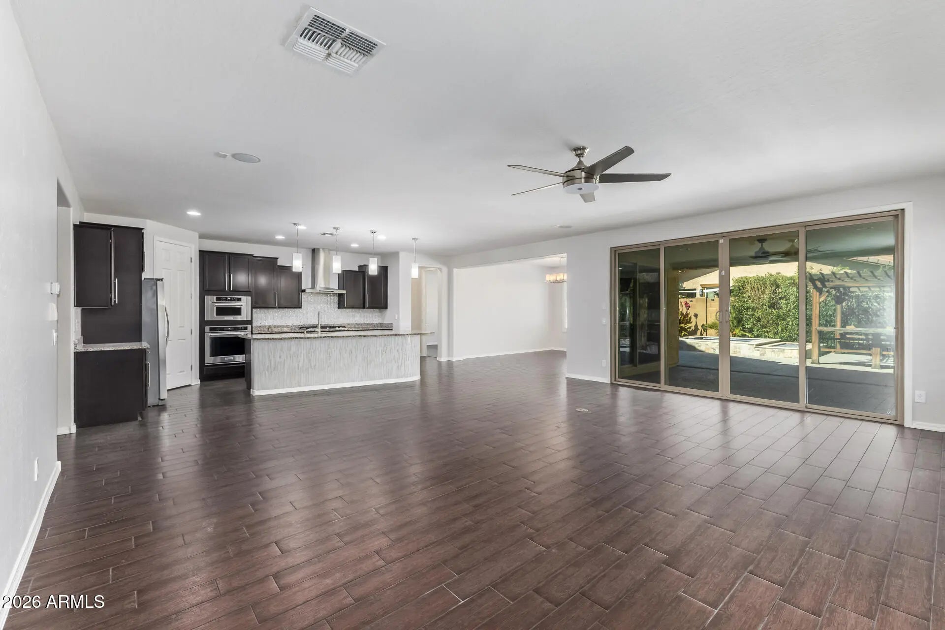 Immaculate single-level 4-bedroom, 3.5-bath home loaded with upgrades and designed for exceptional indoor-outdoor living. The chef's kitchen features a large custom granite island, glass and stone backsplash, gas cooktop, wall oven, and stainless steel appliances. The open floor plan includes an oversized living and dining area with wood-look tile flooring, 8-ft interior doors, elegant shutters, and abundant natural light. French sliding doors lead to an expansive covered patio overlooking a sparkling heated pool and spa with 8 jets. The backyard is built for year-round enjoyment with a lighted pergola, outdoor fireplace, and integrated indoor/outdoor speakers. Seller will contribute $5,000 towards rate buy down with full price offer.