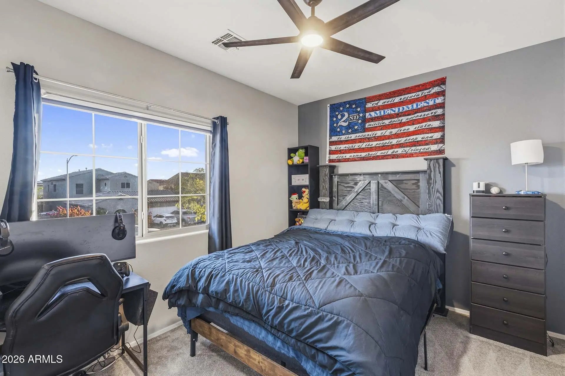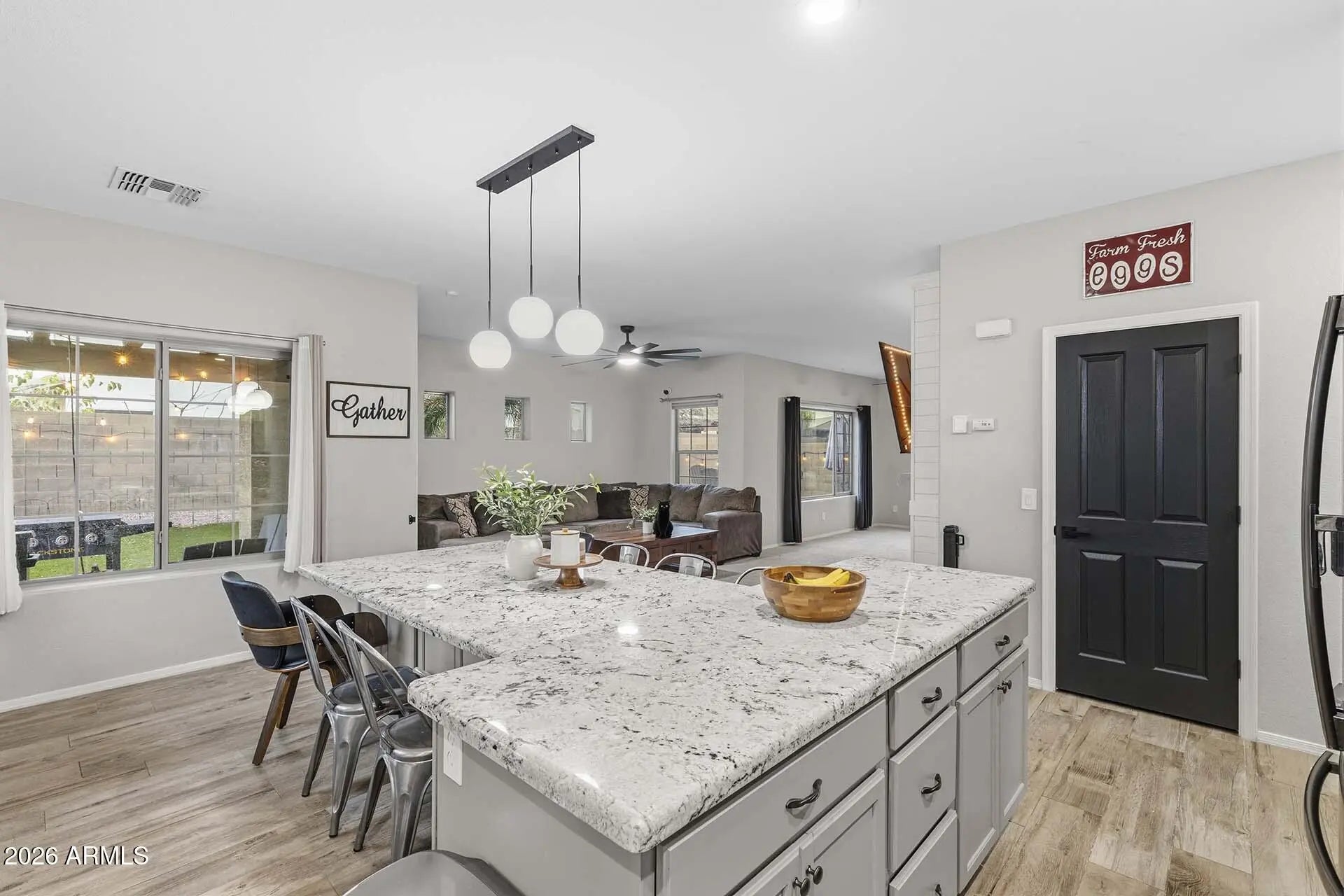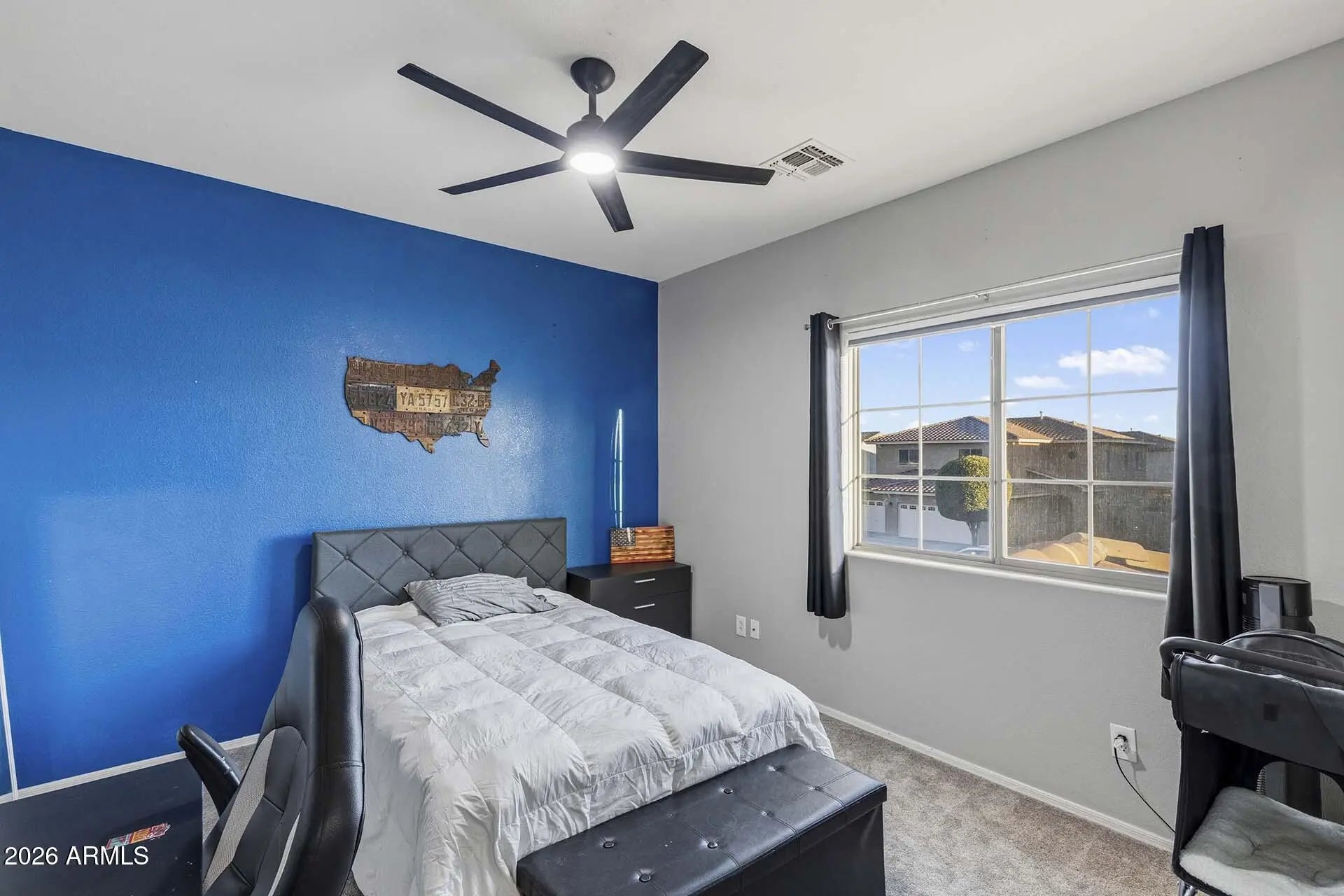 Welcome to this beautifully maintained 6-bedroom, 3-bathroom home in the desirable Legacy Parc community in Surprise, offering nearly 3,000 sq ft of living space with north/south exposure, great curb appeal, ample driveway parking, and fully OWNED solar for energy efficiency. Inside, you'll find a spacious great room with vaulted ceilings, a striking staircase, and views of the backyard pool. The inviting living area features a cozy electric fireplace with shiplap, while the open-concept kitchen is perfect for entertaining with an oversized island, black stainless-steel appliances, abundant cabinetry, and a custom-built pantry designed for maximum storage and organization. The laundry room has also been upgraded with additional cabinets and a built-in pet feeding station. The first floor includes a bedroom and a full bathroom with a walk-in shower remodeled in 2025, ideal for guests or a home office. Upstairs, the primary suite offers a spa-like bathroom with a Japanese soaking tub, separate shower, dual sinks, and a large walk-in closet. Step outside to a backyard oasis featuring a sparkling pool with safety fence, lush low-maintenance turf, and plenty of room to relax or entertain. Additional highlights include a newer A/C system and a 3-car garage, with the two-car portion separated and converted into a workshop featuring additional electrical, a utility sink, extensive cabinetry, and a 220V outlet for EV charging or power tools. Legacy Parc residents enjoy parks, playgrounds, and basketball courts, making this home the perfect blend of space, functionality, and lifestyle.
