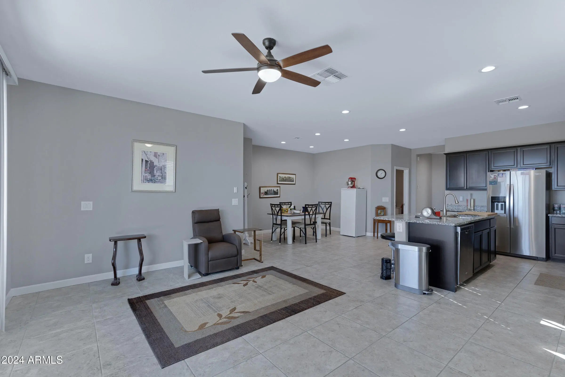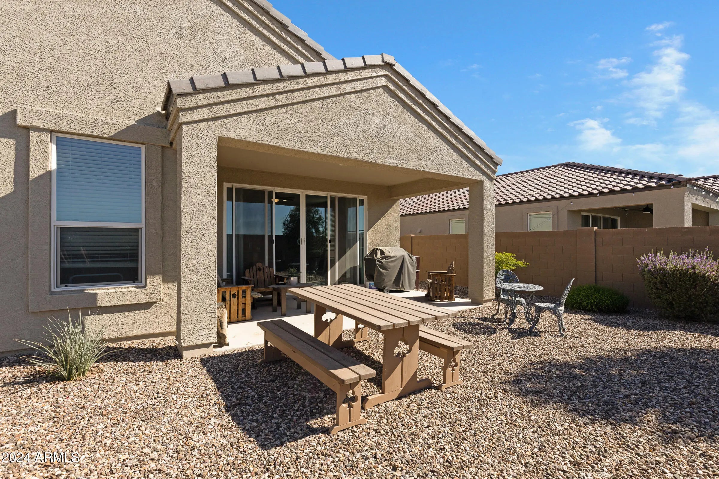 Beautifully maintained 3 bed, 2 bath home with a tandem 3-car garage in the highly desirable Anthem at Merrill Ranch community. This move-in-ready home offers comfortable Arizona living with thoughtful upgrades, functional living space, and access to one of Florence's premier resort-style neighborhoods. The spacious chef's kitchen features abundant cabinetry, sleek countertops, stainless steel appliances, gas range, and a large center island with built-in sink and breakfast bar, plus a dedicated formal dining area ideal for everyday living or entertaining. The open family room includes large glass sliding doors that lead to the covered patio, creating seamless indoor-outdoor living. The primary suite offers a relaxing retreat with a large walk-in closet and spacious ensuite bathroom complete with double sinks, walk-in shower, and private toilet room. Two additional bedrooms provide flexible space for guests, family, or a home office. The guest bathroom includes a tub/shower combination and generous counter space. Step outside to enjoy the covered patio and private low-maintenance backyard with block fencing, perfect for relaxing evenings or weekend gatherings. The tandem 3-car garage offers exceptional versatility and features a new mini-split AC unit and triple-insulated garage door, creating an ideal climate-controlled space for hobbies, workouts, workshop use, or additional storage. Solar panels provide added energy efficiency and help offset electricity costs. Living in Anthem at Merrill Ranch means enjoying an incredible lineup of community amenities including a heated pool with water slides, children's pool, expansive community center, indoor fitness facility, pickleball courts, tennis courts, basketball courts, sand volleyball, scenic lakes, dog park, baseball fields, soccer fields, parks, playgrounds, and miles of walking and biking trails. Experience the best of resort-style living in Anthem at Merrill Ranch with amenities designed for an active and connected lifestyle.