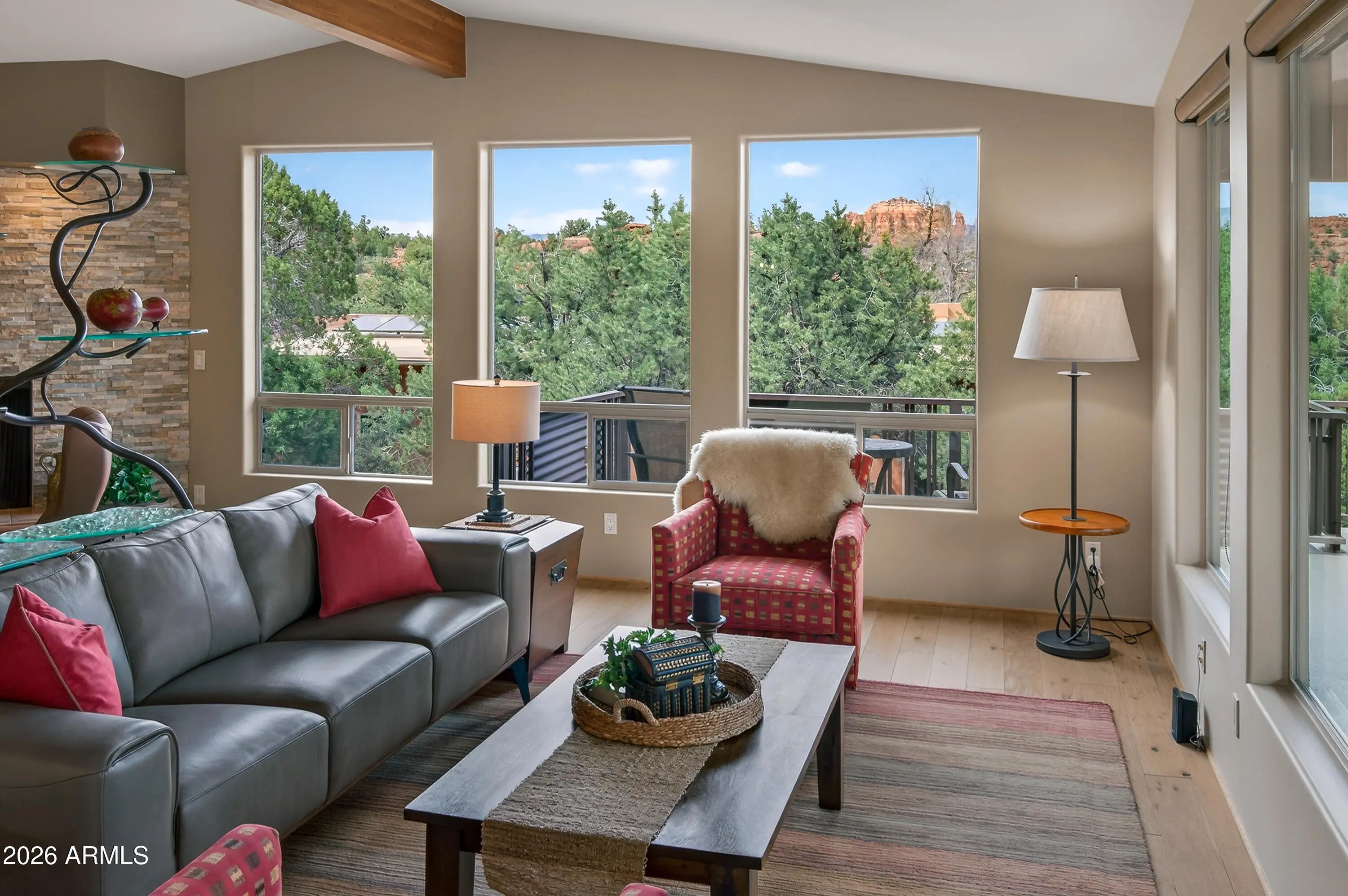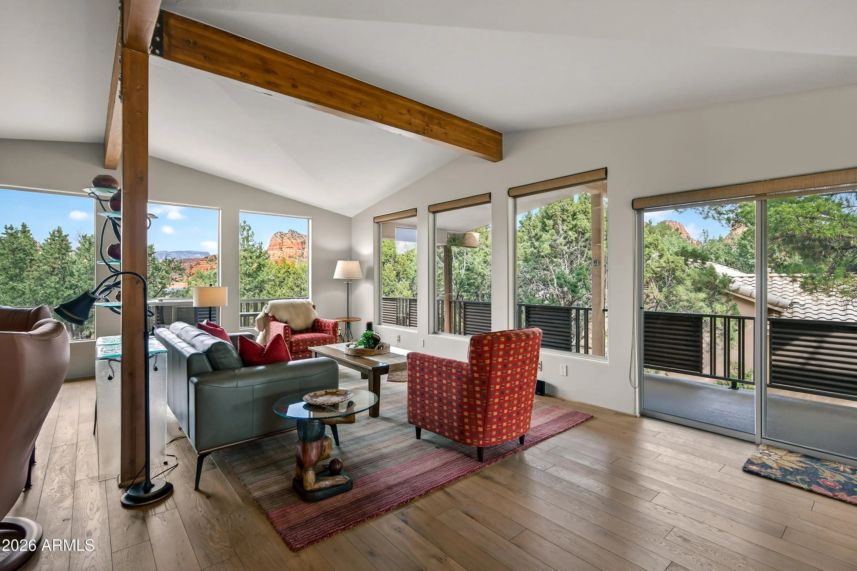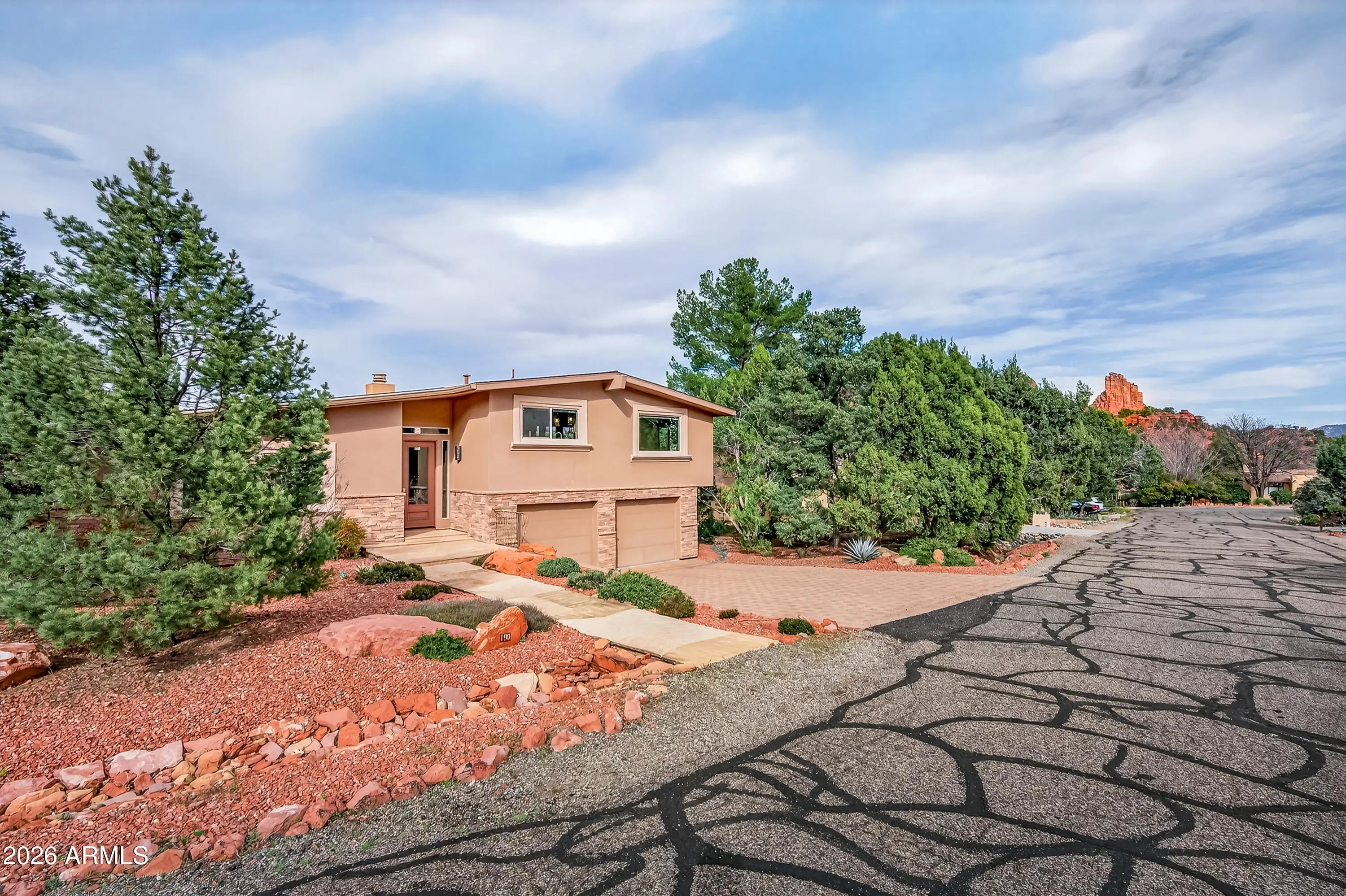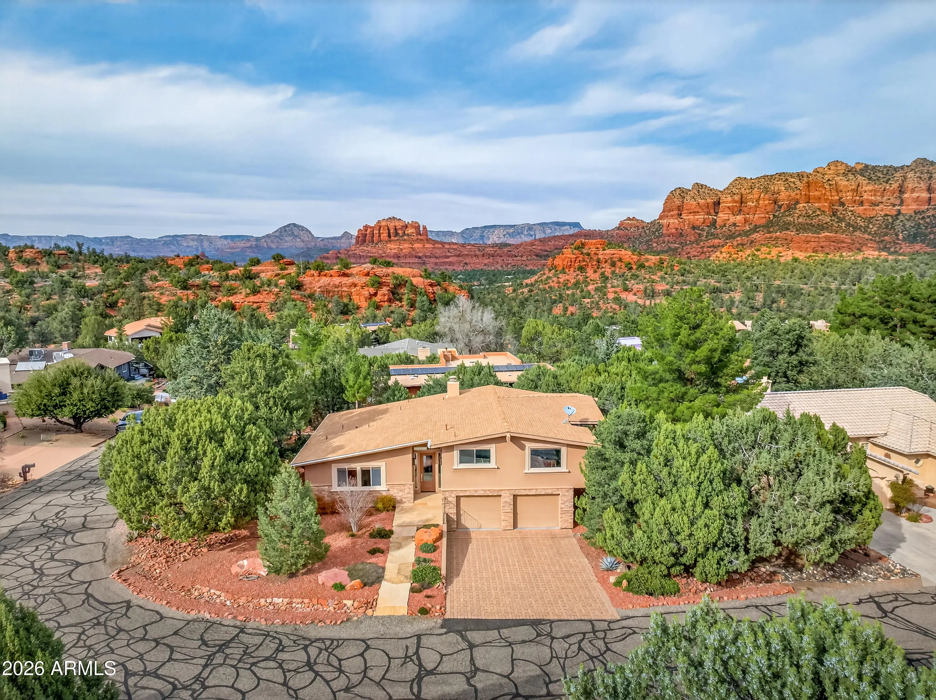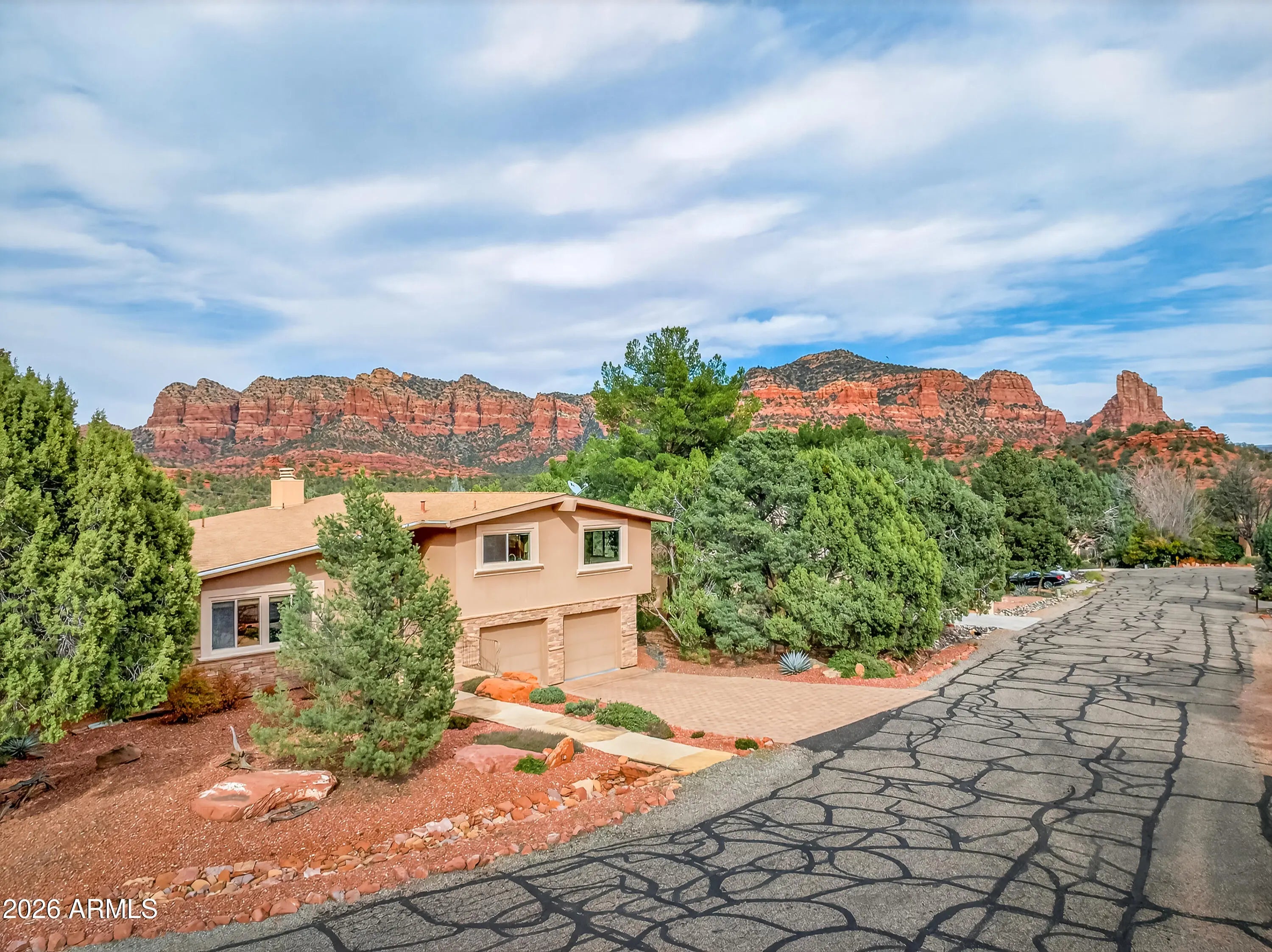 Newly remodeled ''Treehouse'' home with direct Red Rock views and an oversized 4 car garage. Immaculately maintained home nestled between the Juniper and Pinon pine trees with modern upgrades including kitchen (quartzite countertops, stainless appliances) white oak flooring, and backyard paver patio with landscaping. Modern open floorplan home with loads of natural light and lots of windows to admire the changing light conditions upon the nearby red rocks. Located in the Village of Oak Creek just a block or two away from National Forest trail system for endless options for hiking, mountain biking and exploring. Nearby trail spotlight: Transept, Baldwin, and the Turkey Tank system. Lower level garage has 2 bays but is deep enough for 4 cars or 2 cars + large workshop/ home gym/ studio. Complete renovation in 2009, but current owner completed a kitchen update in 2022 including: Taj Mahal quartzite countertops, Stainless appliances, double oven, kitchen sink,both overhead and under cabinet lighting, white oak engineered flooring. Additional upgrades include a custom art glass room divider with matching railing and backyard paver lounge area.