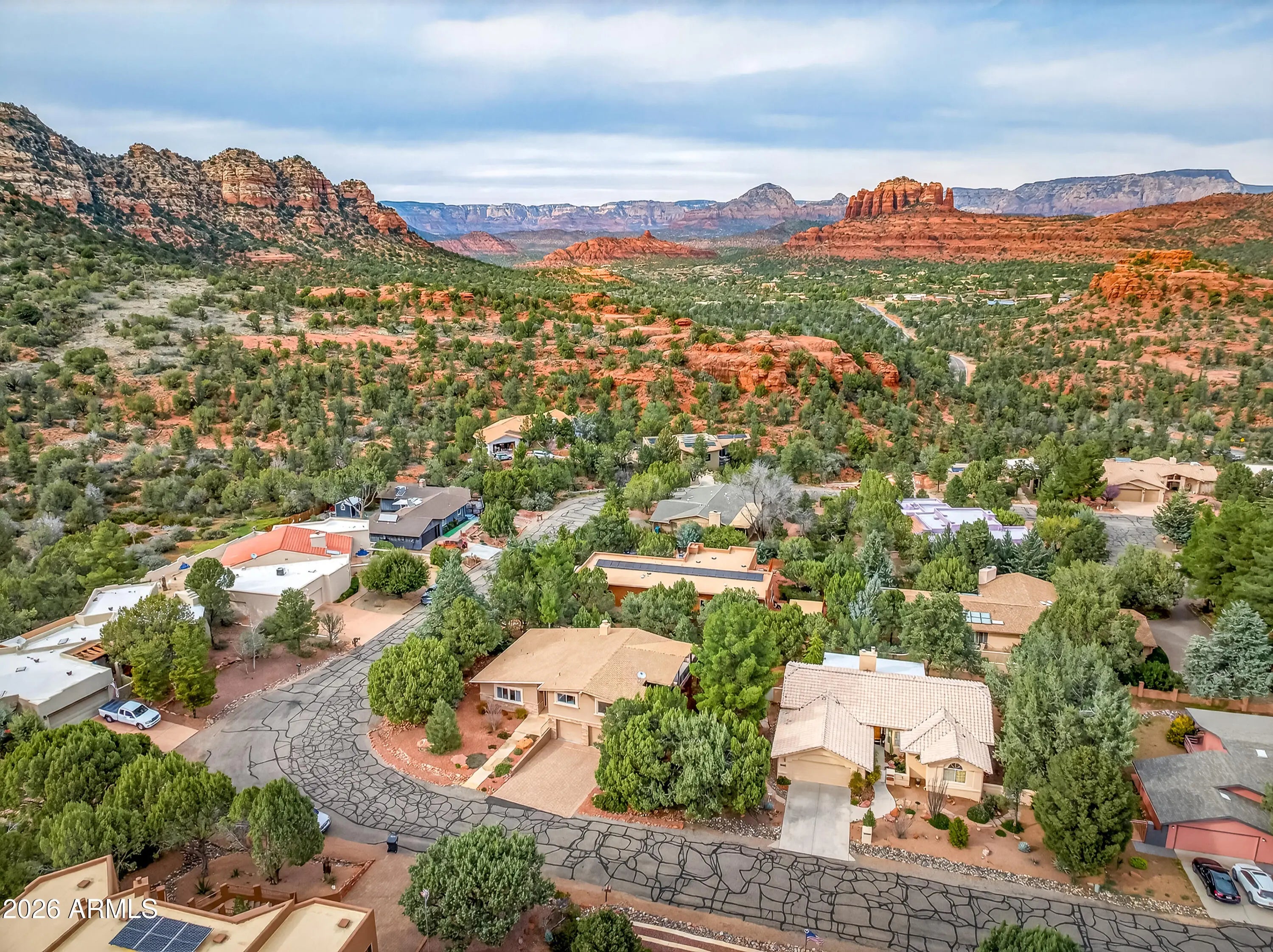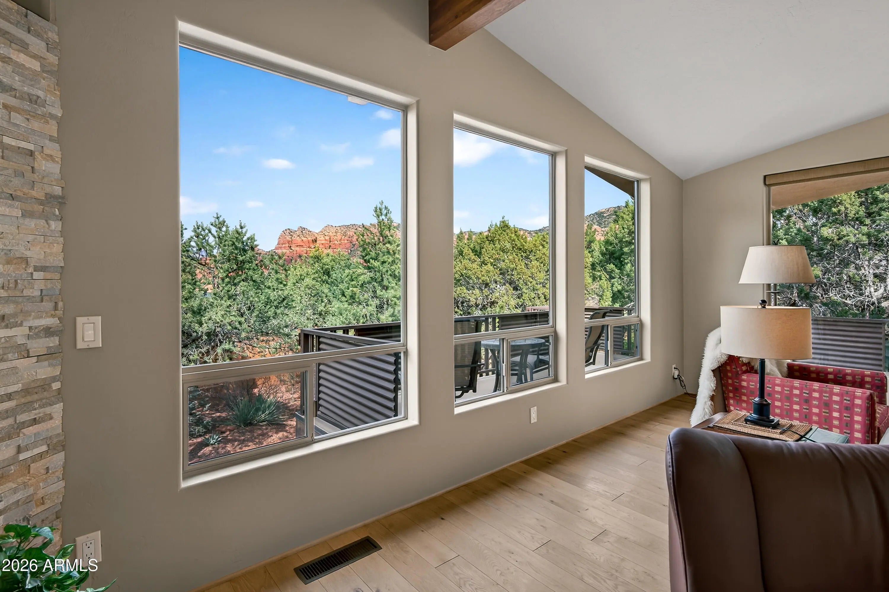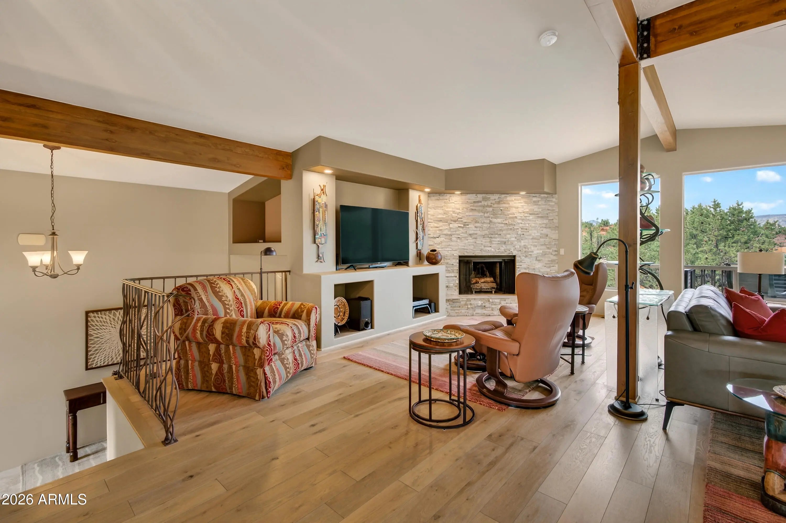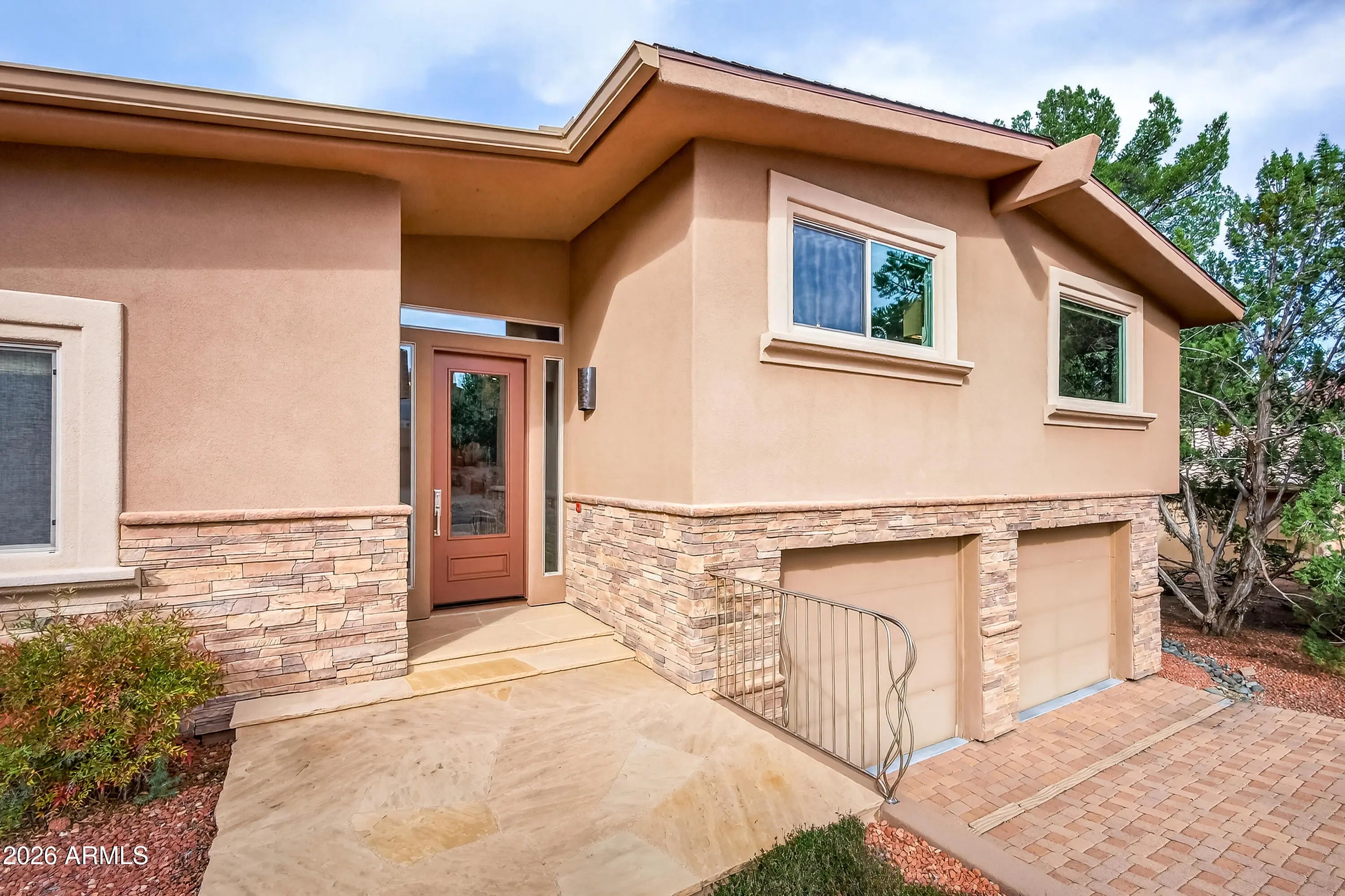 Newly remodeled ''Treehouse'' home with direct Red Rock views and an oversized 4 car garage. Immaculately maintained home nestled between the Juniper and Pinon pine trees with modern upgrades including kitchen (quartzite countertops, stainless appliances) white oak flooring, and backyard paver patio with landscaping. Modern open floorplan home with loads of natural light and lots of windows to admire the changing light conditions upon the nearby red rocks. Located in the Village of Oak Creek just a block or two away from National Forest trail system for endless options for hiking, mountain biking and exploring. Nearby trail spotlight: Transept, Baldwin, and the Turkey Tank system. Lower level garage has 2 bays but is deep enough for 4 cars or 2 cars + large workshop/ home gym/ studio. Complete renovation in 2009, but current owner completed a kitchen update in 2022 including: Taj Mahal quartzite countertops, Stainless appliances, double oven, kitchen sink,both overhead and under cabinet lighting, white oak engineered flooring. Additional upgrades include a custom art glass room divider with matching railing and backyard paver lounge area.