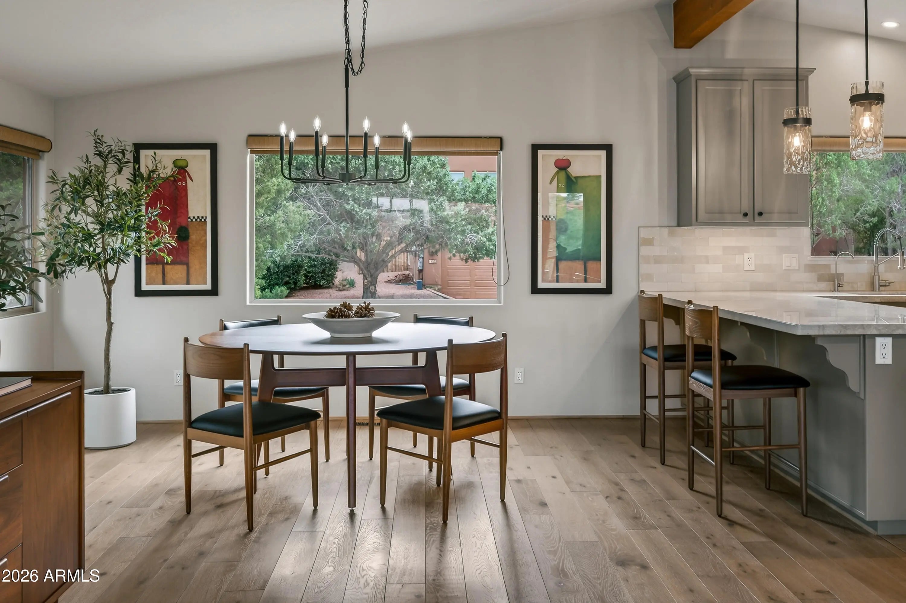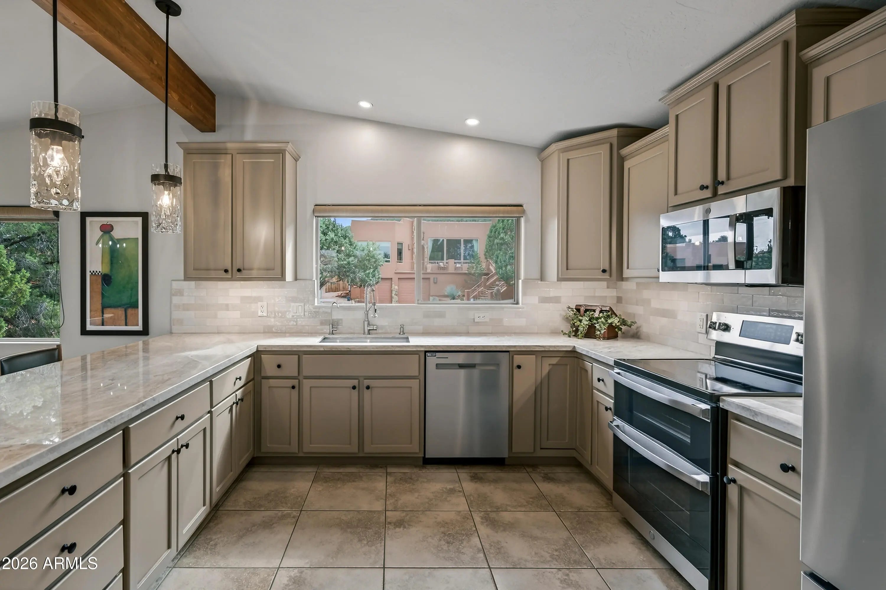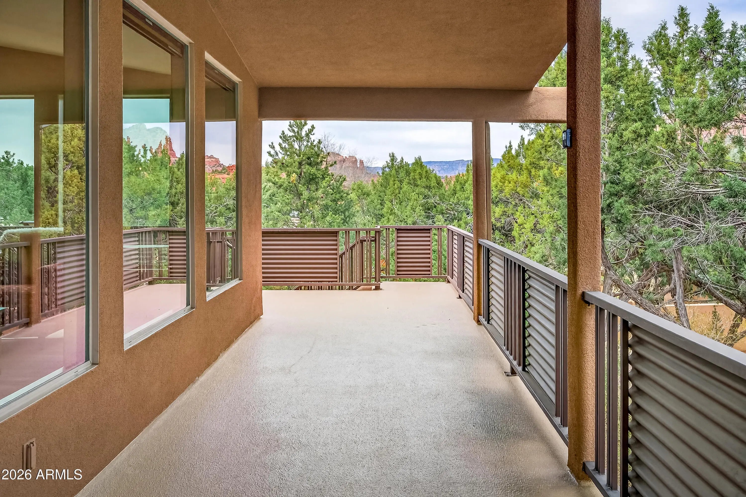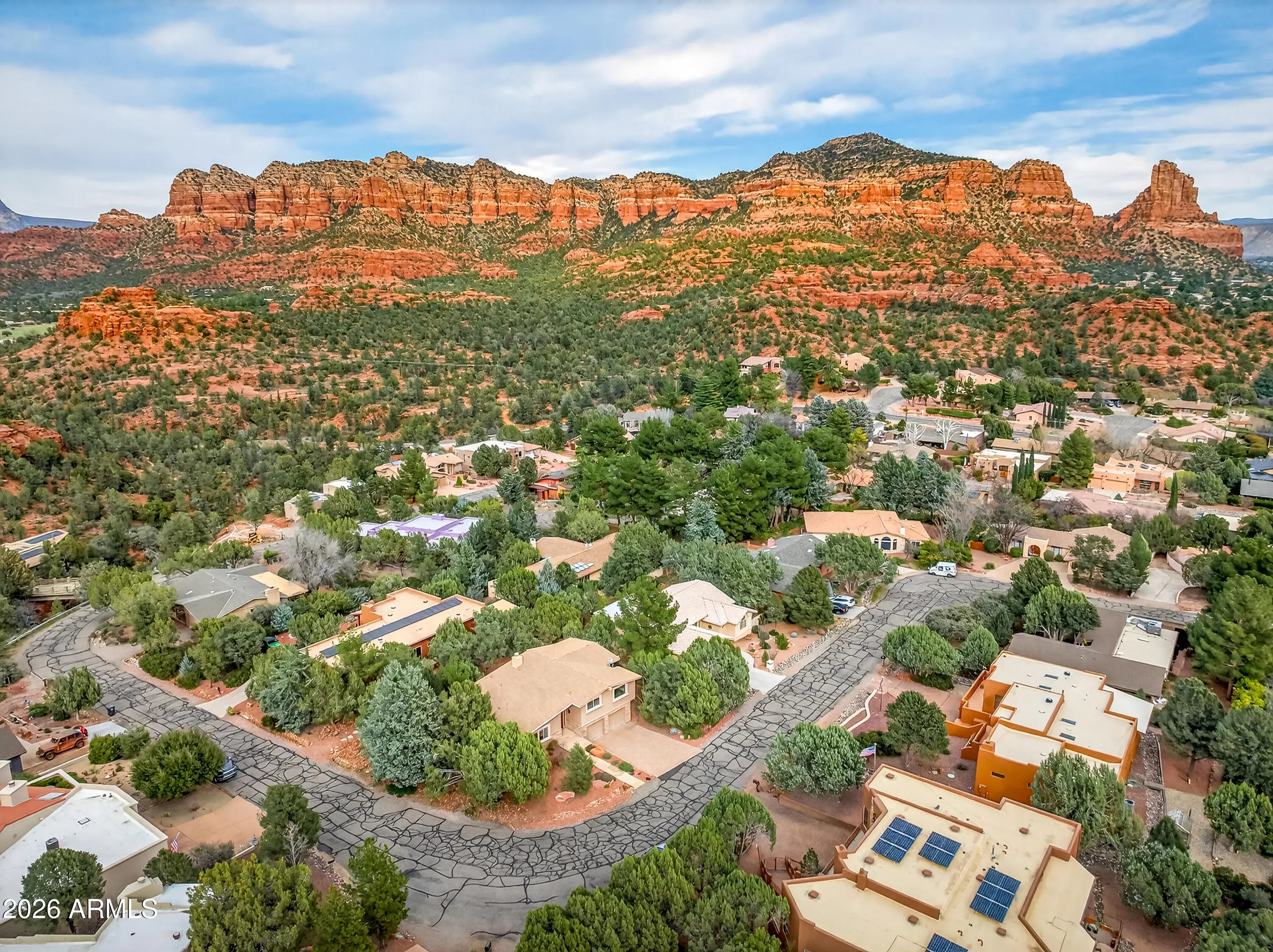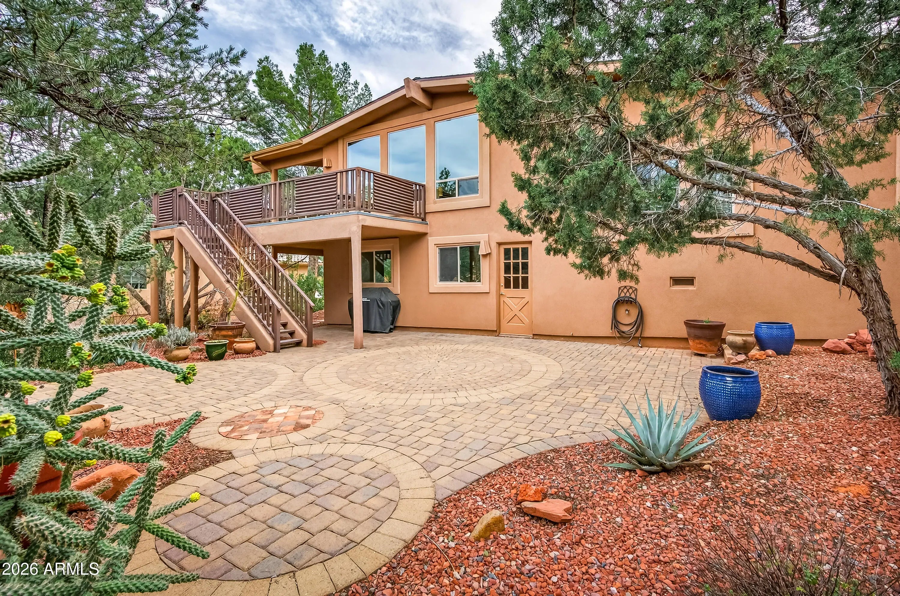 Newly remodeled ''Treehouse'' home with direct Red Rock views and an oversized 4 car garage. Immaculately maintained home nestled between the Juniper and Pinon pine trees with modern upgrades including kitchen (quartzite countertops, stainless appliances) white oak flooring, and backyard paver patio with landscaping. Modern open floorplan home with loads of natural light and lots of windows to admire the changing light conditions upon the nearby red rocks. Located in the Village of Oak Creek just a block or two away from National Forest trail system for endless options for hiking, mountain biking and exploring. Nearby trail spotlight: Transept, Baldwin, and the Turkey Tank system. Lower level garage has 2 bays but is deep enough for 4 cars or 2 cars + large workshop/ home gym/ studio. Complete renovation in 2009, but current owner completed a kitchen update in 2022 including: Taj Mahal quartzite countertops, Stainless appliances, double oven, kitchen sink,both overhead and under cabinet lighting, white oak engineered flooring. Additional upgrades include a custom art glass room divider with matching railing and backyard paver lounge area.