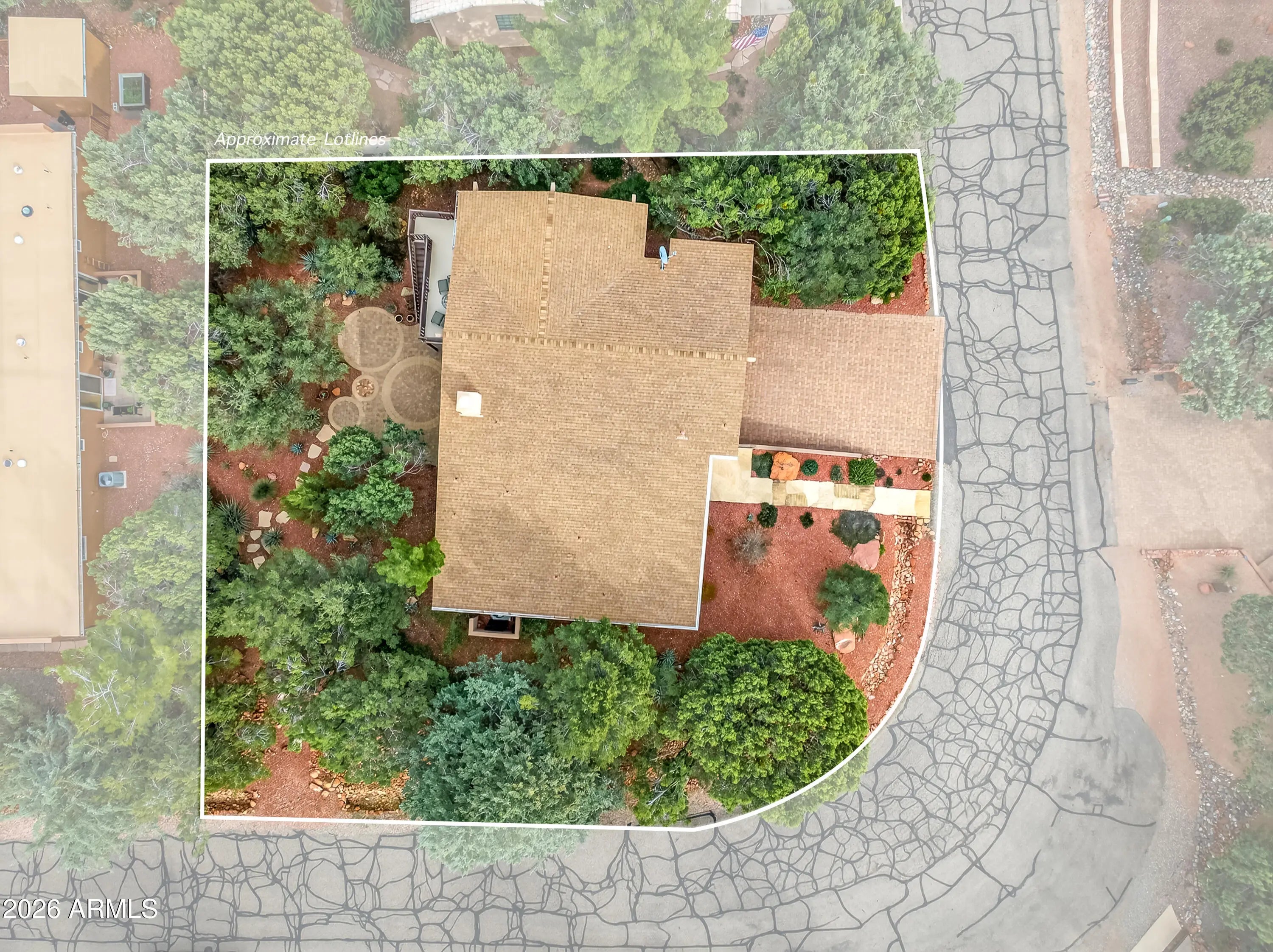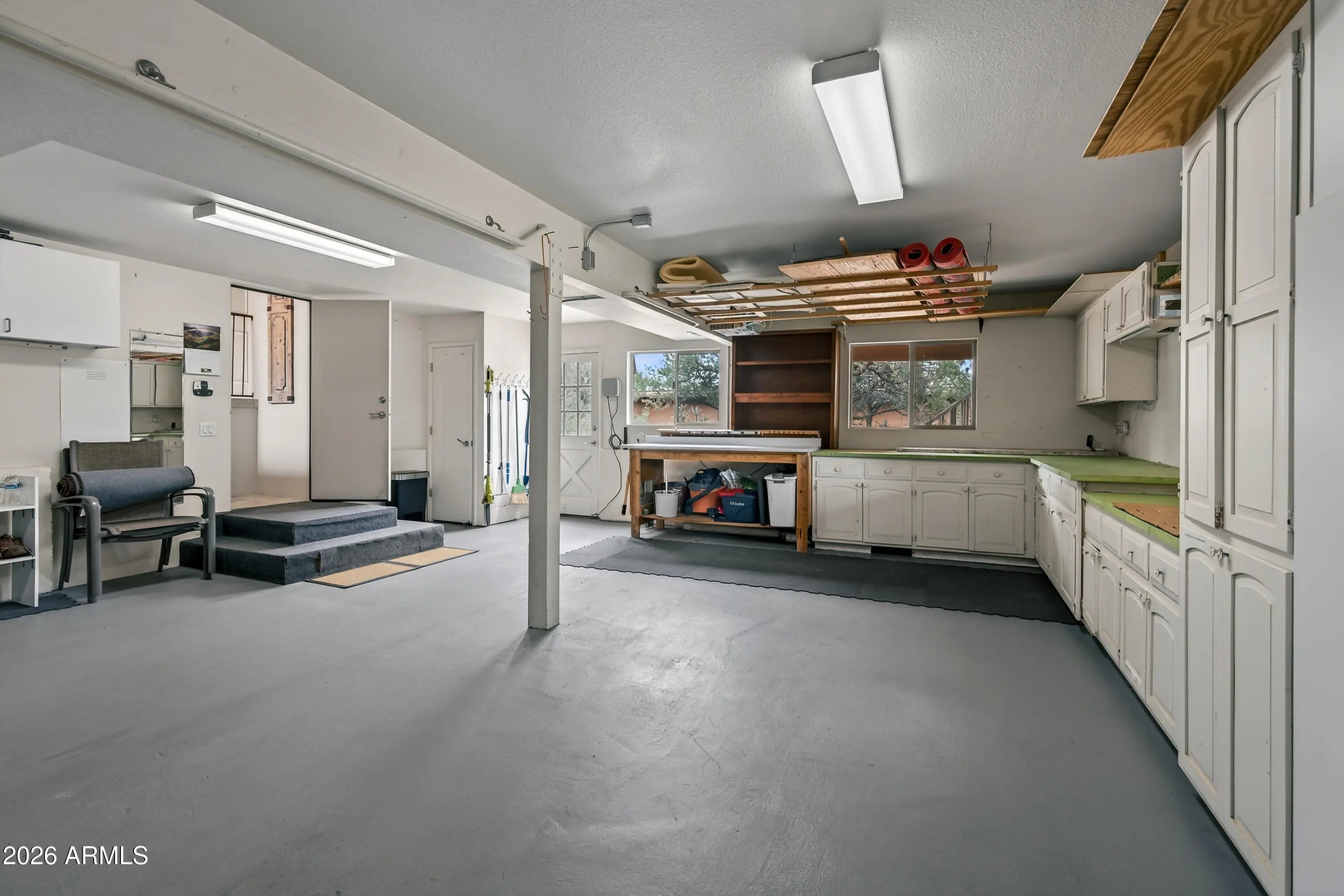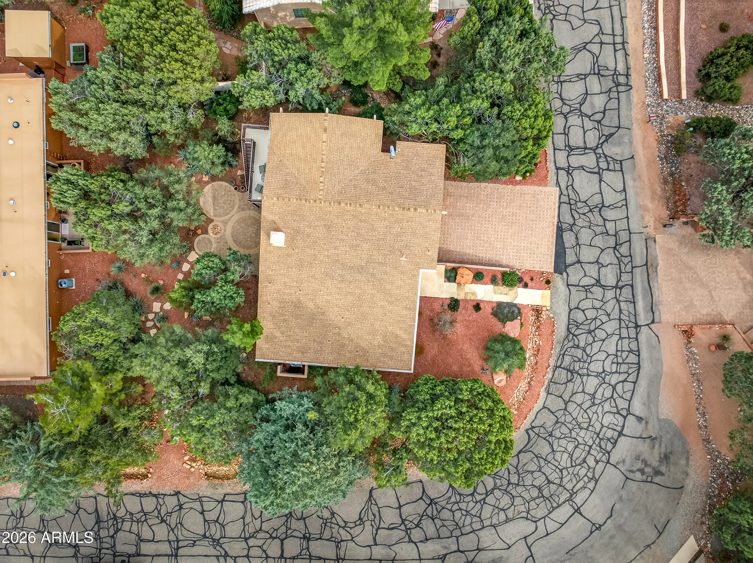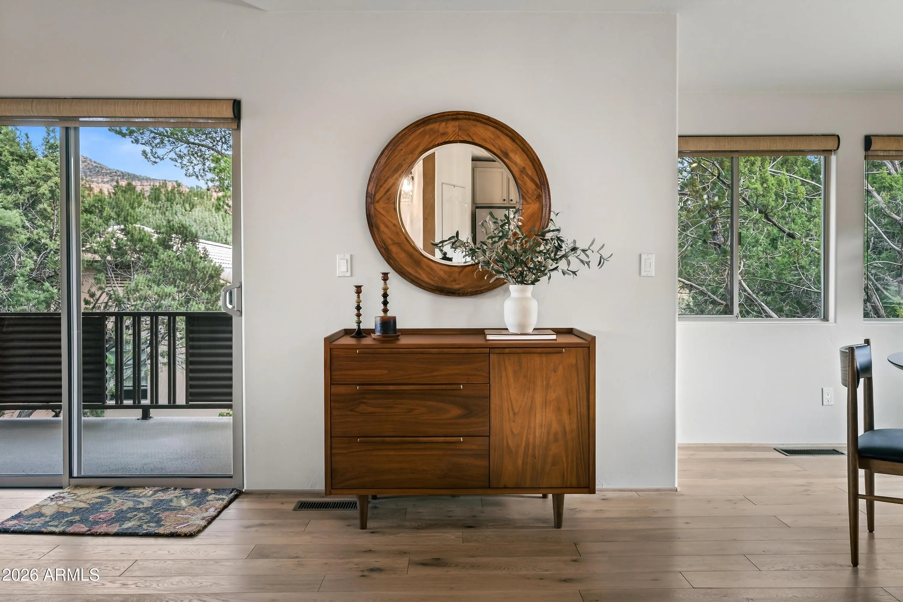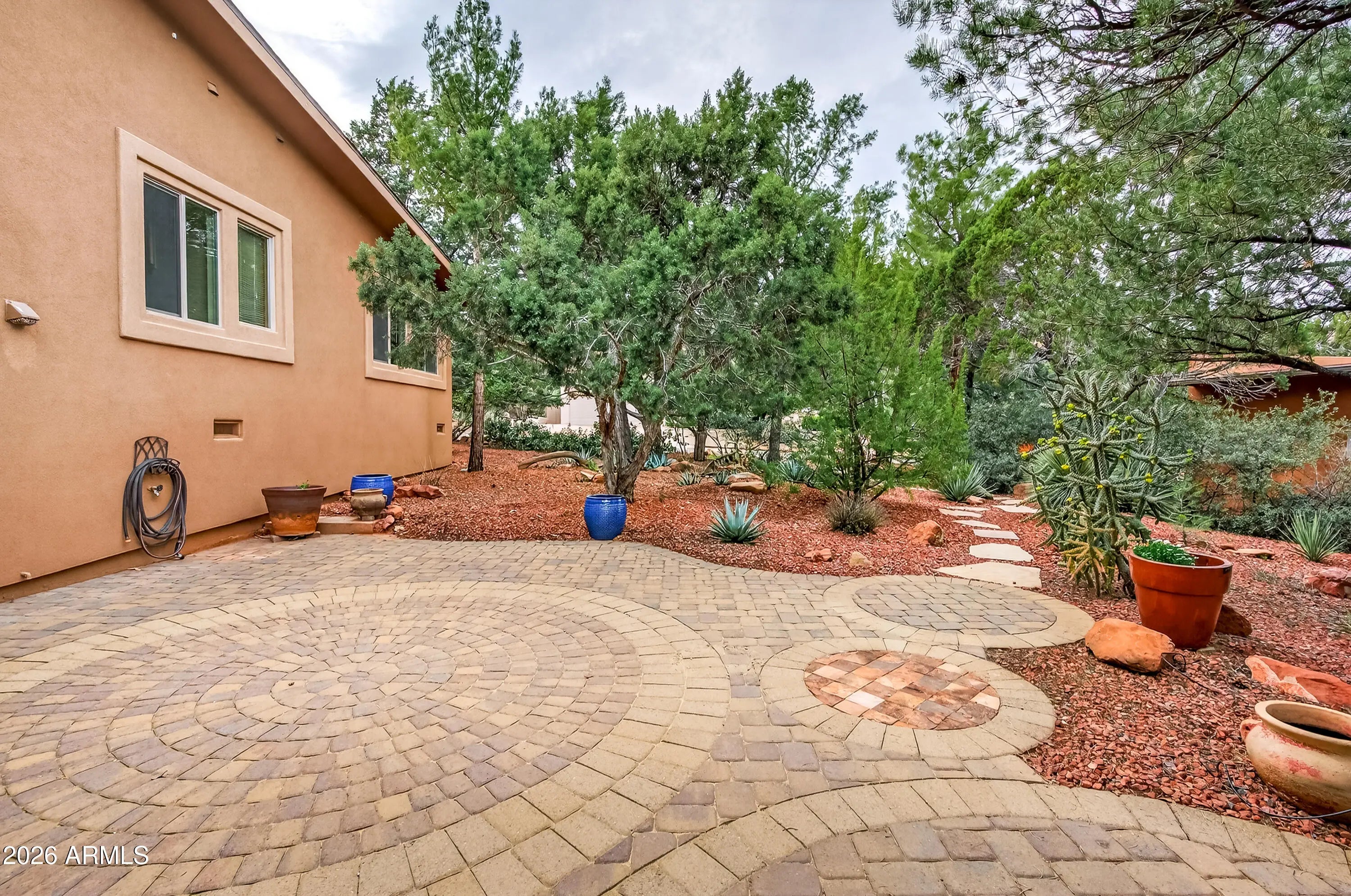 Newly remodeled ''Treehouse'' home with direct Red Rock views and an oversized 4 car garage. Immaculately maintained home nestled between the Juniper and Pinon pine trees with modern upgrades including kitchen (quartzite countertops, stainless appliances) white oak flooring, and backyard paver patio with landscaping. Modern open floorplan home with loads of natural light and lots of windows to admire the changing light conditions upon the nearby red rocks. Located in the Village of Oak Creek just a block or two away from National Forest trail system for endless options for hiking, mountain biking and exploring. Nearby trail spotlight: Transept, Baldwin, and the Turkey Tank system. Lower level garage has 2 bays but is deep enough for 4 cars or 2 cars + large workshop/ home gym/ studio. Complete renovation in 2009, but current owner completed a kitchen update in 2022 including: Taj Mahal quartzite countertops, Stainless appliances, double oven, kitchen sink,both overhead and under cabinet lighting, white oak engineered flooring. Additional upgrades include a custom art glass room divider with matching railing and backyard paver lounge area.