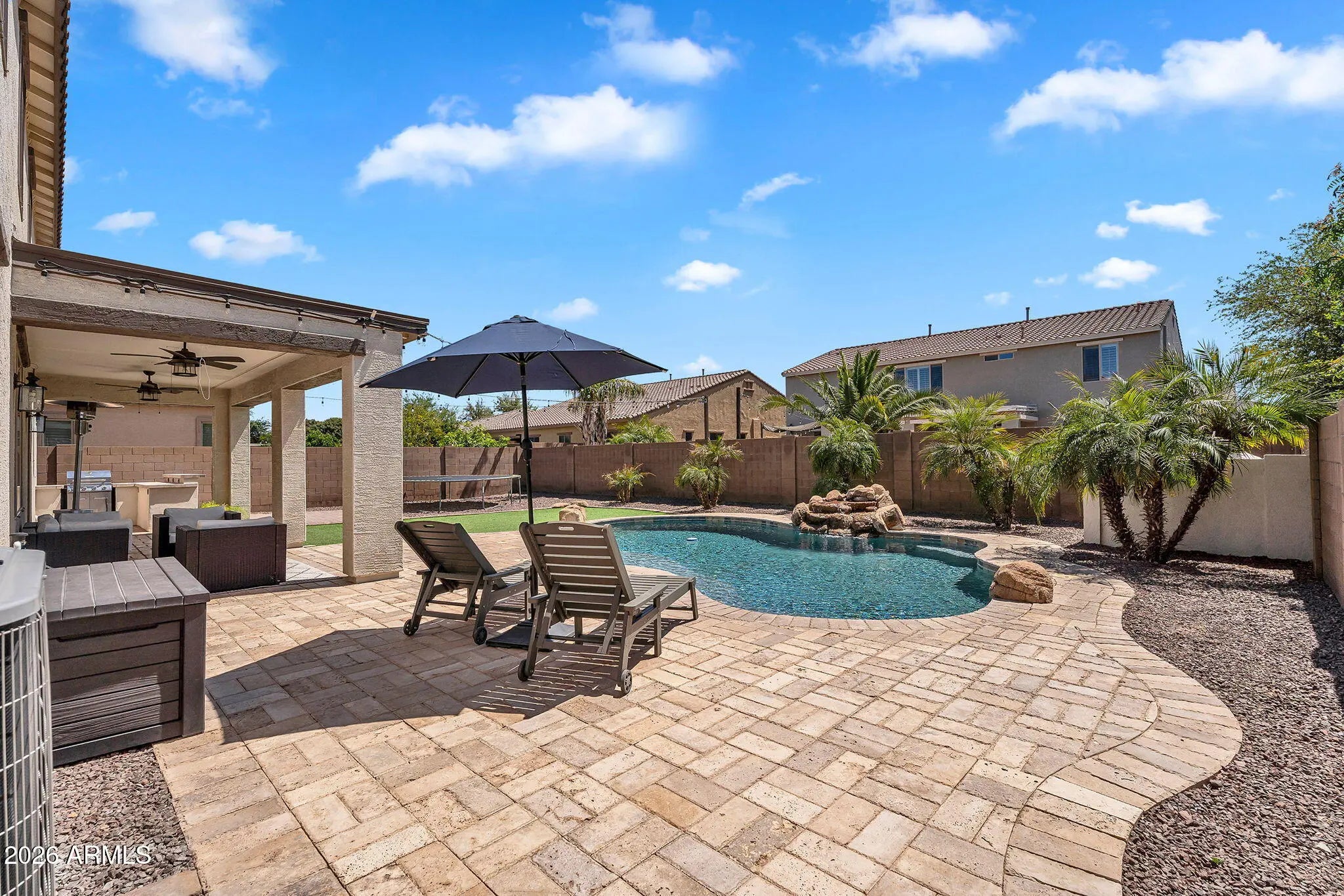 If space, upgrades, and a backyard made for Arizona living are on your list, this one delivers. Custom touches throughout include board & batten accent walls, crown molding, framed windows, updated lighting, and glass French doors to the den. The kitchen features upgraded cabinetry, a huge walk-in pantry, RO system, and built-in speakers. The living room's custom entertainment center with electric fireplace adds warmth and style. Downstairs offers a bedroom and den, while upstairs you'll find four additional bedrooms and a massive loft. Outside, enjoy a sparkling pool, built-in BBQ, extended paver patio, and RV gate. New AC in 2022 and new pool pump add peace of mind. With a park just down the cul-de-sac street you have extended room to play.