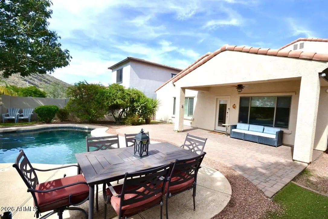 Mountain views steal the show at this Stetson Valley home on a Premium View Lot overlooking a lush greenbelt. The inviting Backyard retreat features a Sparkling Pebble-finish Pool, synthetic turf, multiple seating areas, and View fencing designed to capture the stunning scenery. Inside, the 3-bedroom, 2.5-bath home offers a Versatile front flex space ideal for a Study, Den, Dining, or Formal Living room. The spacious Ground-floor Primary suite provides comfort and convenience. The well-appointed Kitchen includes Granite countertops, Stainless steel appliances, a Walk-in pantry, and a generous Breakfast-bar island. Upstairs, a loft landing with built-in credenza adds flexible living space. Nearby trailheads offer easy access to scenic walking, hiking, and biking. Welcome Home!