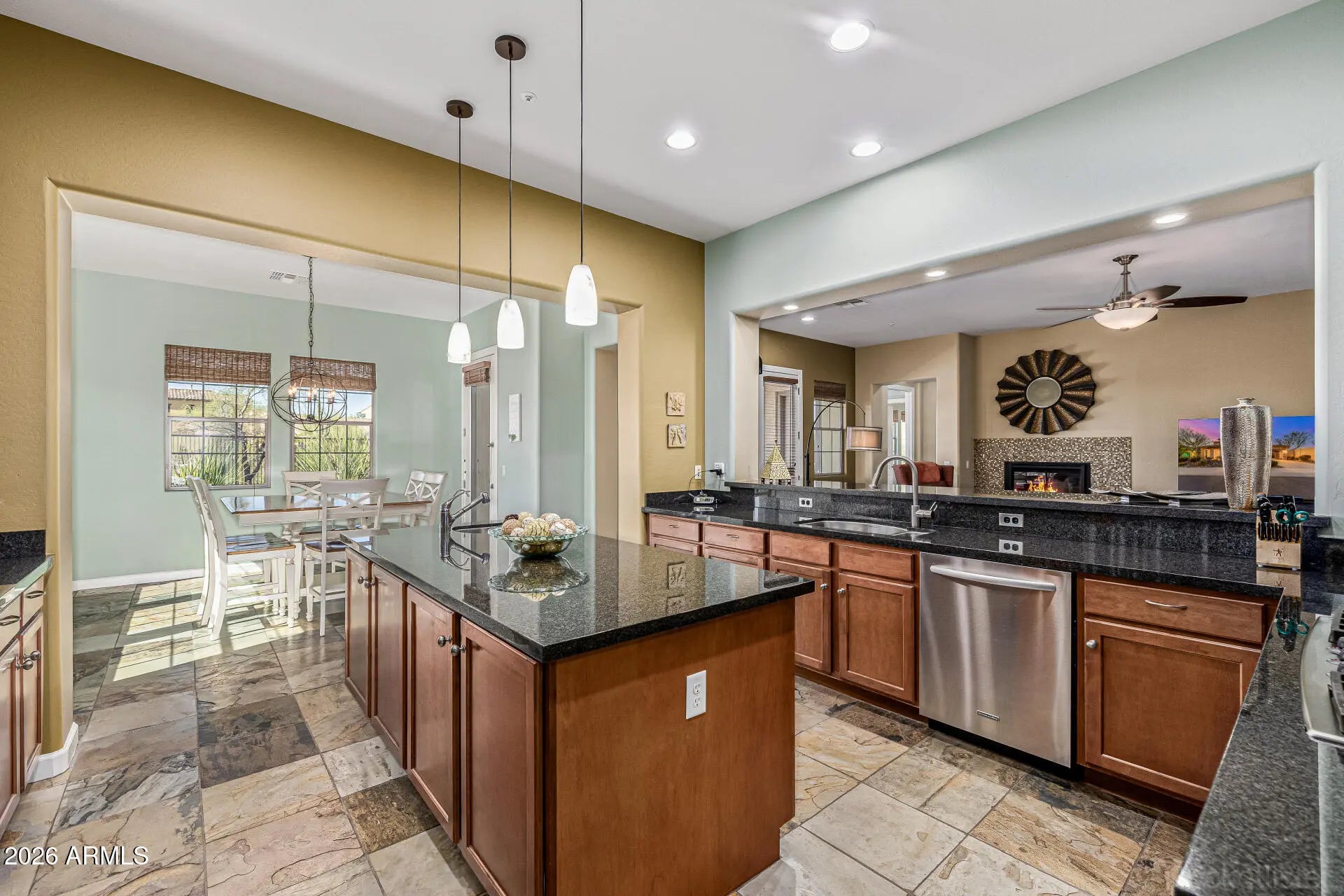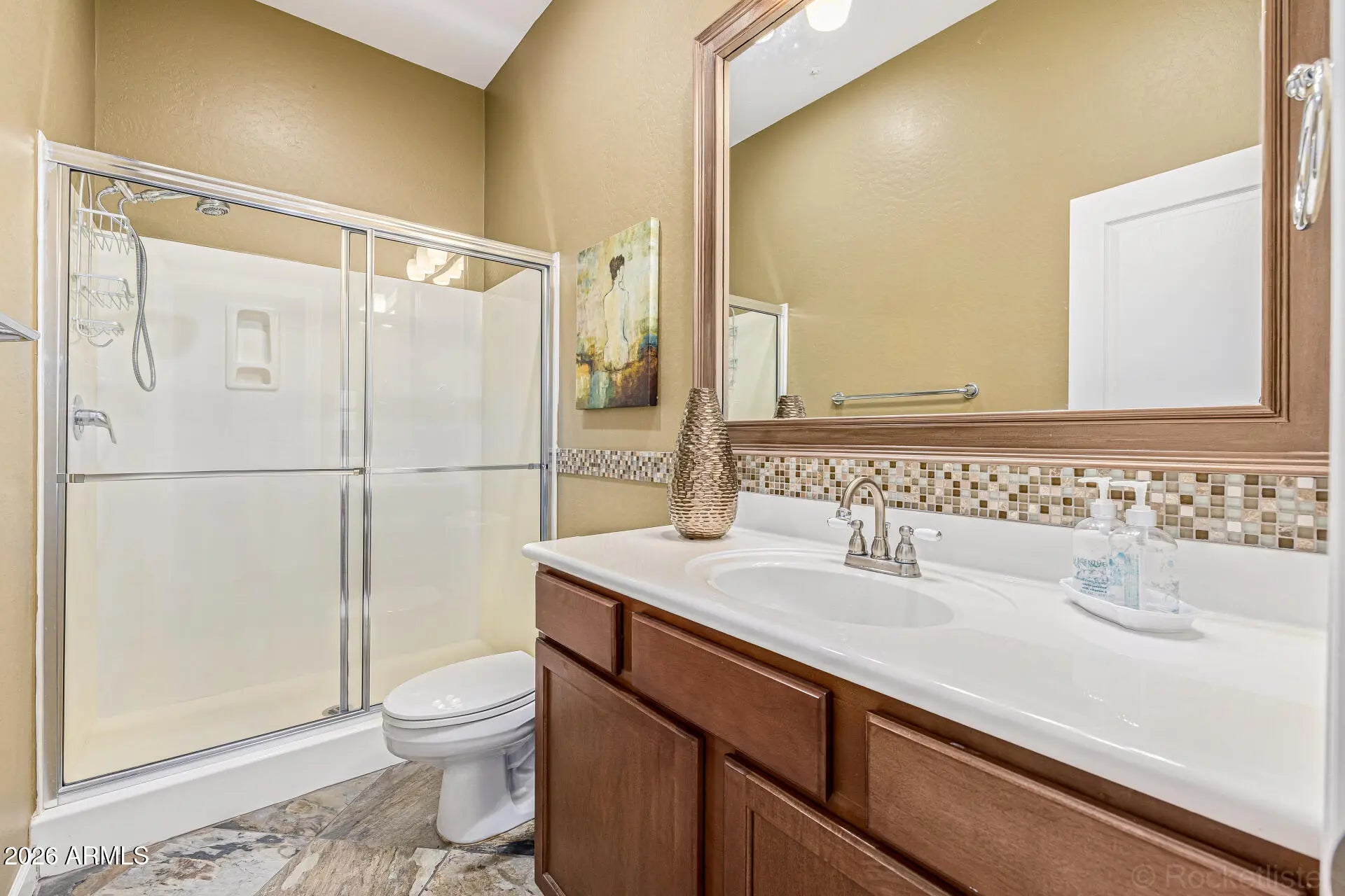 Distinguished CACHET-BUILT ESTATE in the GATED COMMUNITY of Aria at Vistancia, privately positioned at the end of the subdivision on a PREMIUM WASH LOT with breathtaking MOUNTAIN VIEWS and exceptional privacy. Offering 5 BEDROOMS, 4 FULL BATHS, 4,030 sq ft, a private PAVERED COURTYARD, PORTE COCHERE DRIVEWAY, double garage plus separate single garage, and a true resort-style backyard -- this residence stands apart. The striking curb appeal features custom stonework, mature desert landscaping, and a rare porte cochere leading to an expansive EXTENDED DRIVEWAY. Inside, 10-FOOT CEILINGS, 8-FOOT DOORS, upgraded slate tile with inlay design, tray ceilings, and refined architectural finishes showcase the craftsmanship Cachet is known for. This unique CANTATA FLOORPLAN features a MAIN-LEVEL PRIMARY SUITE with 2 ADDITIONAL BEDROOMS & 3 TOTAL FULL BATHS, with great FLEXIBILITY FOR MULTI-GENERATIONAL LIVING all on one floor. The primary en-suite offers a FLEX ROOM, backyard access, SHUTTERS, SURROUND SOUND, and a SPA-INSPIRED BATH with oversized TILED SHOWER, SOAKING TUB, dual vanities, built-in MAKEUP STATION, and a LARGE WALK-IN CLOSET. UPSTAIRS are 4TH & 5TH BEDROOMS, 4TH FULL BATHROOM WITH DOUBLE SINKS, a generous LOFT WITH BUILT-INS, and SURROUND SOUND provide flexibility for family, friends & guests. The CHEF'S KITCHEN is both elegant and functional, featuring GRANITE COUNTERTOPS, decorative slate backsplash, GE Profile 5-BURNER GAS COOKTOP, new microwave and refrigerator, stainless steel appliances, OVERSIZED ISLAND WITH A PREP SINK and dual-sided storage, and a sunlit breakfast room. The great room, anchored by a TILED GAS FIRPLACE, opens through three sets of patio doors to both the courtyard and backyard -- creating seamless indoor-outdoor living. The thoughtfully designed layout also includes a private DEN WITH DOUBLE DOORS, formal dining room with tray ceiling, BUTLER'S PANTRY, and extra built-in cabinetry throughout. The backyard is designed for elevated entertaining: " PEBBLE-TEC POOL & SPA with custom turtle tile inlay " Spacious BAJA SHELF / SPLASH PAD with additional seating areas around the pool " ROCK WATERFALL " New pool heater and pump " WiFi-controlled pool system " EXTENDED TRAVERTINE DECKING " BUILT-IN BBQ ISLAND with side burner " PERGOLA dining area " VIEW FENCE BACKING TO NATURAL WASH " Critter fencing for added protection Additional enhancements include EPOXY-COATED MAIN GARAGE FLOOR, interlocking tile and workbench in single garage, garage cabinetry, new high-quality WATER SOFTENER, upgraded irrigation system, SECURITY GATES, alarm system, SURROUND SOUND IN MULTIPLE ROOMS, LAUNDRY ROOM WITH SINK & STORAGE, and WiFi-controlled exterior lighting. A rare opportunity to own a private, architecturally distinctive estate in one of Vistancia's most coveted gated enclaves.The community of Vistancia is a master-planned development that includes beautiful homes, parks, pools & hiking trails, award winning community centers & golf courses, commercial & retail shops, along with incredible rolling hills & desert landscape all around! The future 320-acre 5 North at Vistancia commercial core is coming soon, home to the new ALA K-12 charter school. Vistancia has ranked as the #1 Master Planned Community in AZ for 13 years in a row (2013-2025)! Resort-style living at its best. Come & see why!