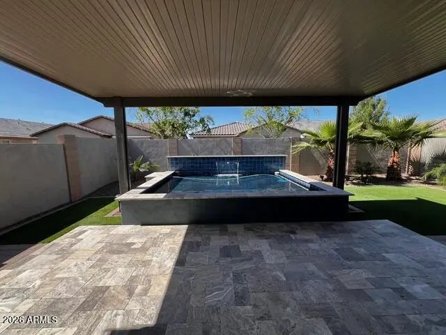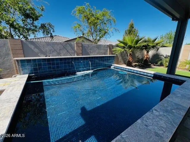 FANTASTIC home in desirable 55+ Encore at Eastmark. Many upgrades including Luxury Vinyl Plank flooring throughout, built-in counter/storage with beverage/wine fridge off garage entry, and built-in wall cabinetry in den/office and great room. Front entry iron locking gate for privacy. Versatile split bedroom floor plan with large owner's suite. Upgraded kitchen cabinets, granite countertops and spacious kitchen island. 8' interior doors, R/O and water softener. Backyard is tastefully designed with solid cover pergola, custom built-ins for grill, mini fridge and extra storage. Spool size water feature is perfect for cooling off on a warm summer day! Enjoy tranquil Arizona sunsets in low maintenance backyard with palms, artificial turf and travertine covered patio. Garage has epoxy floor, bump out area for storage with sink, and built-in cabinets. Encore has various amenities including workout facility, art classes, Proving Grounds Cafe, pickleball, tennis, bocci ball and social events year round.