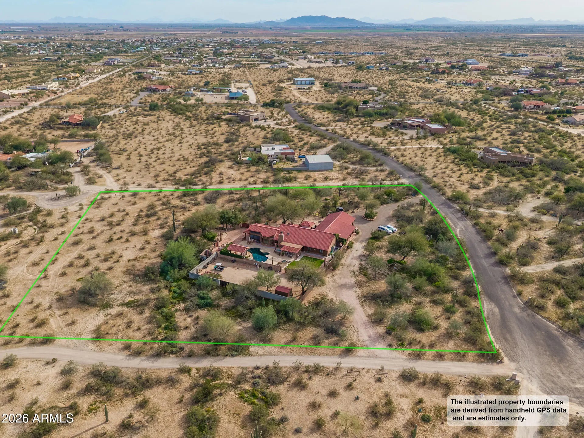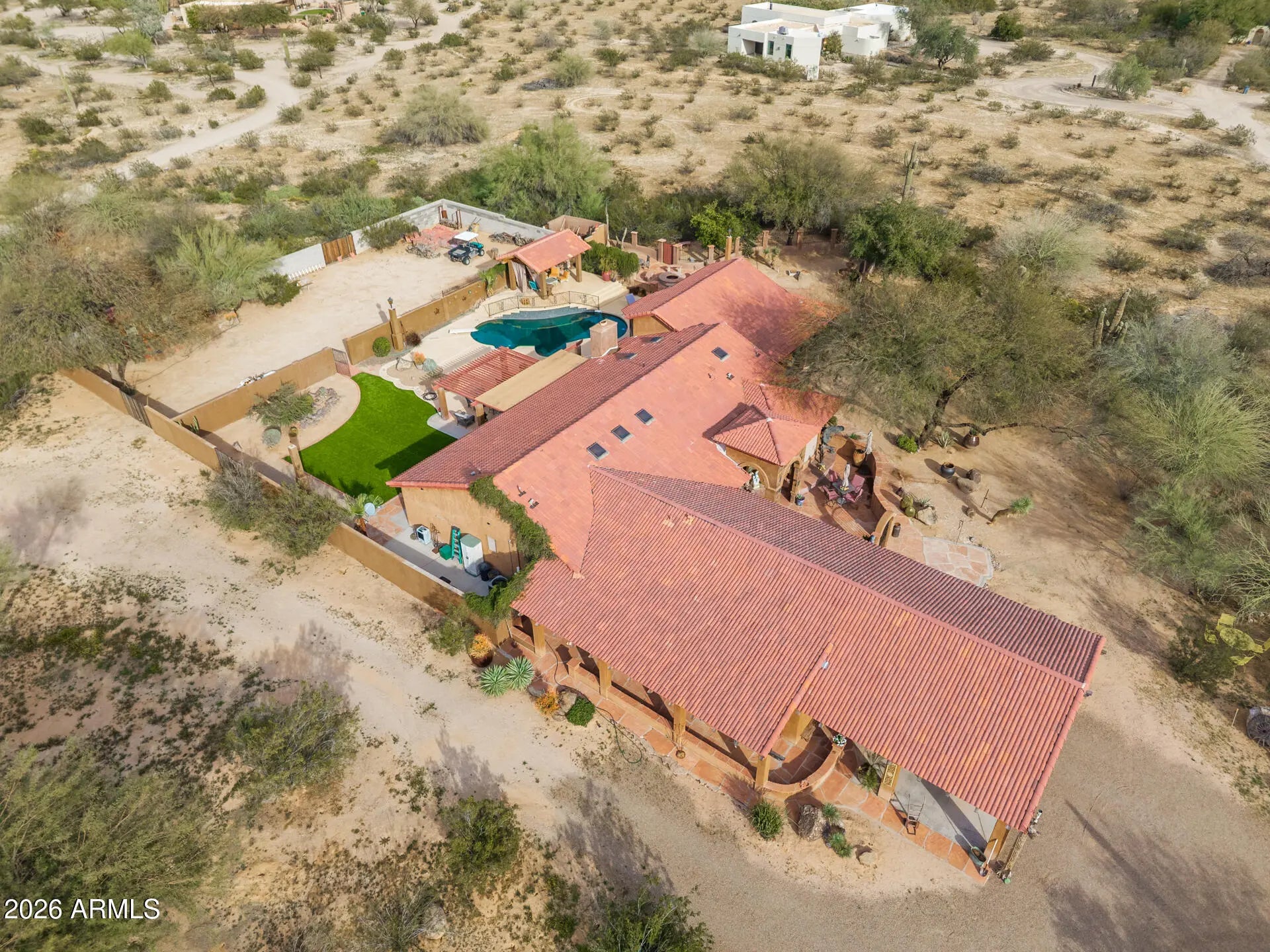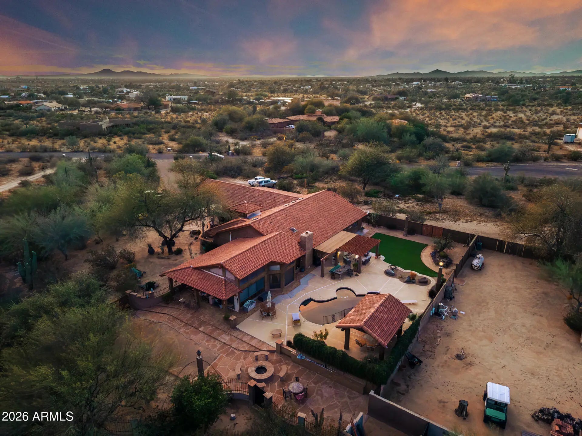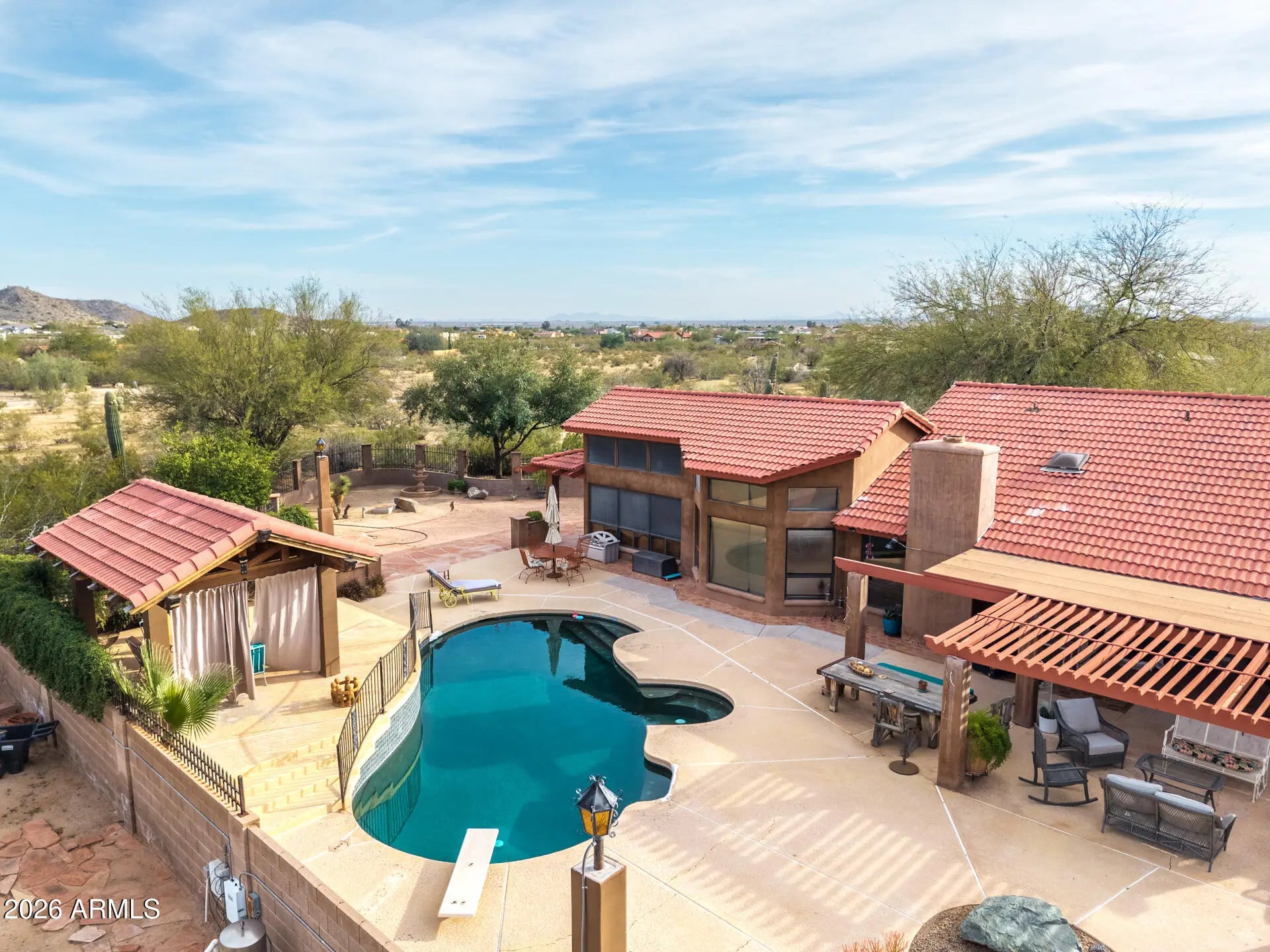 Experience luxury desert living with space, privacy, and breathtaking mountain views on 3.7 acres of pristine land. This stunning 4-bedroom split floor plan estate is designed for both comfort and functionality, offering expansive living spaces and exceptional natural light through beautiful windows and skylights. The spacious primary suite is a true retreat, featuring a bonus flex room perfect for a dream walk-in closet, private office, fitness studio, or relaxation space. The home includes three full bathrooms with high-end countertops and premium finishes, creating a spa-like feel throughout. A large laundry room with abundant storage adds everyday convenience. Step outside into your private resort-style backyard designed for entertaining and relaxation. Enjoy a diving pool, covered patios, and a raised gazebo overlooking the pool, along with a cozy fire pit and covered seating areas perfect for Arizona evenings. The property also features a second fully fenced yard ideal for equipment, storage, or workshop space, complete with pass-through RV gates for easy access. Wrap-around covered patio seating allows you to enjoy the outdoors at any time of day--whether taking in spectacular sunrises, vibrant desert sunsets, or the peaceful mountain views surrounding the property. This rare estate offers the perfect blend of luxury, land, privacy, and panoramic desert scenery, making it an exceptional opportunity for those seeking elevated Arizona living.