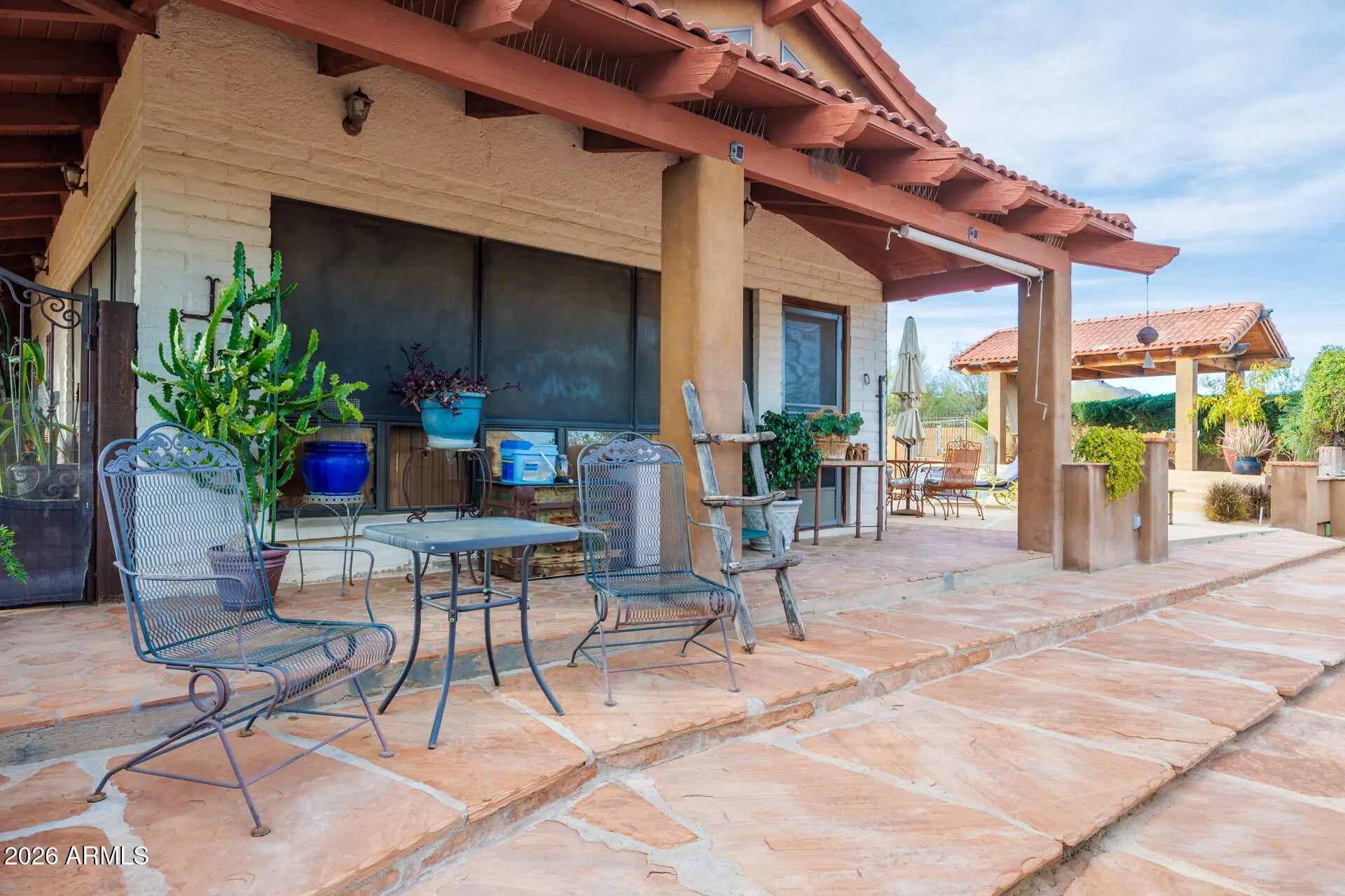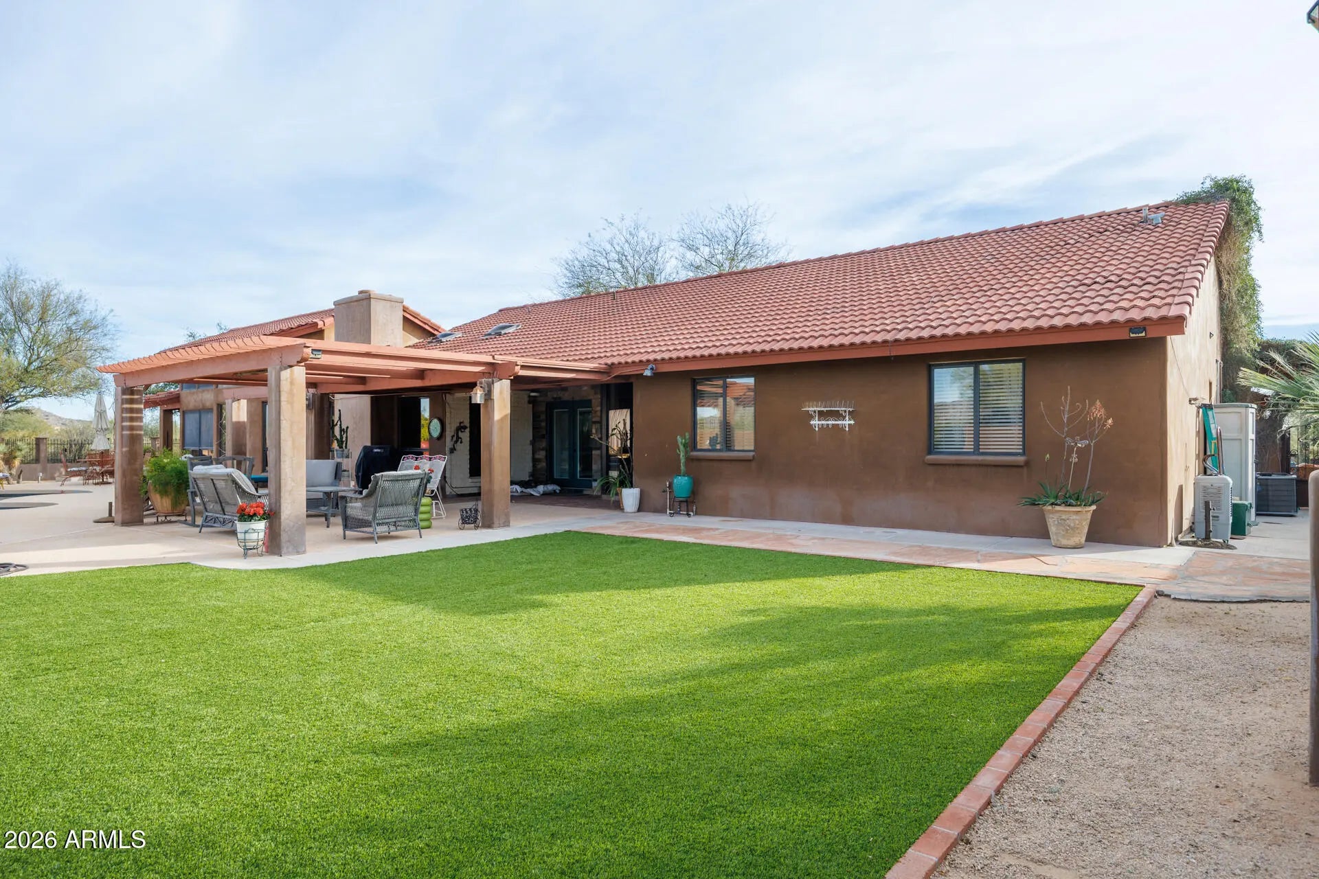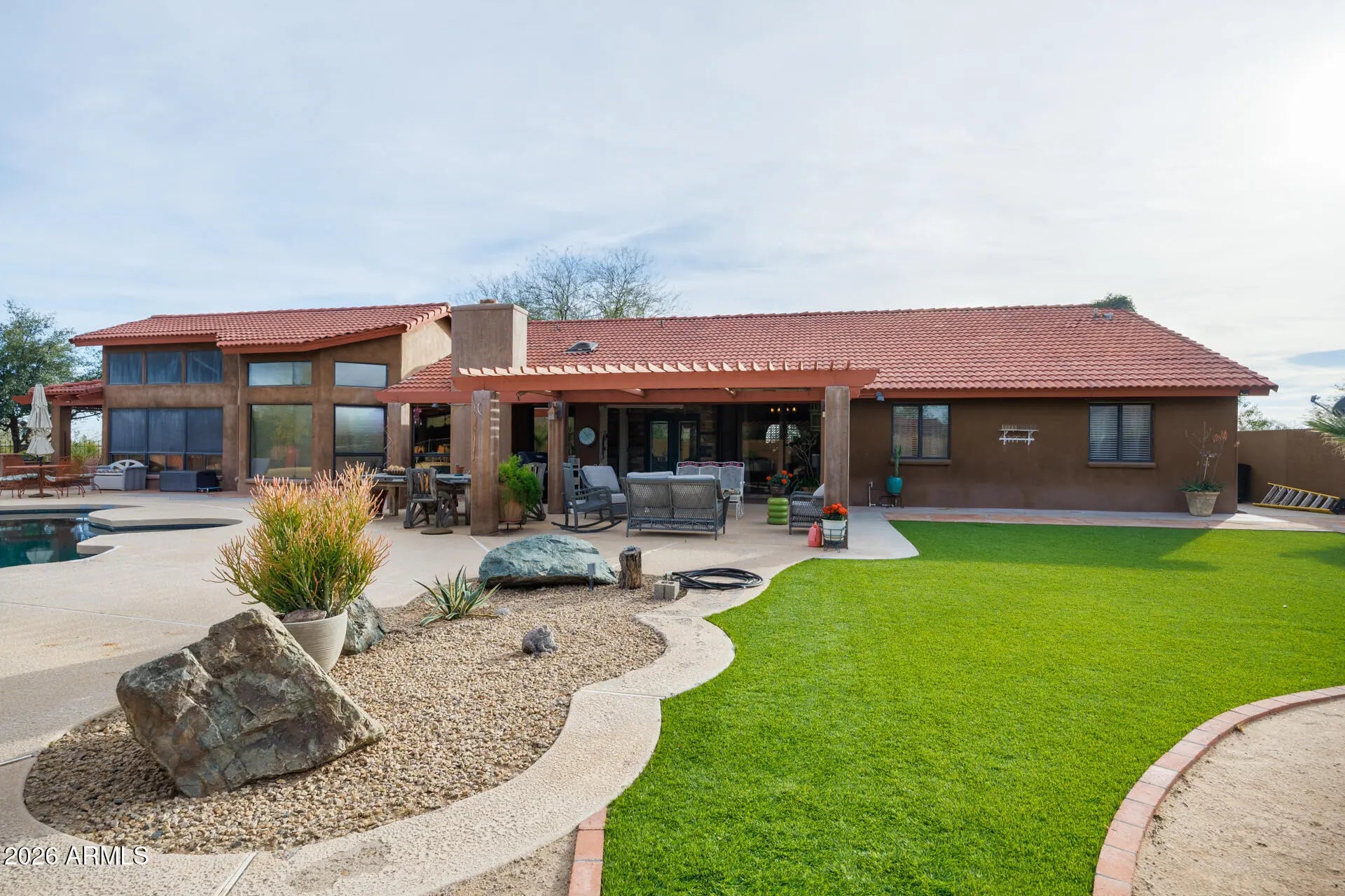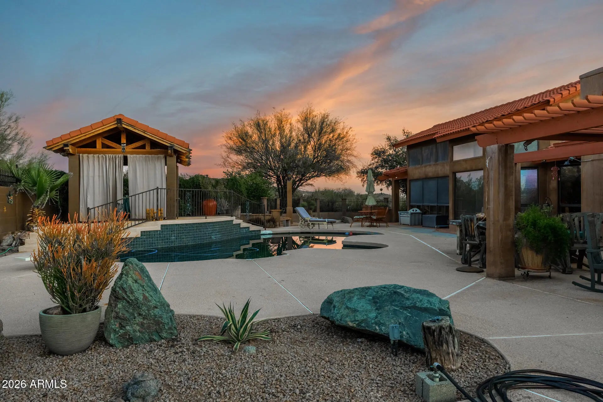 Experience luxury desert living with space, privacy, and breathtaking mountain views on 3.7 acres of pristine land. This stunning 4-bedroom split floor plan estate is designed for both comfort and functionality, offering expansive living spaces and exceptional natural light through beautiful windows and skylights. The spacious primary suite is a true retreat, featuring a bonus flex room perfect for a dream walk-in closet, private office, fitness studio, or relaxation space. The home includes three full bathrooms with high-end countertops and premium finishes, creating a spa-like feel throughout. A large laundry room with abundant storage adds everyday convenience. Step outside into your private resort-style backyard designed for entertaining and relaxation. Enjoy a diving pool, covered patios, and a raised gazebo overlooking the pool, along with a cozy fire pit and covered seating areas perfect for Arizona evenings. The property also features a second fully fenced yard ideal for equipment, storage, or workshop space, complete with pass-through RV gates for easy access. Wrap-around covered patio seating allows you to enjoy the outdoors at any time of day--whether taking in spectacular sunrises, vibrant desert sunsets, or the peaceful mountain views surrounding the property. This rare estate offers the perfect blend of luxury, land, privacy, and panoramic desert scenery, making it an exceptional opportunity for those seeking elevated Arizona living.