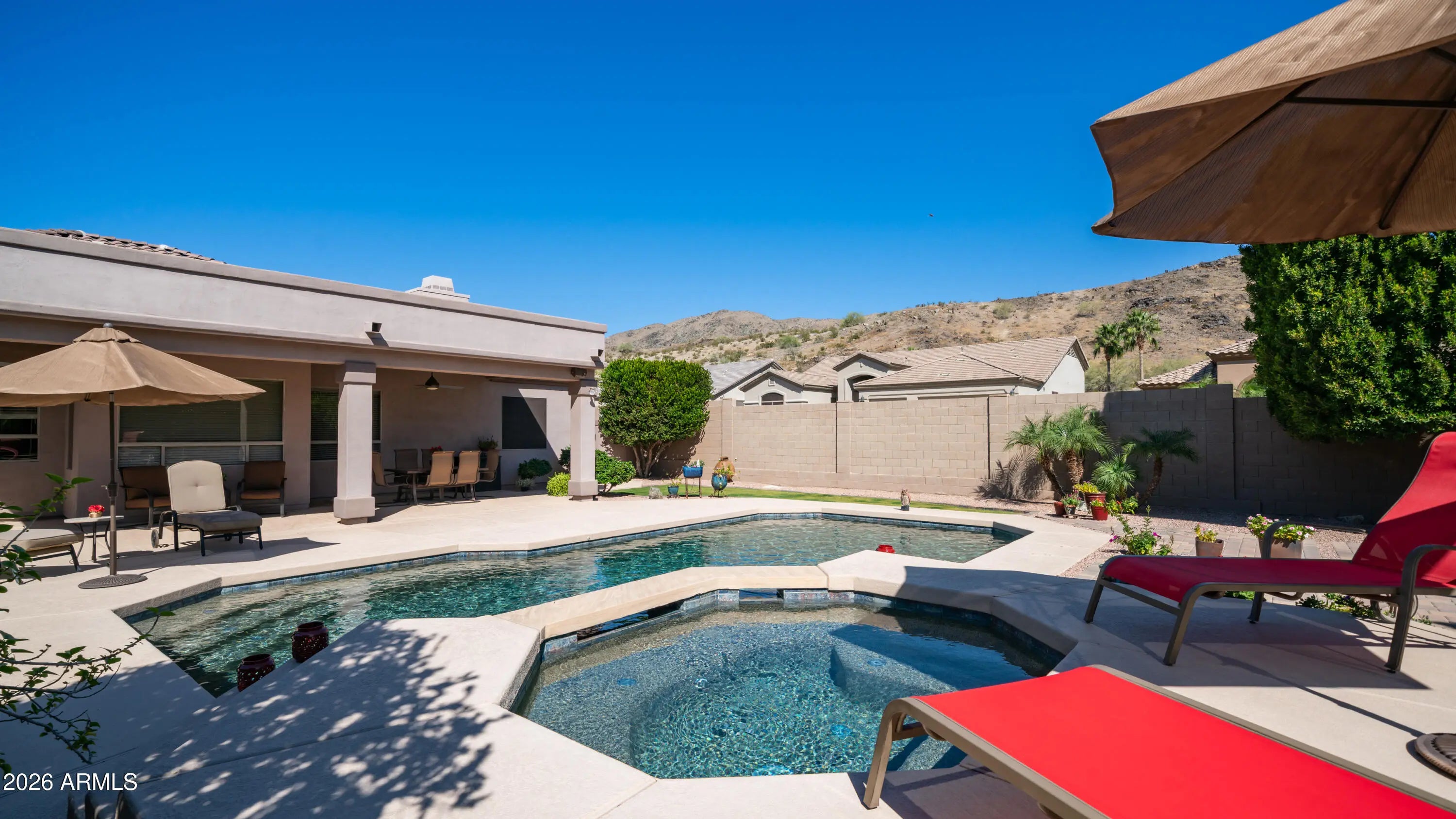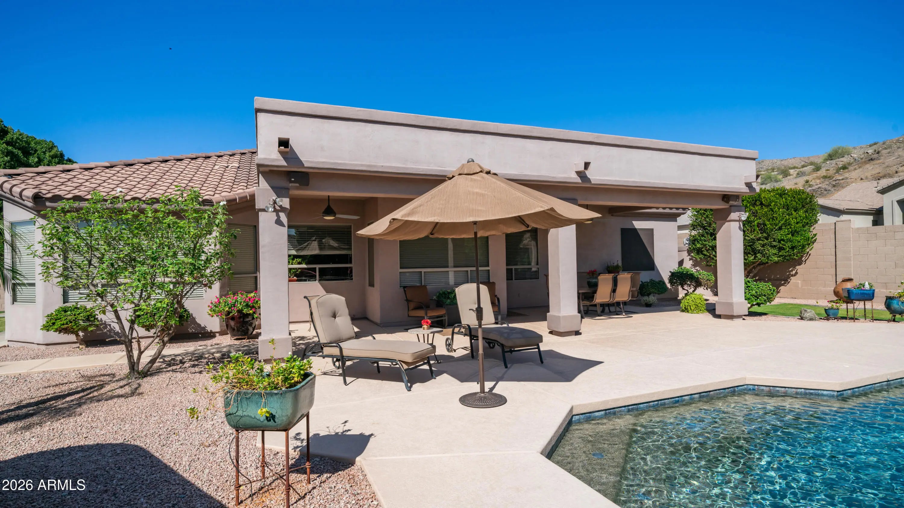 Tucked into the heart of the sought-after Dove Canyon community in the Ahwatukee Foothills Club West, this beautifully maintained single-level residence offers a rare blend of space, privacy, and breathtaking mountain views. Set on an oversized corner lot of approximately 13,841 square feet, the home is surrounded by lush landscaping and serene desert scenery, creating a peaceful retreat designed for both everyday living and effortless entertaining. From the moment you arrive, the extended driveway, RV gate, and striking iron front screen door set a tone of refined quality and thoughtful design. Inside, the desirable Tierra floor plan spans approximately 2,682 square feet and features 10-foot flat ceilings, formal living and dining rooms, and a spacious family room anchored by a warm gas fireplace--ideal for gatherings both large and intimate. The chef's kitchen is the heart of the home, offering granite countertops, abundant cabinetry, a large center island, built-in appliances, and pantry. Whether hosting guests or enjoying quiet mornings, the layout seamlessly connects the kitchen to the main living areas for easy, comfortable living. A dedicated executive office provides flexibility for work-from-home or study, while the split primary suite offers a private sanctuary with generous proportions, beautiful bay windows that frame views of the backyard, and a well-appointed bath. Two additional bedrooms, a full bath, executive office, and a powder room complete the thoughtfully designed interior. Bedroom built in can be removed, it was designed to fit a twin bed and an office space. Outdoor living is where this home truly shines. The expansive covered patio overlooks a private heated pool and spa, framed by manicured landscaping and generous side yard spaces. A pergola creates an inviting setting for outdoor dining and gatherings, while a gas fire pit adds the perfect ambiance for relaxing evenings under the Arizona sky. The backyard also features beautiful real grass, along with a convenient Tuff storage shed for gardening tools and additional outdoor storage, making the space both functional and inviting. Recent updates add long-term value and peace of mind, including a new roof in 2019 and a high-efficiency 16 SEER HVAC system replaced in 2015. Surrounded by majestic mountain backdrops and located within walking distance of South Mountain Park and Preserve trails, this home also benefits from award-winning Kyrene schools and the unmatched lifestyle of the Ahwatukee Foothills--where natural beauty, convenience, and community converge. A rare opportunity to enjoy refined single-level living on an oversized lot in one of Phoenix's most desirable mountain communities. original owner occupied.