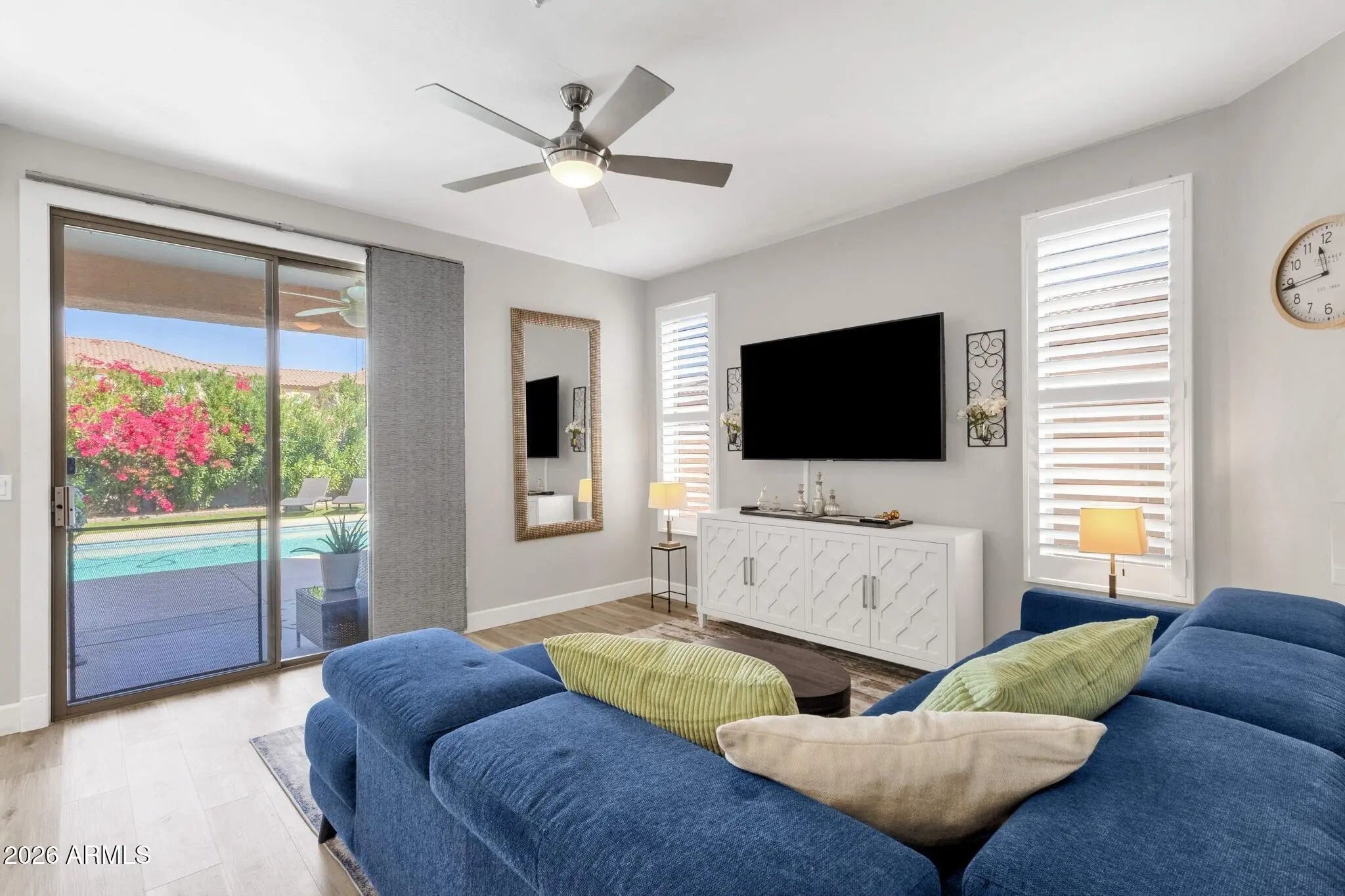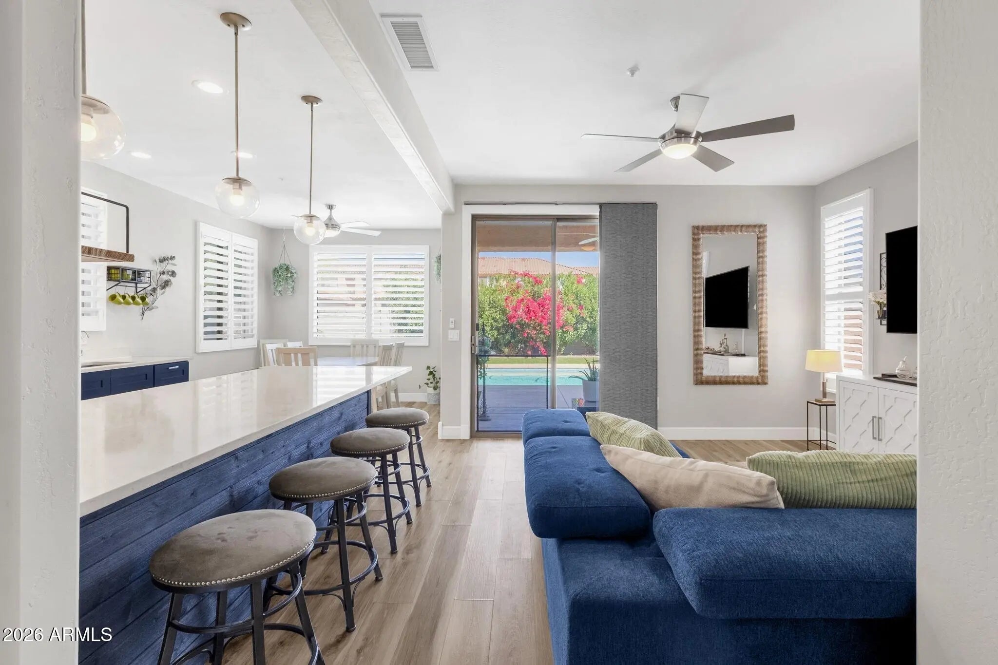 This well-maintained detached duplex offers a rare combination of features, including a private pool, no HOA, and a highly convenient central location. Recent updates include thoughtfully improved backyard spaces, newer flooring, refreshed cabinetry, all new plantation shutters, quartz countertops, and updated bathrooms, creating a bright and inviting interior throughout. The main level offers an open and functional floor plan with an updated kitchen featuring stainless steel appliances, ample cabinetry, updated counters, and breakfast bar seating. The kitchen flows into the formal dining area and living room, where windows overlook the backyard and pool. A versatile flex room on the main level can easily serve as a fourth bedroom, office, or den. This level also includes a convenient half bath and an in-unit laundry room with utility sink. Upstairs, the primary bedroom offers a private covered balcony overlooking the pool, creating a relaxing retreat. The ensuite bath includes a dual vanity, soaking tub, separate shower, and private water closet. Two additional bedrooms and a hall bath with matching dual vanity provide comfortable accommodations for family or guests. The private backyard with pool has been nicely updated and includes mature landscaping, turf, a covered patio, and additional seating areas--ideal for outdoor living and entertaining. Additional highlights include an epoxied 2-car garage with extensive built-in cabinetry for storage. Centrally located near Fountain Park and close to shopping, dining, and everyday conveniences, this home offers a hard-to-find combination of updates, a private pool, and no HOA.